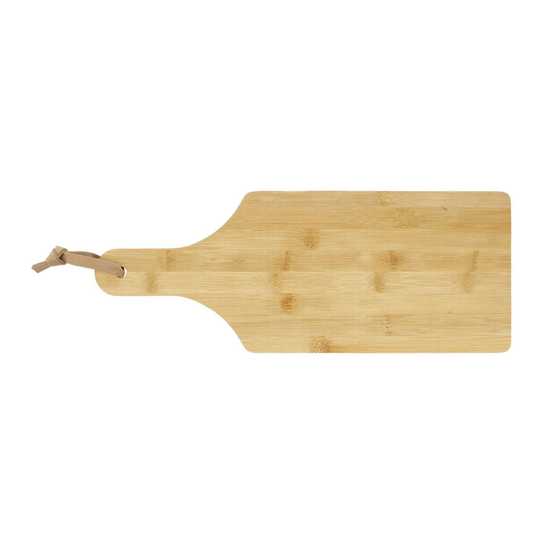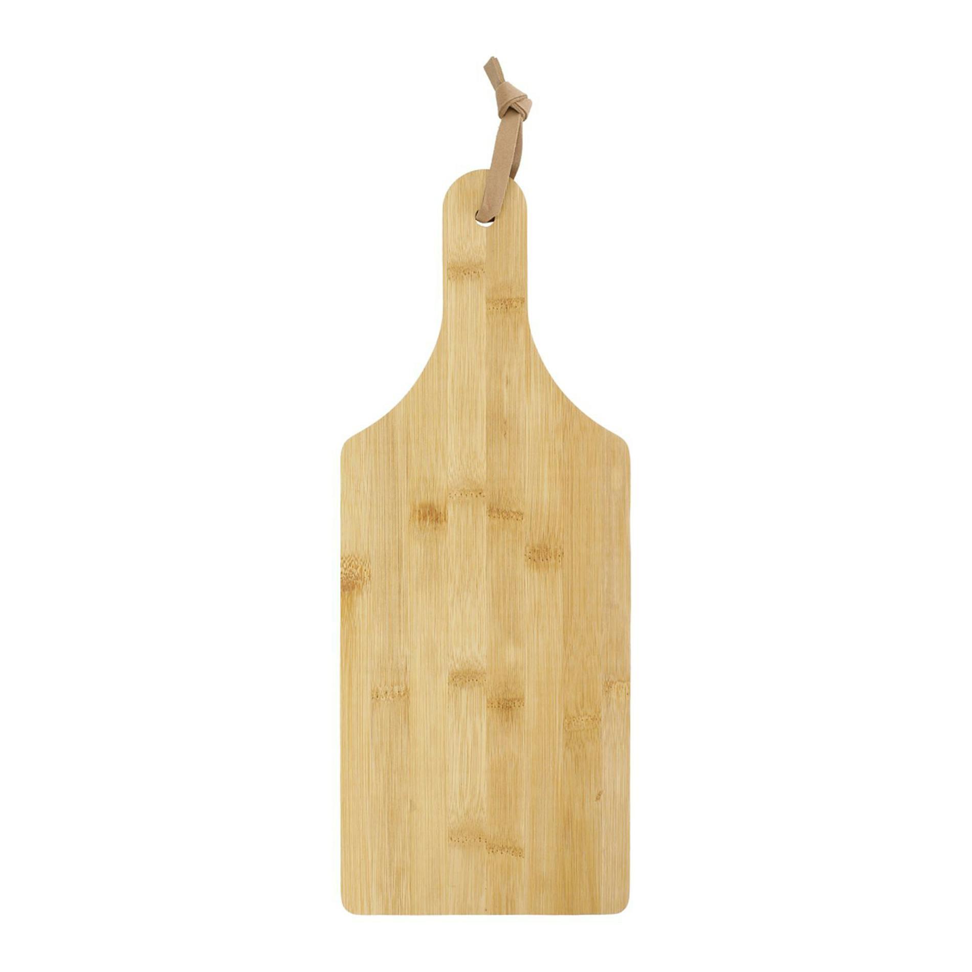 This bamboo cutting board can also double as a serving board. Item measures 14.5" x 5.7". Due to the nature of the bamboo material, variations in laser imprinting quality may occur.