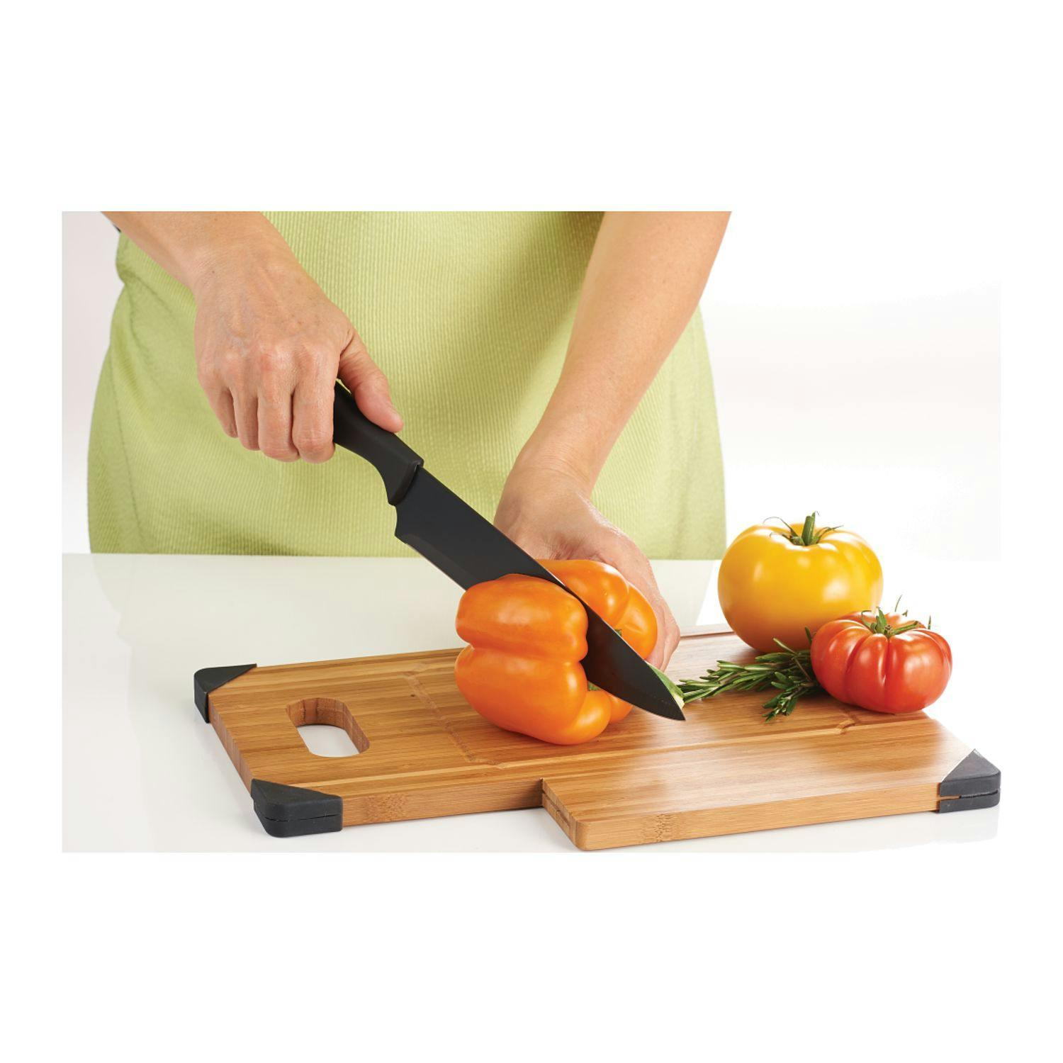 This innovative bamboo cutting board includes a built in carving knife with stainless steel blade and soft touch handle. The cutting board features silicone corner accents to prevent the board from slipping as well as a swivel stand to display the board upright. Cutting board measures 13.39" x 9.21". Due to the nature of the bamboo material, variations in color and imprint may occur.