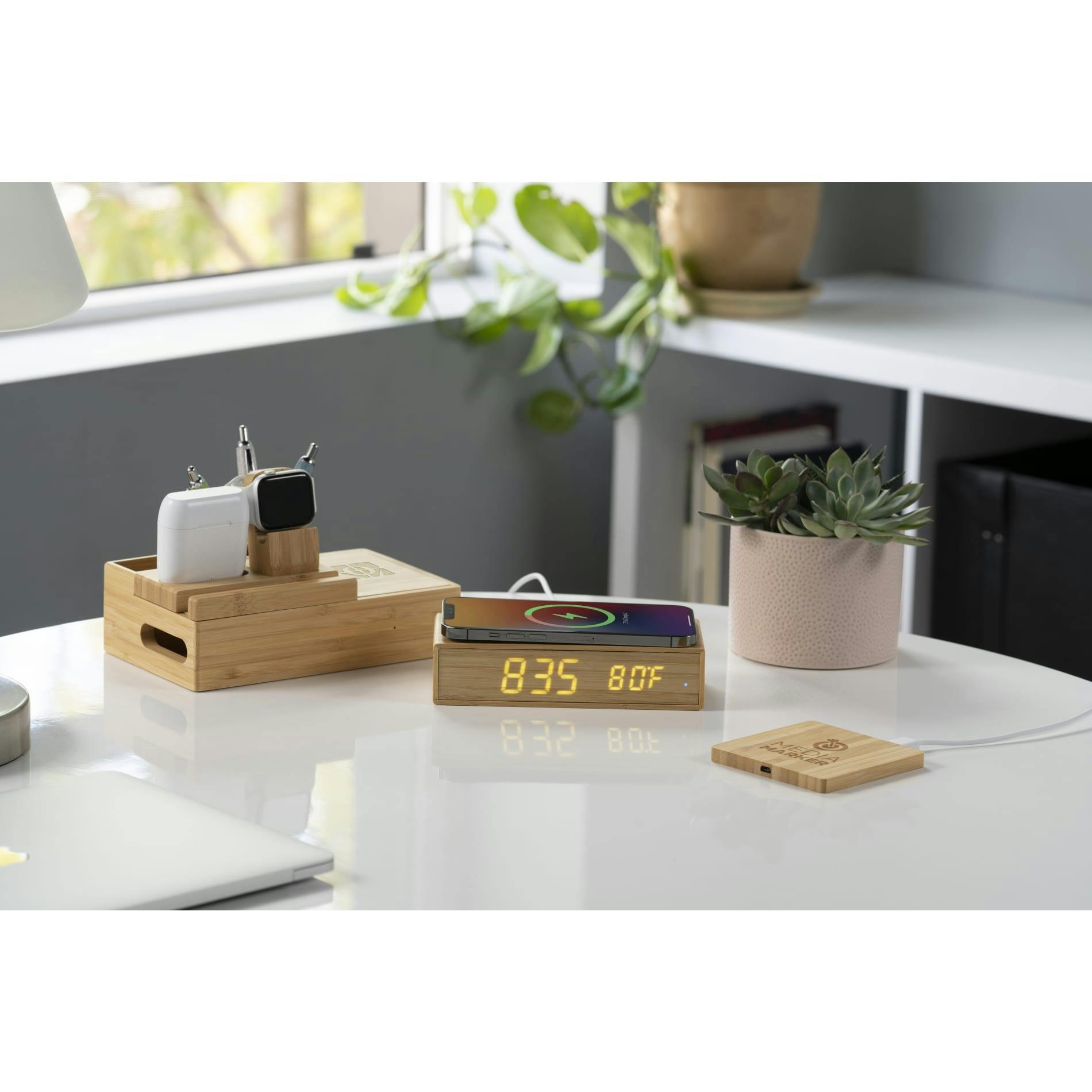 Bamboo Wireless Charging Pad with Dual Outputs blends eco-friendly style and convenience — wirelessly charge Qi-enabled smartphones up to 5W while powering two additional devices via dual USB ports (5V/1.5A max) — charge up to three items at once. Compact and travel-ready, it works through most plastic cases and supports devices including iPhone 8/X/11/12/13 series, Samsung Galaxy Note and S series (Note5–Note9, S6–S9+), and Google Nexus models; older iPhones (pre-iPhone 8) require an external wireless receiver or receiver case. Includes a 39" 3A USB-to-micro charging cable and ships in an FSC-certified premium gift box — ideal for corporate giveaways and sustainable promotional gifts. Note: natural bamboo grain may cause slight variations in laser imprinting.