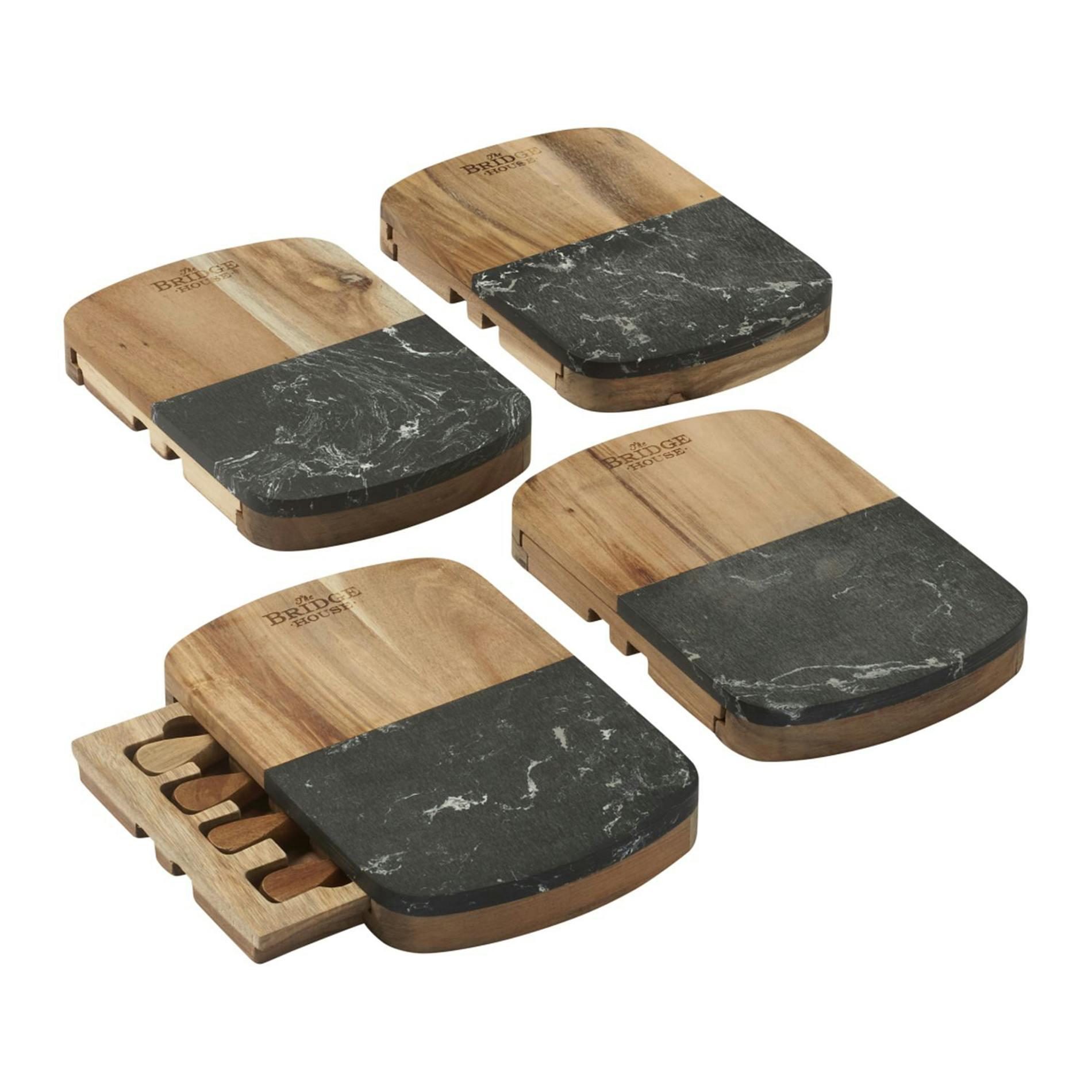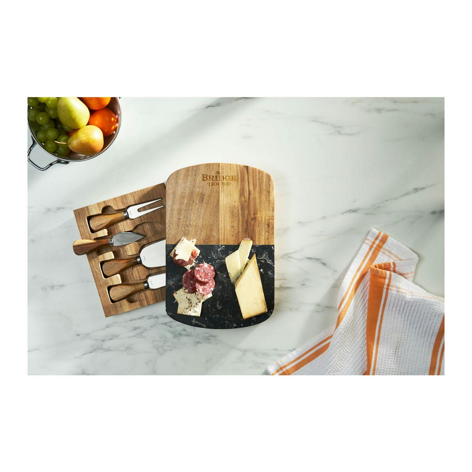 This chic cheese cutting board set is the perfect fit for any home. It is crafted from black marble and acacia wood. Cheese cutting tools easily store in the built in drawer under the cutting board. Due to the nature of the natural material there may be variations in marble pattern and laser engraving. Wood color will have natural variations.