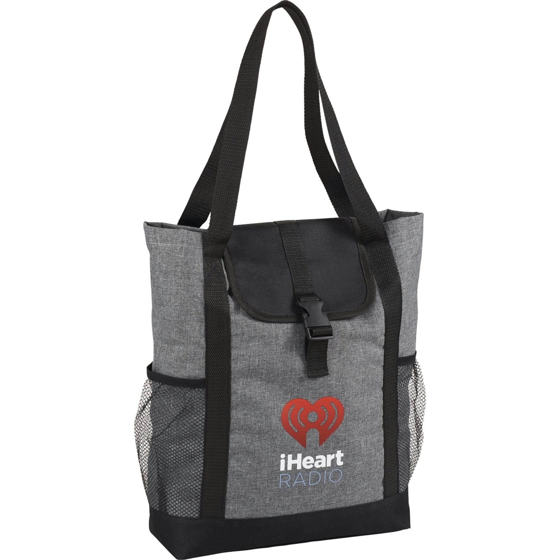 This trendy convention tote is ideal to carry up to a 11" tablet and other accessories. Clip and flap main compartment closure. Mesh pockets on both sides of this tote for added storage. 11" handle drop height. Disclaimer: There may be minor variations in color of the actual product due to the nature of the fabric dyes, weaves and printing.