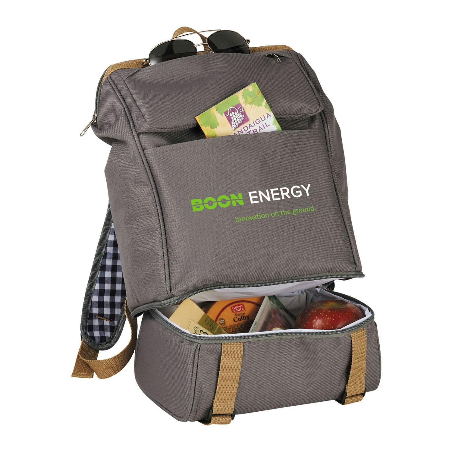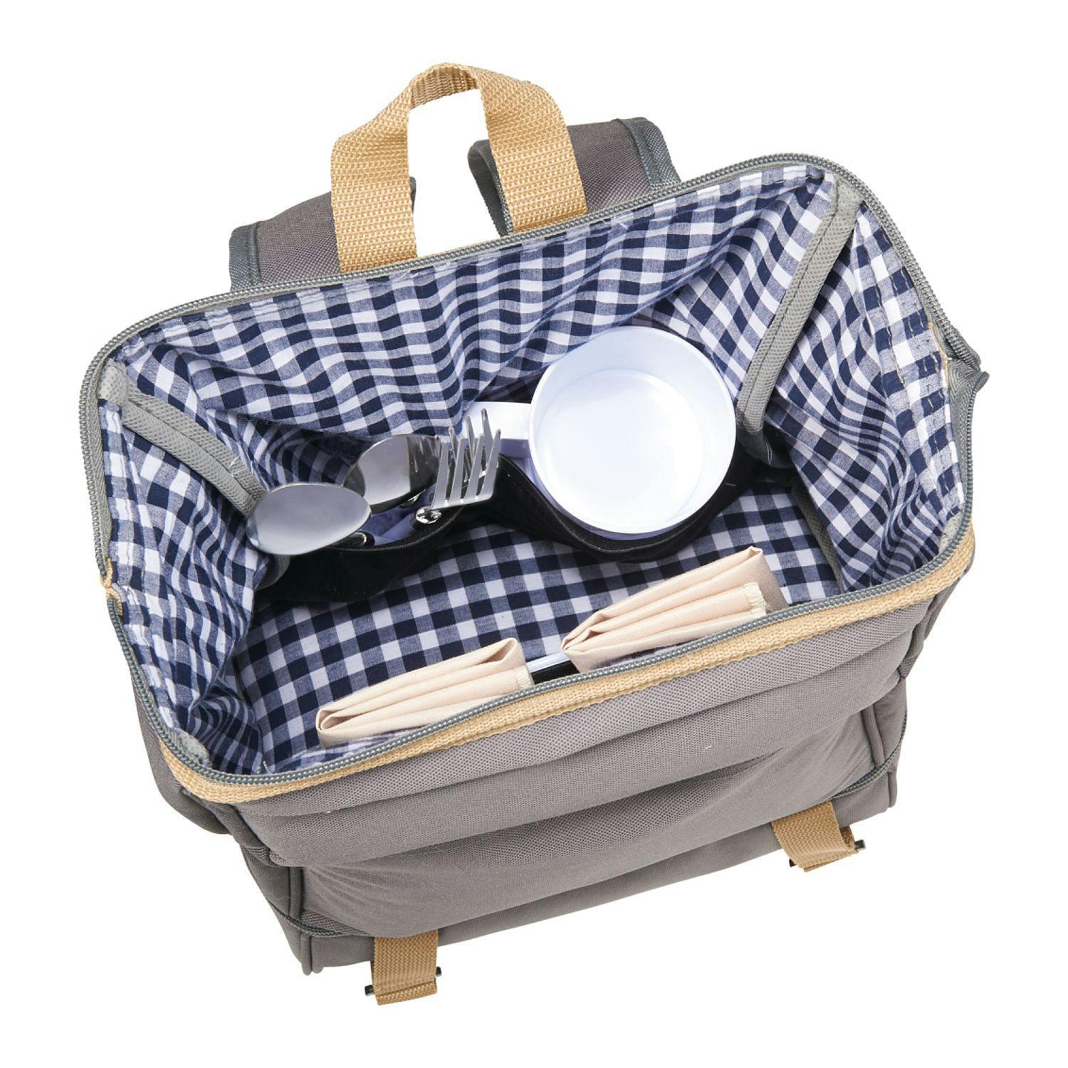Enjoy the great outdoors in style with the 11pc Café Picnic Backpack for Two. The main compartment has a wide opening to easily access the picnic pieces. The separate PEVA insulated cooler storage compartment fits 6 cans. Set includes 2 each: 8” plates, mugs, forks, spoons, and napkins. Perfect for tailgating, a trip to the park, and everything in-between! A great companion piece is the Picnic Blanket (1070-15).