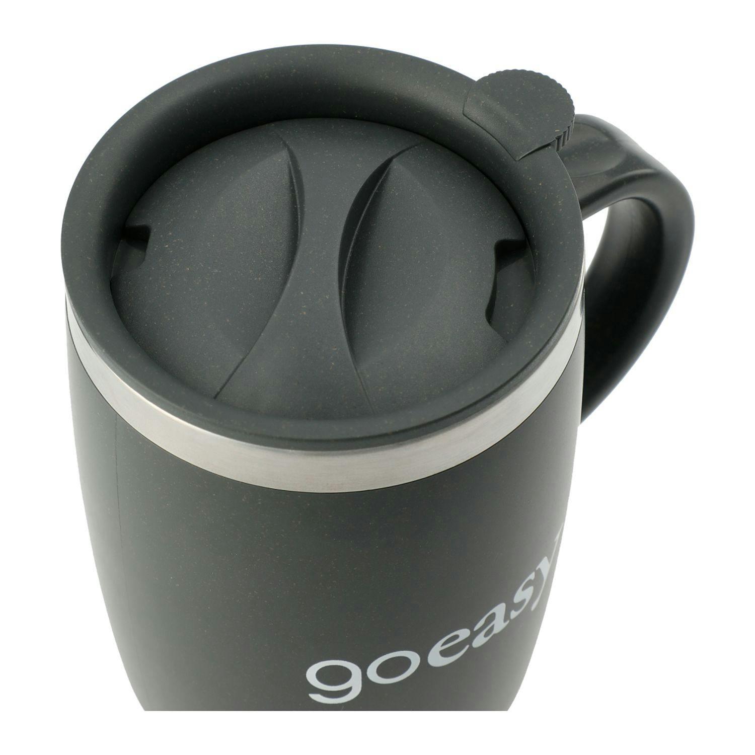 Push-on lid with twist secure closure. This mug offers a double-wall construction with stainless steel liner. Outer wall and lid feature wheat straw mixed with plastic. Fits most K cup coffee machines. 14oz.