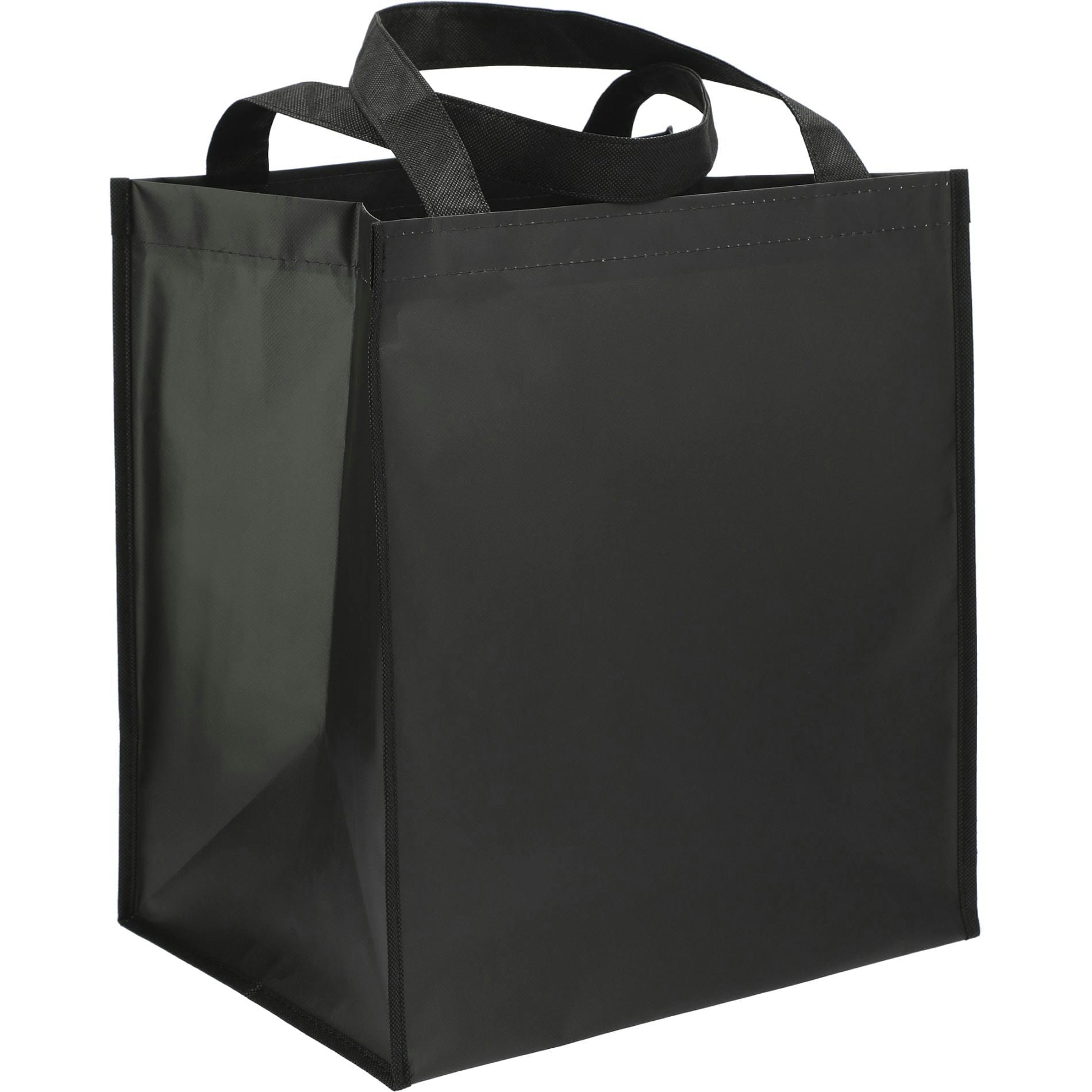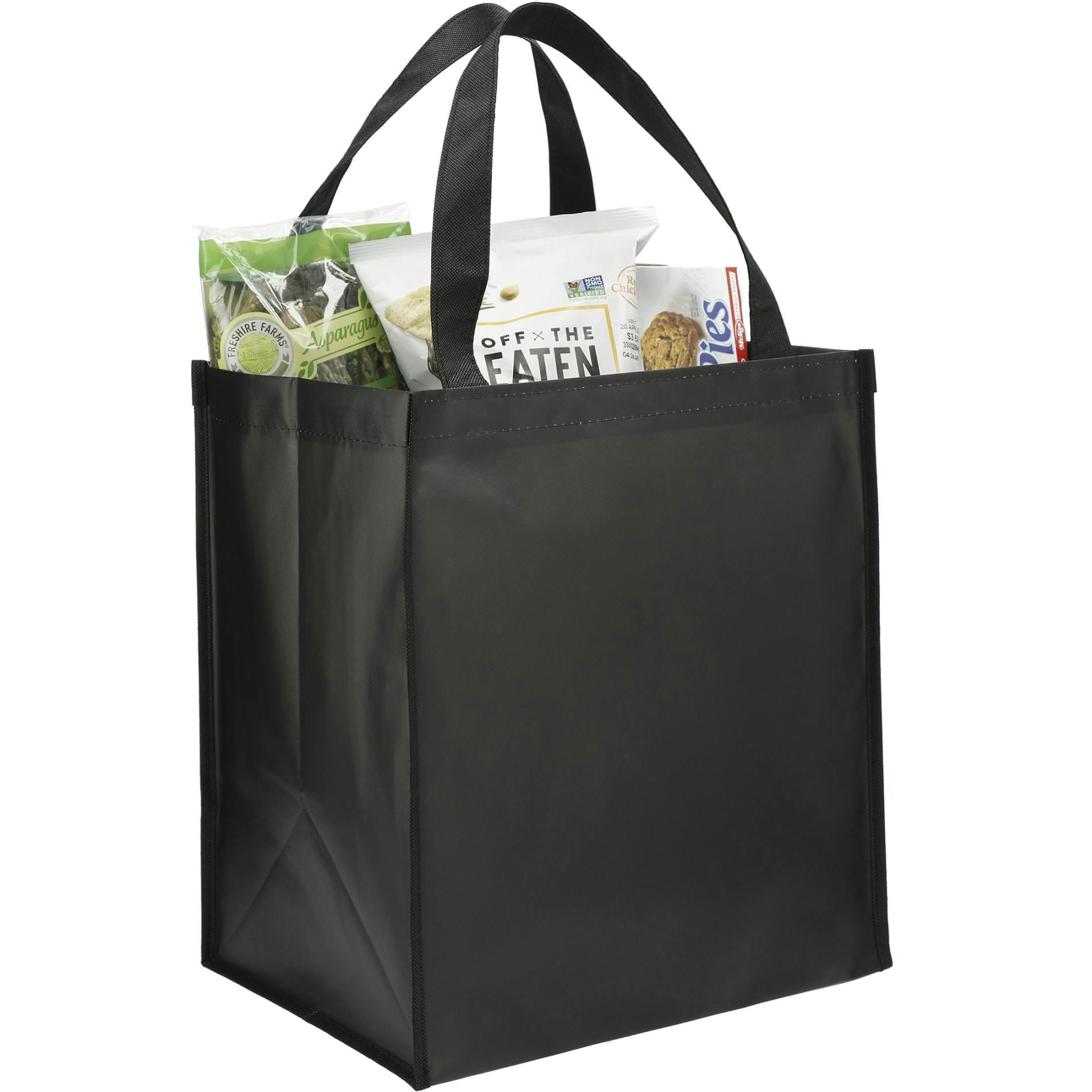 The Double Laminated Wipeable Grocery Tote is the classic grocery tote shape now with a wipeable interior and exterior to protect against germs. This tote has double handles, an open main compartment, and a supportive bottom board. Product dimensions are 15"H x 13"W x 10"D