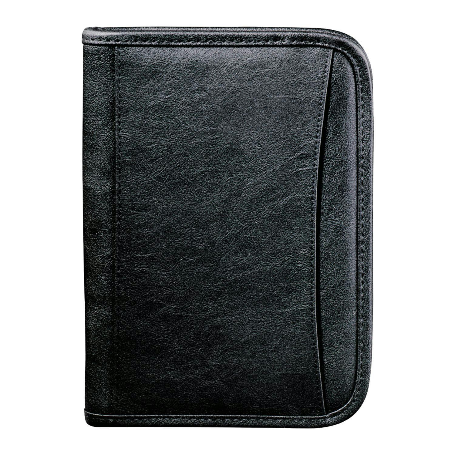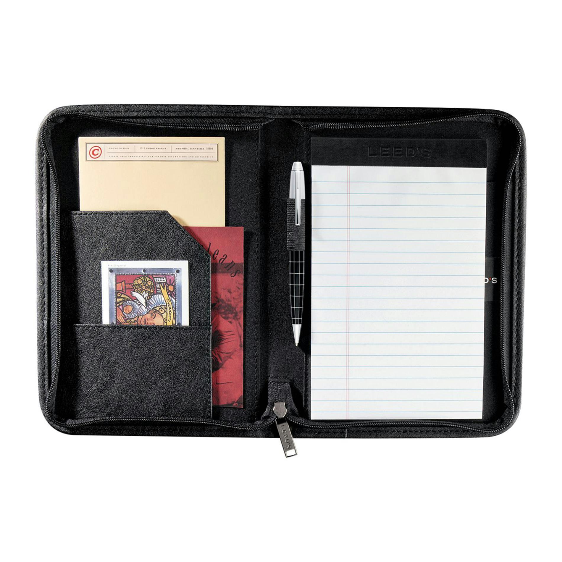 Zippered closure. Interior organizer. Front pocket. Elastic pen loop. Includes 5" x 8" writing pad. Refill item number: 9091-06. Pen not included.