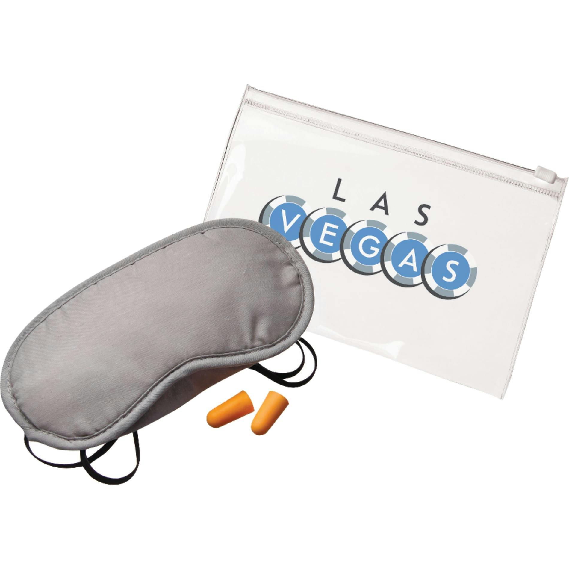 The E-Z Comfort Set is a compact travel comfort kit in a zip-top PVC resealable pouch—includes a soft polyester eye mask and two foam earplugs to block light and noise on flights, trains or quick office naps. Imprint available on the pouch only; pouch is packed separately, making it an ideal promotional travel pouch or giveaway for hospitality and corporate events. Checkpoint friendly: No.