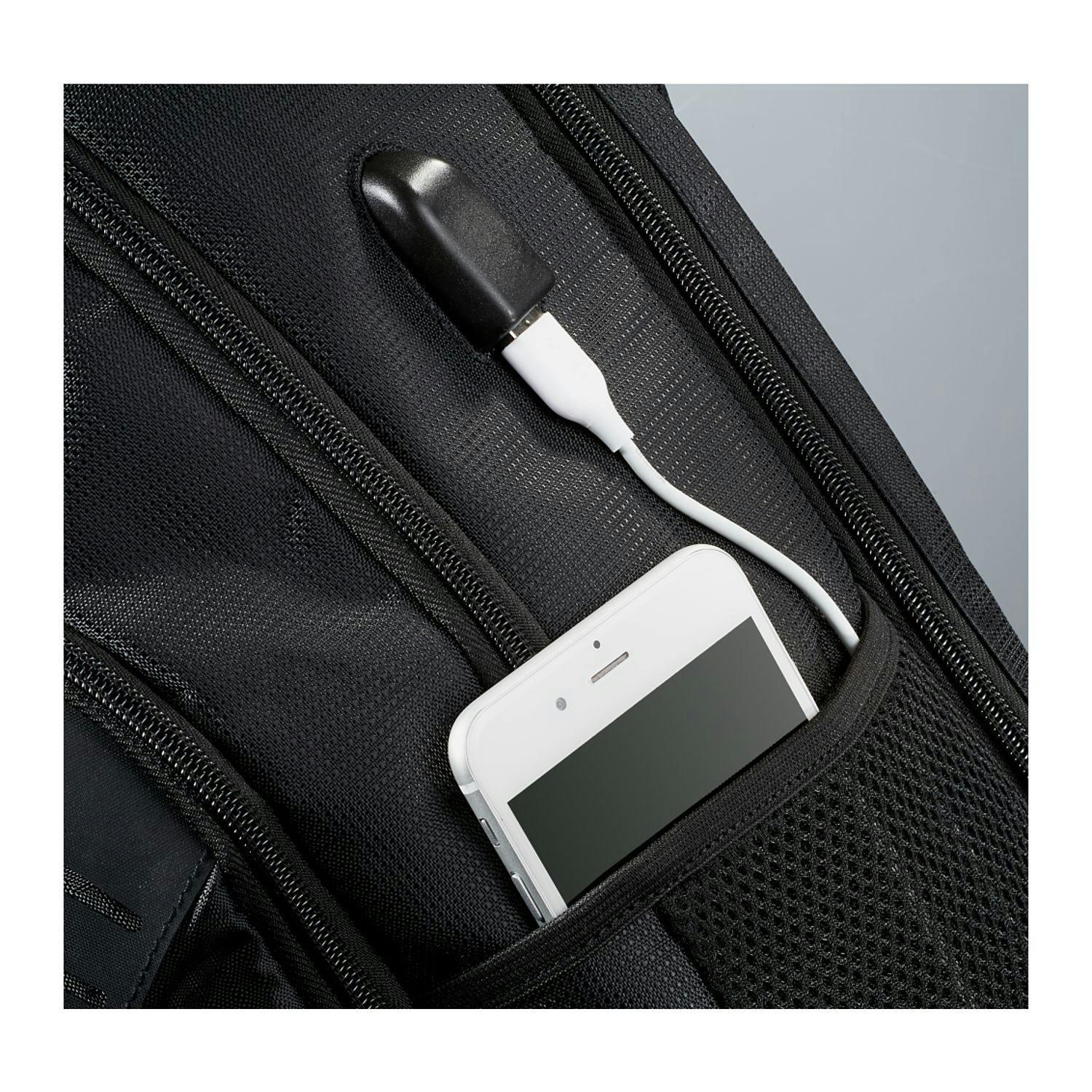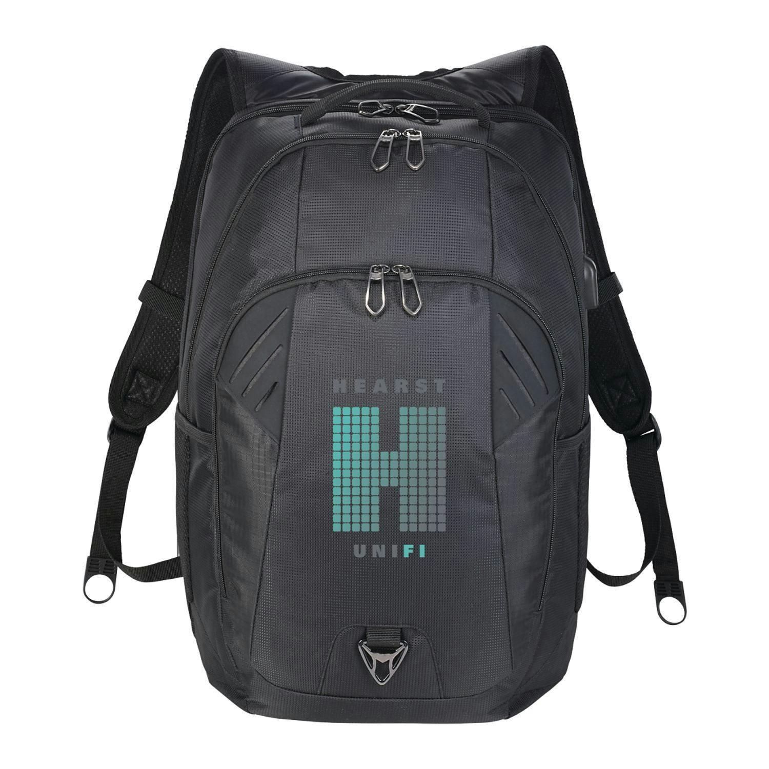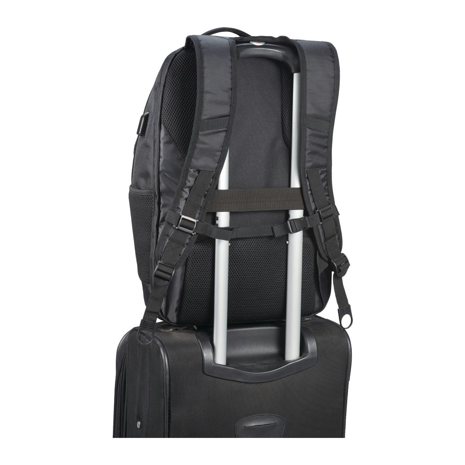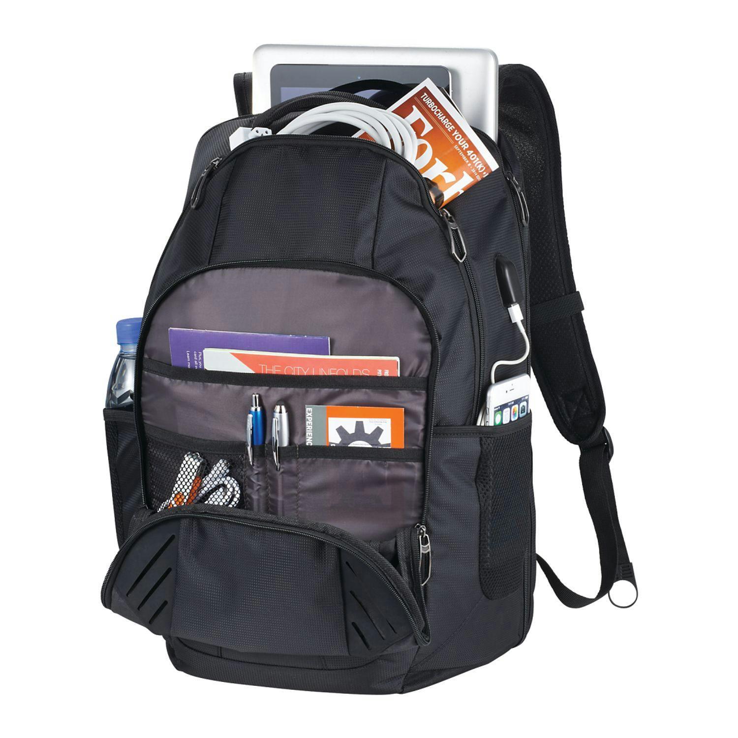The Foyager TSA 15" Computer Backpack features a large zippered main compartment that offers ample room for all of your tech accessories and tablet. The main compartment has built in USB port and cable which allows for seamless charging capabilities of your tech products inside the backpack. Includes a 15 inch TSA padded computer compartment that unfolds to lay flat on the X-ray belt to increase speed through security. Additional storage on the front panel of the bag includes a deluxe organizational panel and two side mesh water bottle pockets. Custom zipper pullers, padded back panel, chest strap, and trolley sleeve.
