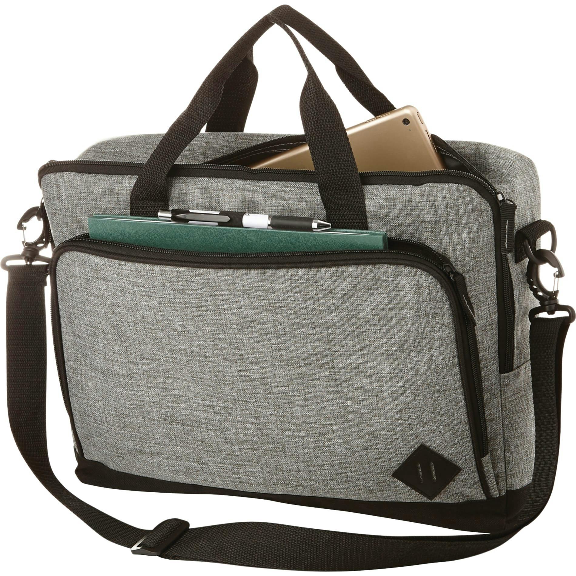 Top opening with padded laptop compartment. Front pocket with organization. Removable adjustable shoulder strap. Top grab handles. Disclaimer: There may be minor variations in color of the actual product due to the nature of the fabric dyes, weaves, and printing.