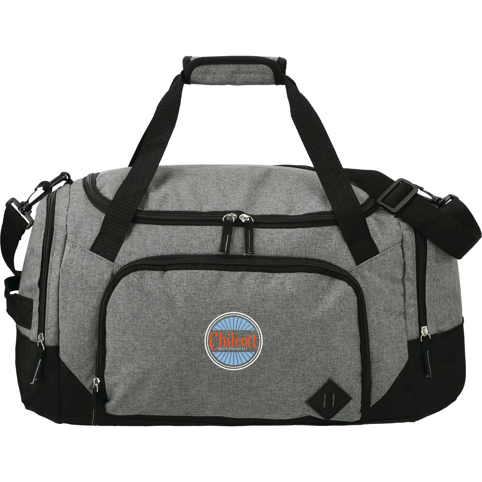 Heathered gray material. Large U-shaped opening. Dedicated side shoe pocket with grab handle. Removable adjustable shoulder strap. Side pocket. Front zippered pocket with signature Graphite patch.