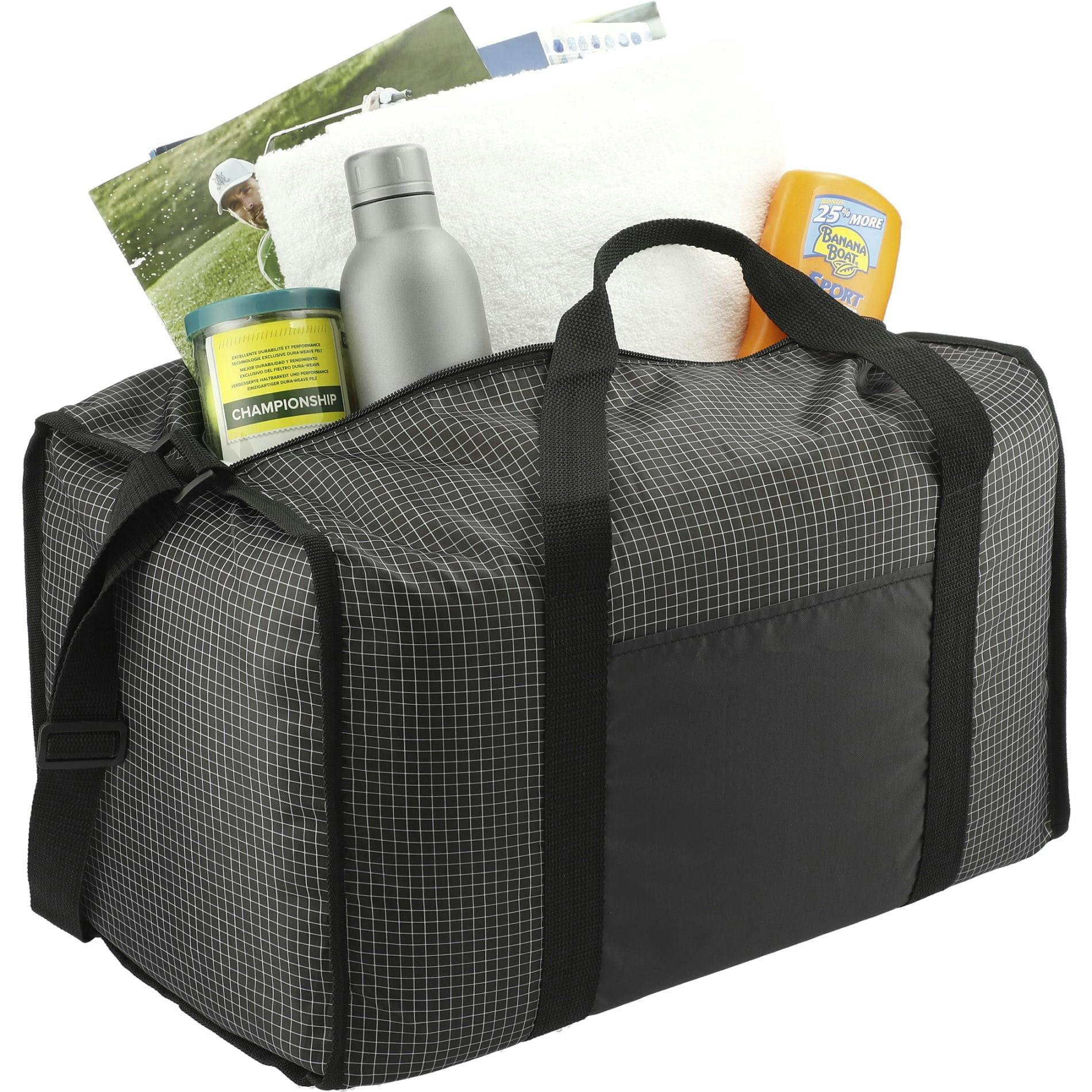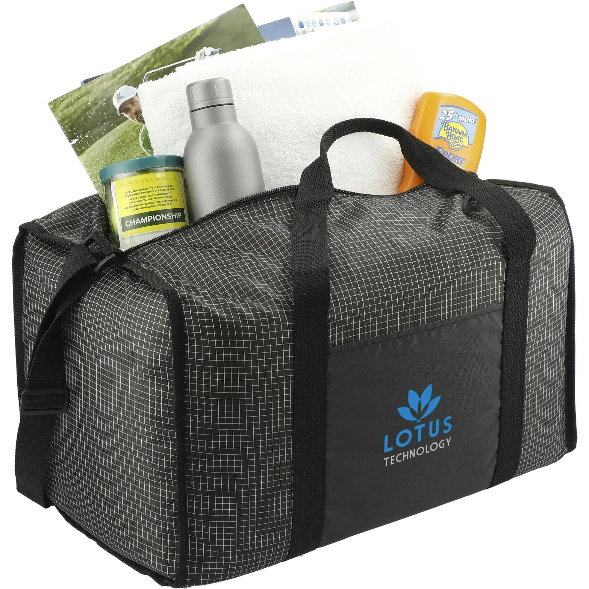 The personalized Grid Boxy Duffel is a versatile and durable bag designed for travel, sports, and everyday use. Made from 210D polyester, it features a spacious zippered main compartment to keep essentials secure. The two carry handles offer a comfortable grip, while the adjustable shoulder strap provides hands-free convenience. With a boxy 18"H x 12"W x 10.5"D design, this custom duffle bag is built for function and style. Customize it with your logo today.