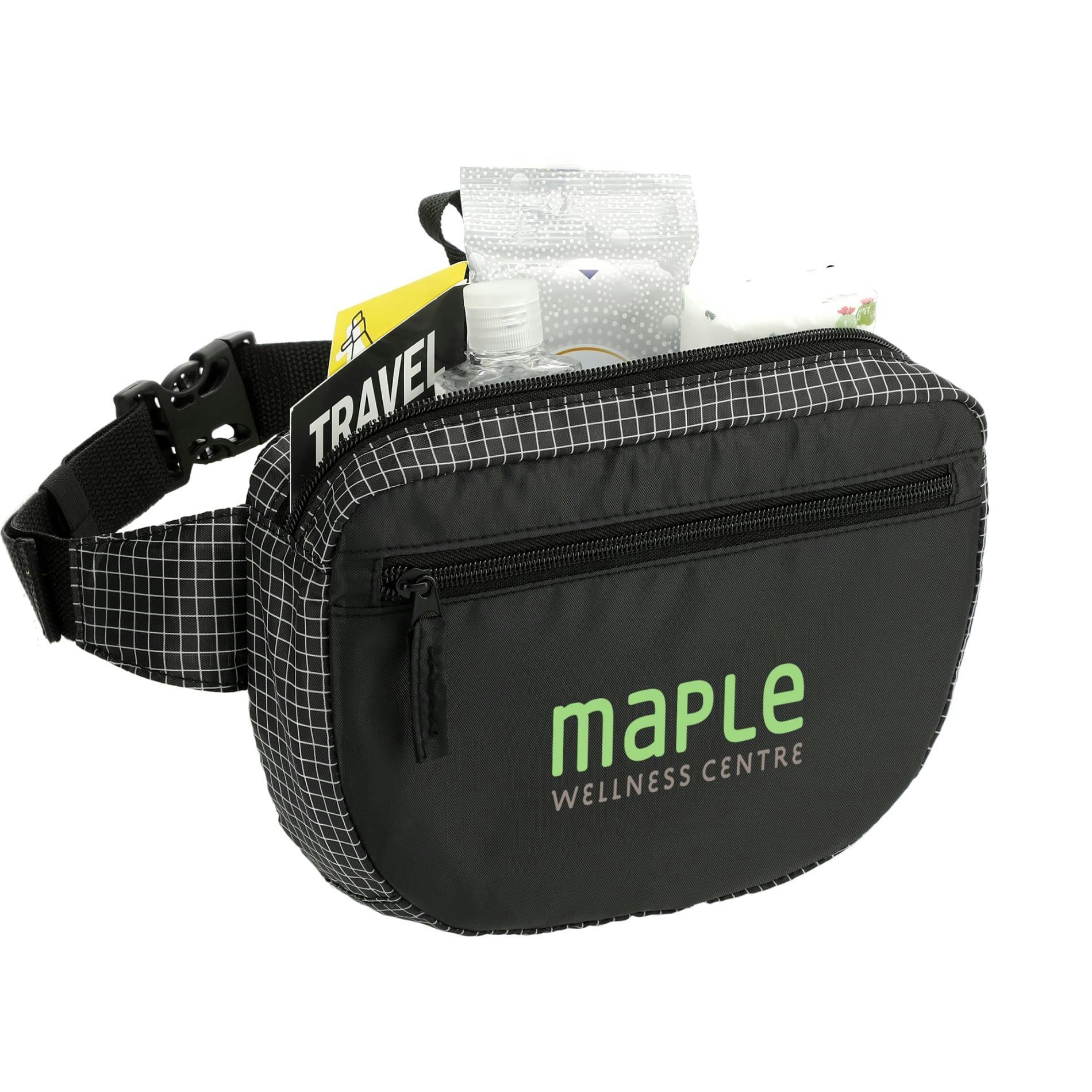 The Grid Fanny Pack features a zippered main compartment and a zippered front pocket. This fanny pack includes an adjustable waist belt.