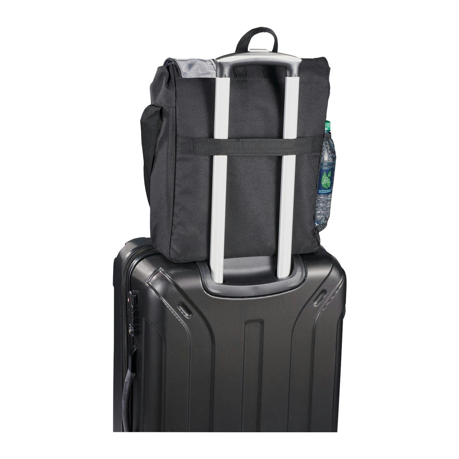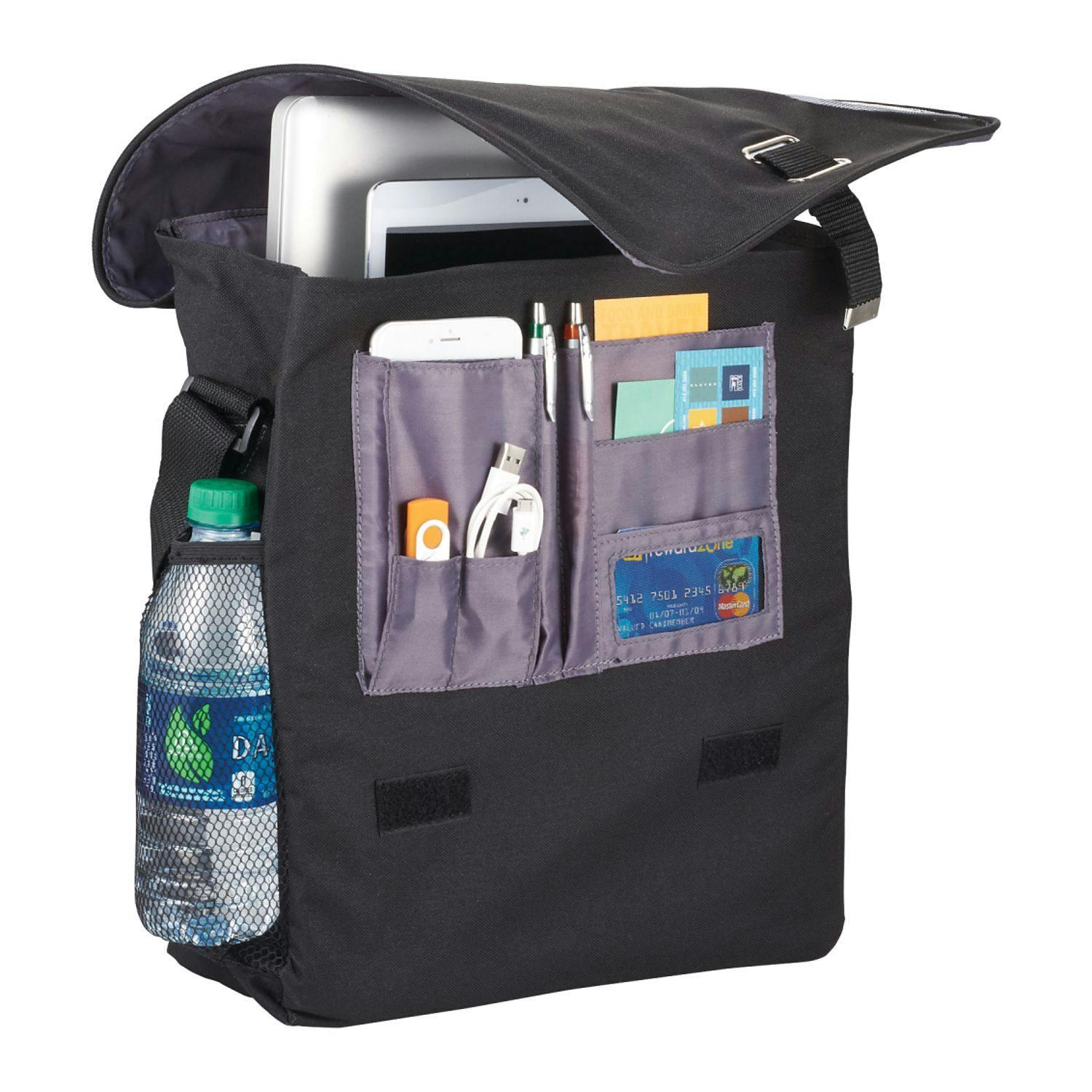 Vertical style messenger holds 15" laptop and iPad or other tablet device. Organization under the flap holds pens, business cards and phone. Side mesh pocket and trolley pass-through.