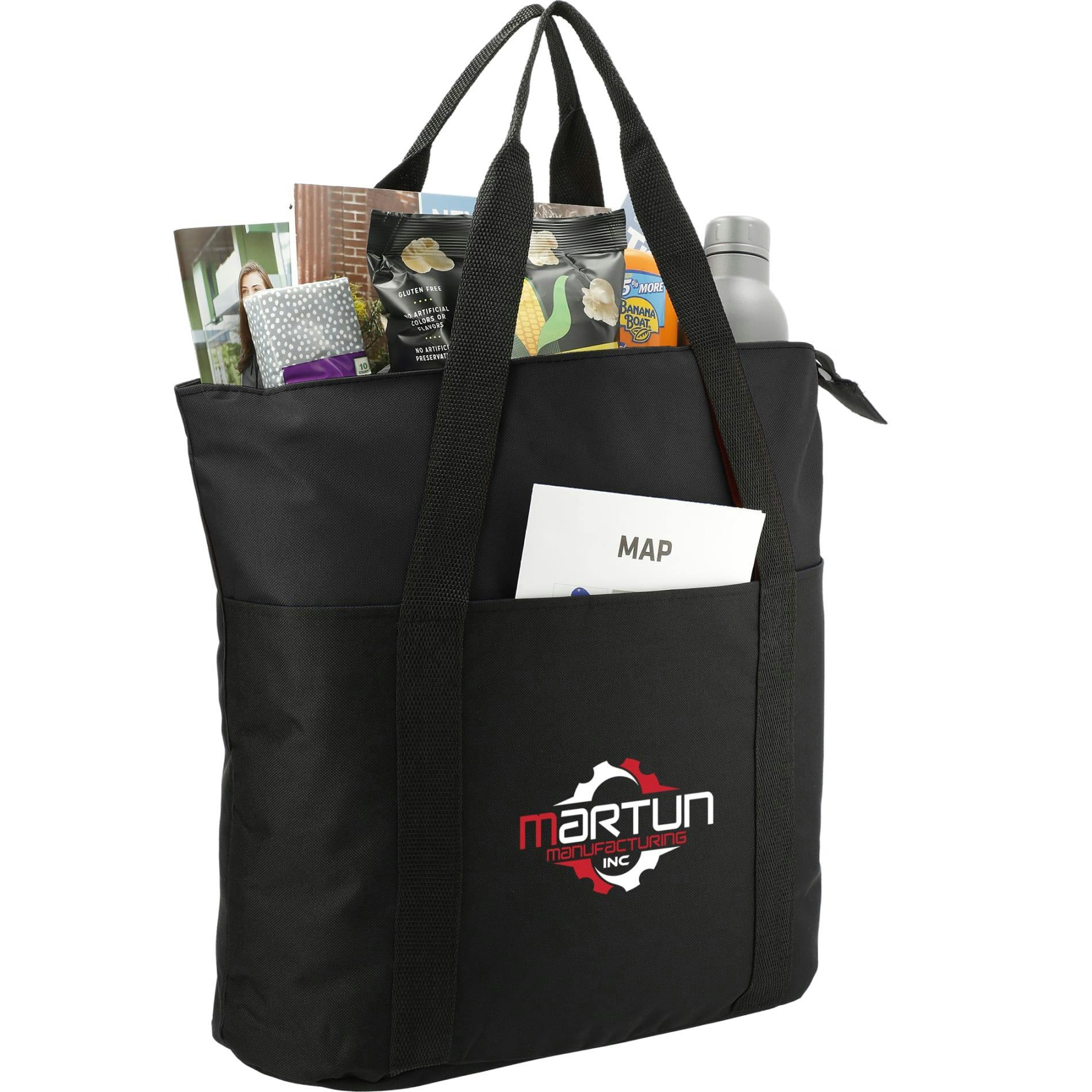 The Large Heavy Duty Poly Zippered Convention Tote Bag has a zippered main compartment and an interior zippered pocket. It also features a front pocket with a hook and loop closure and double 29 inch handles. Great for conventions, tradeshows and meetings around town.