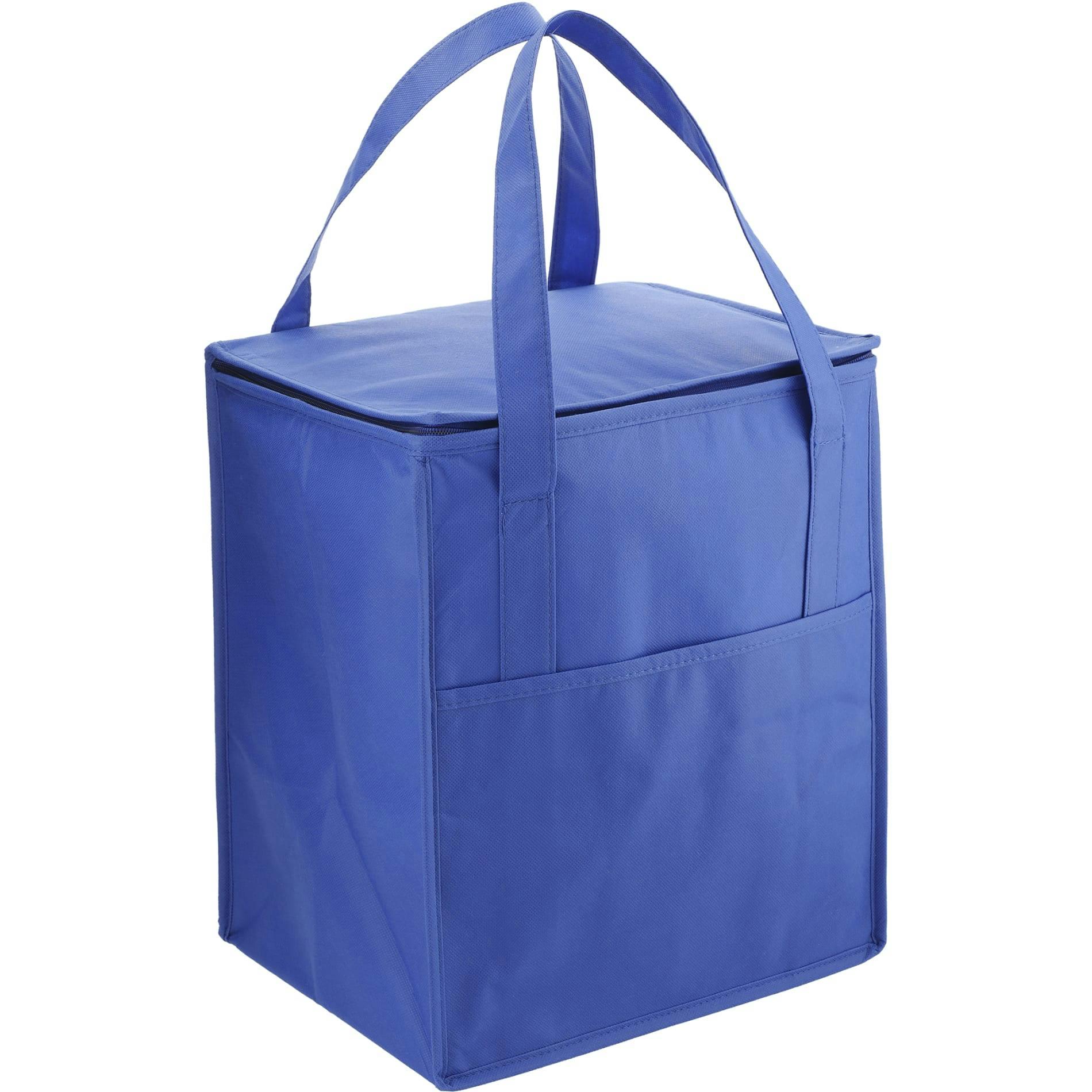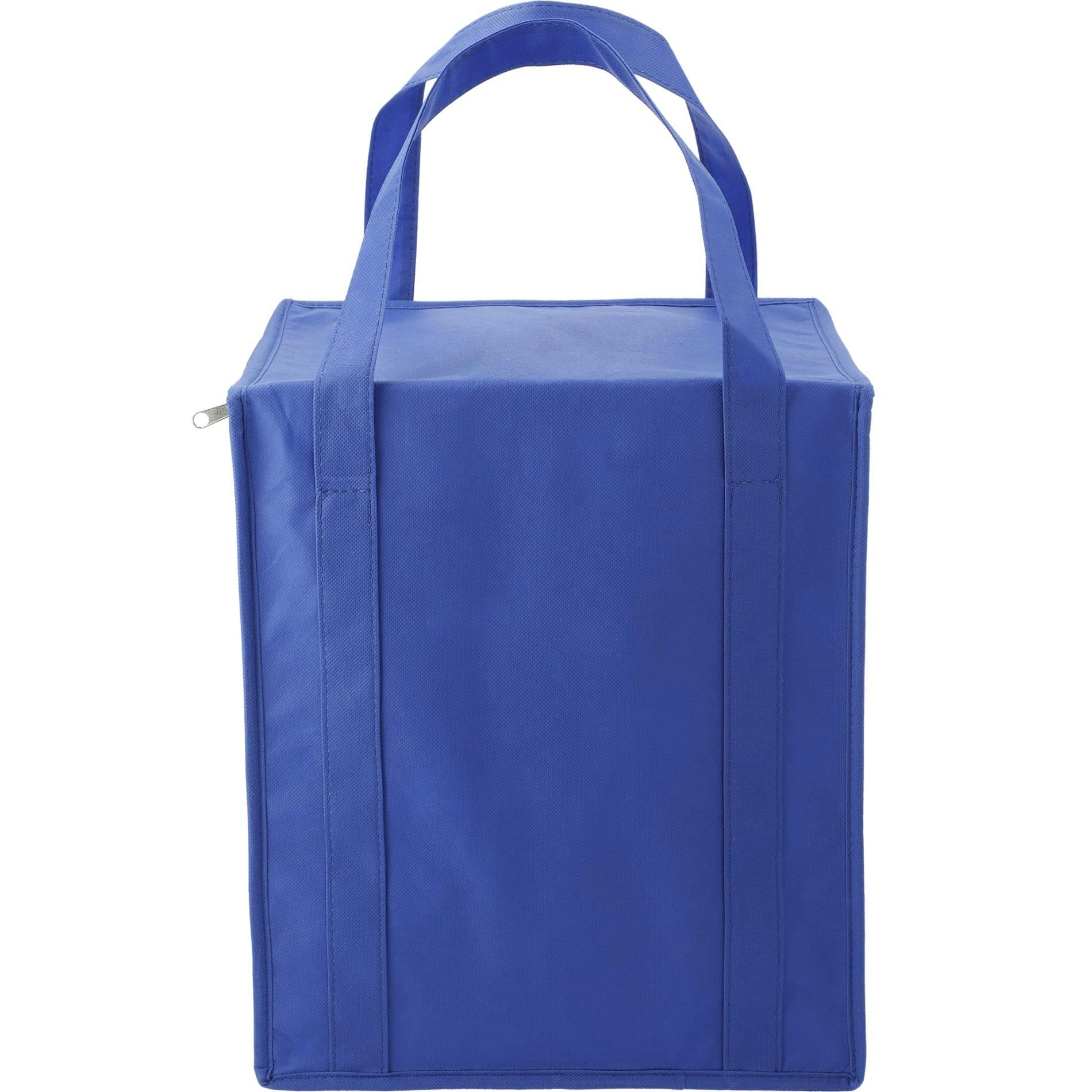 The Medium Flat Top Insulated Grocery Tote Bag features a large open main compartment and front slash pocket, plus a zippered closure and 22 pound weight capacity. Made from 80gsm non-woven polypropylene.