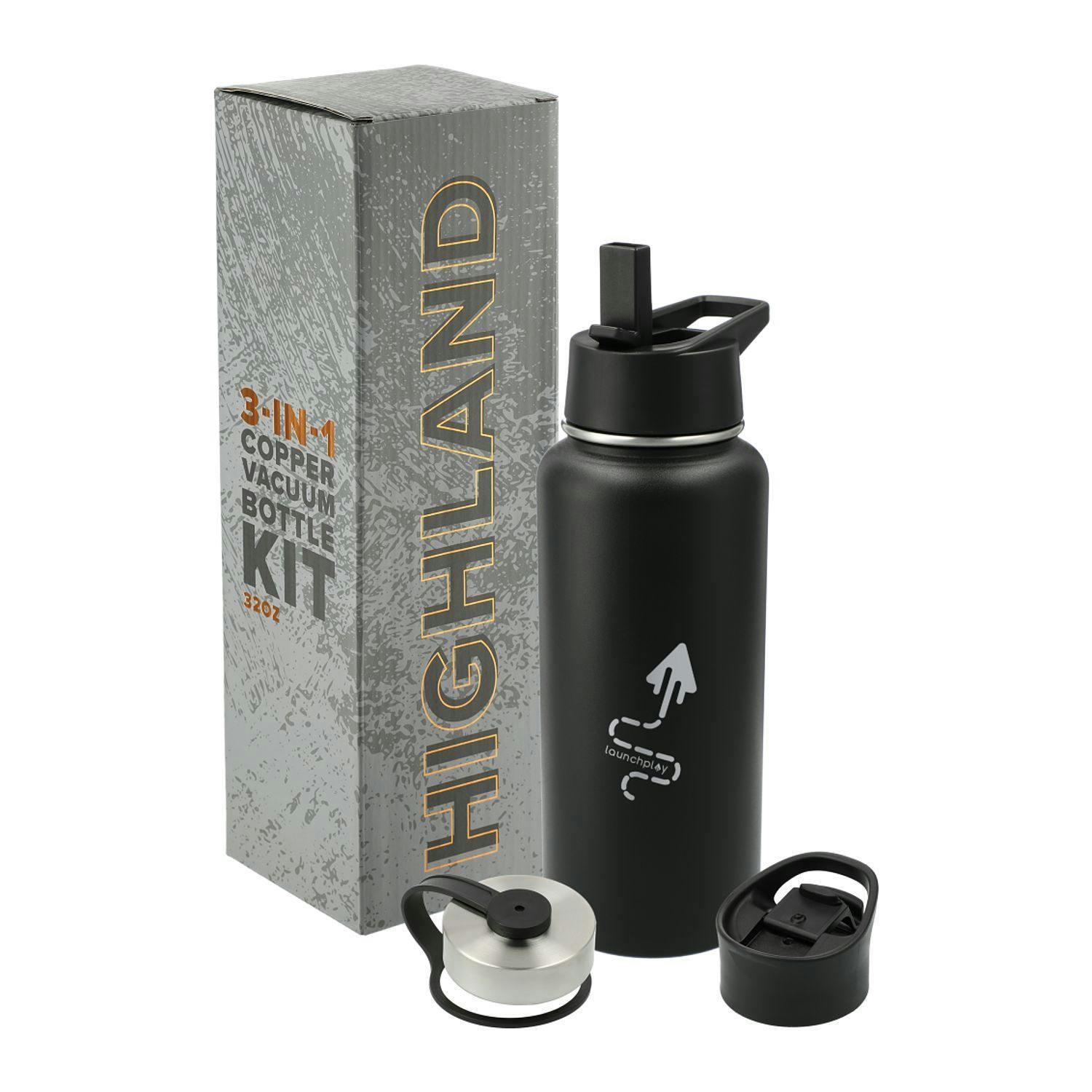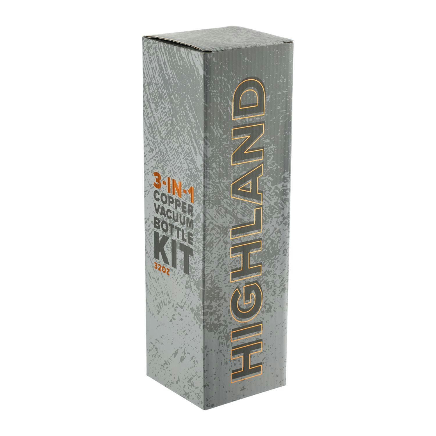 The Highland 3-in-1 Copper Vacuum Insulated Bottle Kit 32oz is the perfect item for an active lifestyle. Kit includes three types of lids, a screw on straw lid, a screw on chug lid and a screw on flip closure lid. Durable, double-wall stainless steel vacuum construction with copper insulation, allows your beverage to stay cold for up to 48 hours and hot for at least 12 hours. The construction also prevents condensation on the outside of the bottle. On-trend, durable powder coating. FSC certified premium gift box is included. 32oz. Note: Drinking hot beverages with the straw is not recommended. Remove lid to allow beverage to cool.