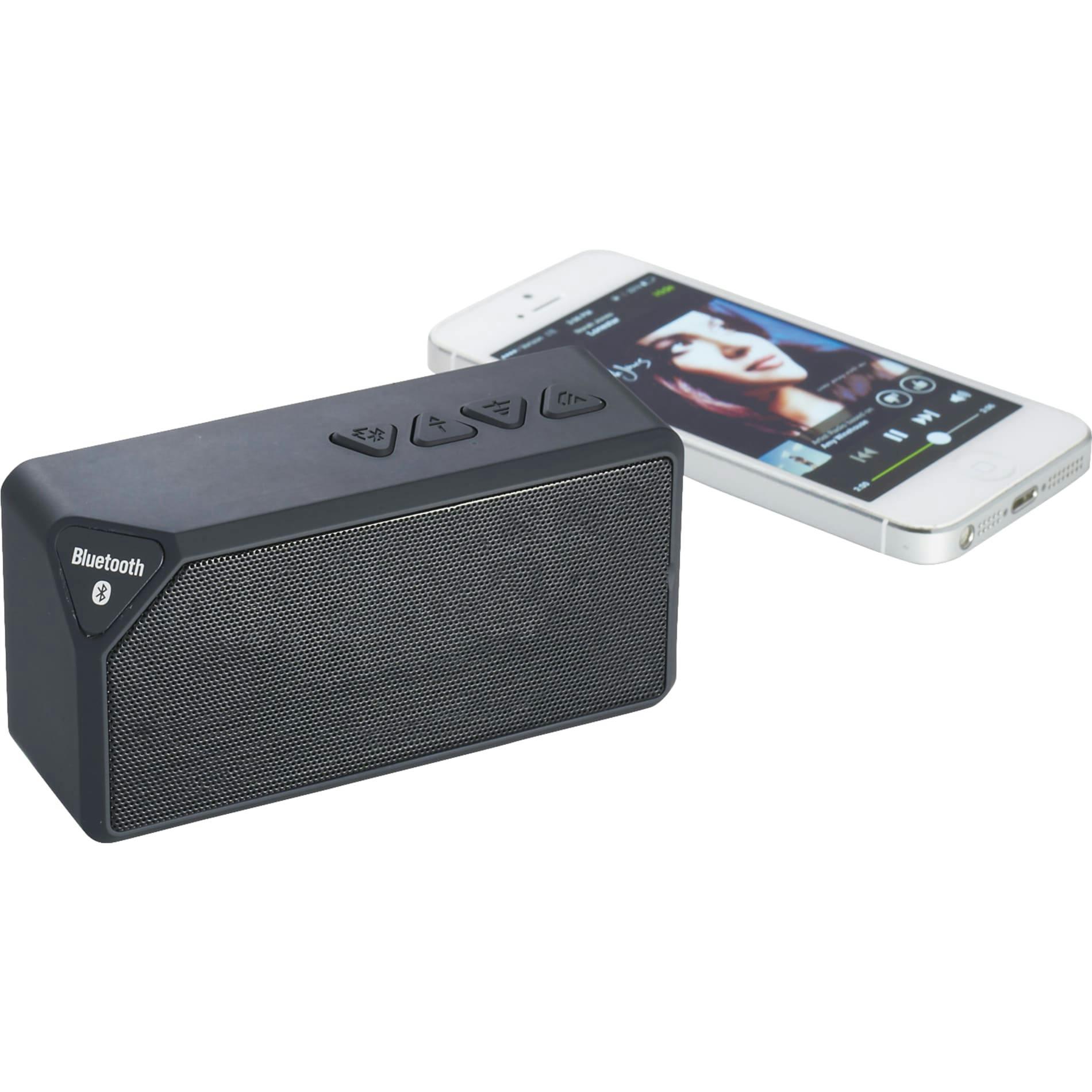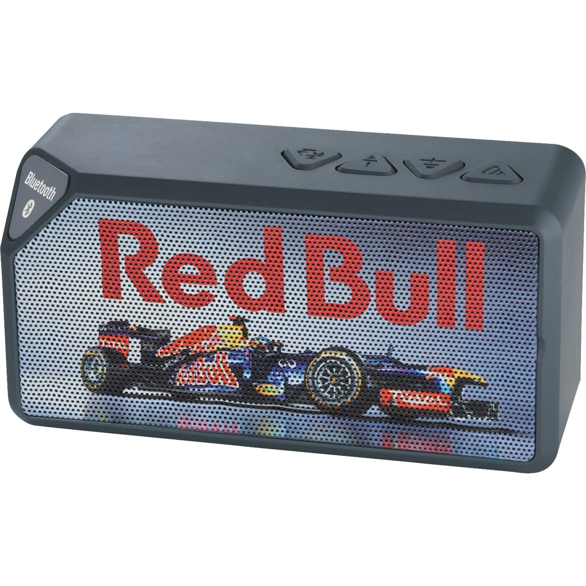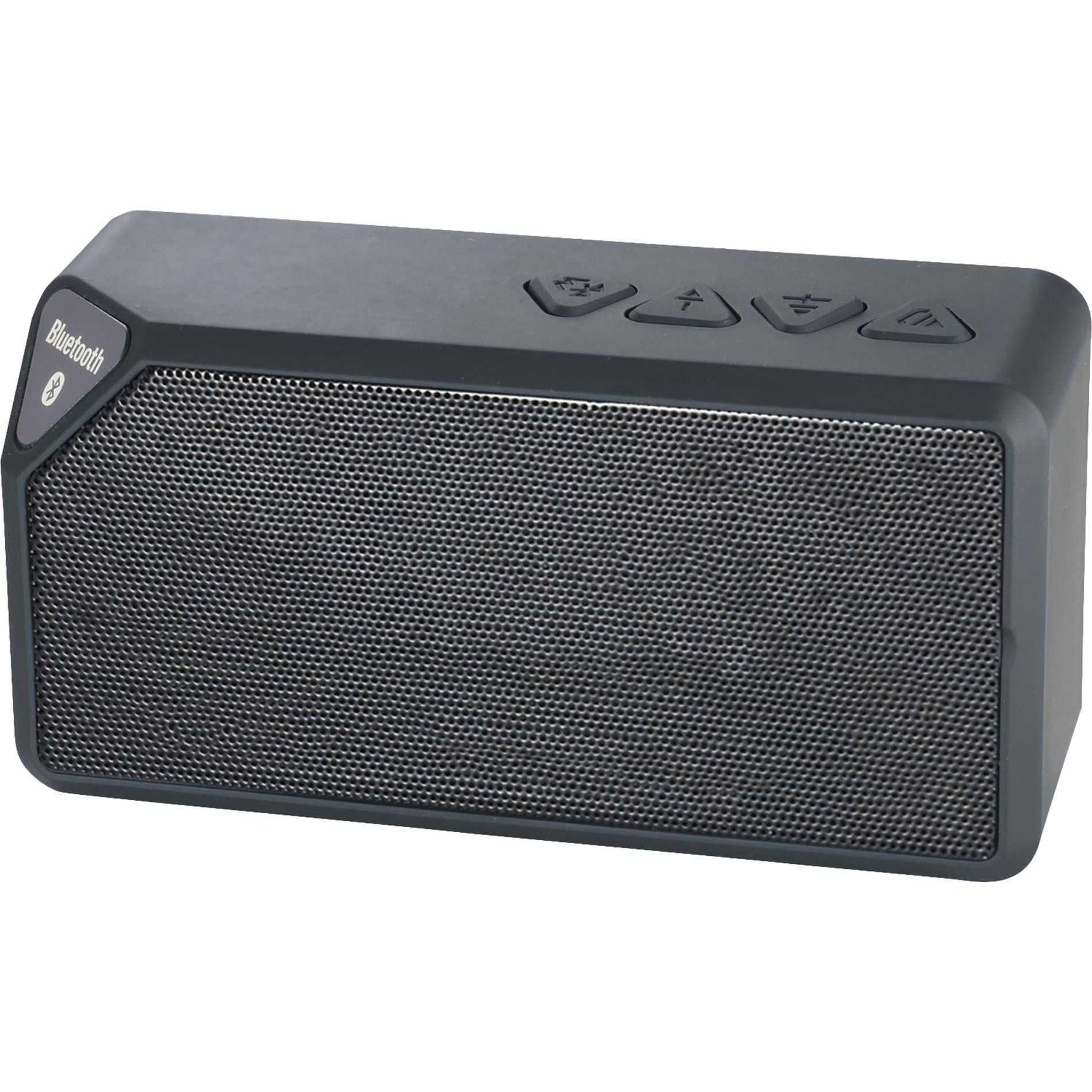 Power your music with this Bluetooth Speaker! Quality sound in a small form factor that plays your music or other audio from a Bluetooth enabled device or by a 3.5mm audio input, making it compatible with just about anything that plays music. Perfect for anyone that travels and is on-the-go or it can simply sit at a desk in an office setting. Bluetooth working range is 10 meters (33 feet).Enjoy up to 2hrs. of music at max volume on a single charge. It takes 2.5hrs to charge the speaker from 0 to 100%. This product is also available with a custom wrap for the packaging. See 7198-99 Jabba Bluetooth Speaker with Full Color Wrap.