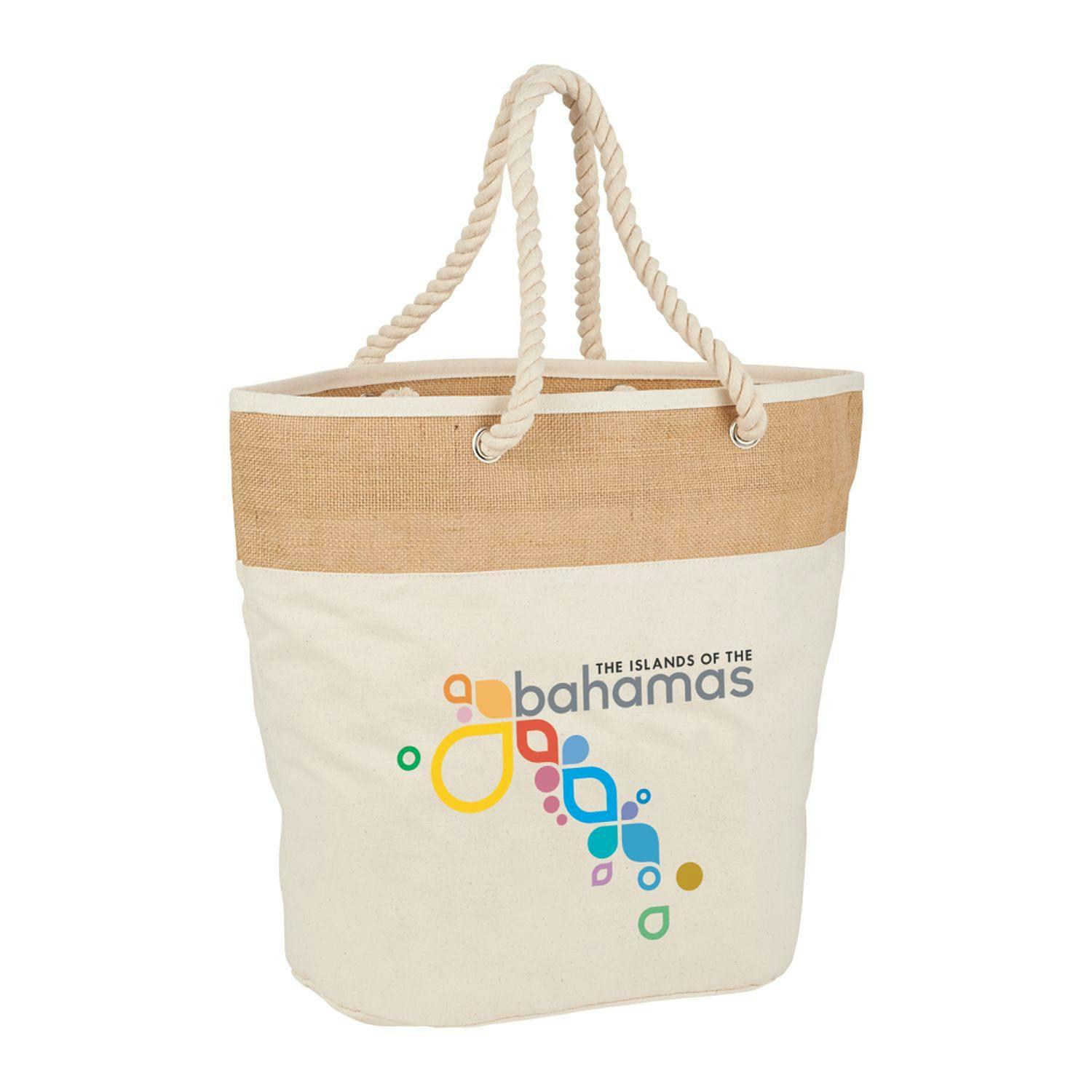 This sturdy 12 oz. cotton tote with jute accent is the perfect bag for the on-trend carrier. Very large soft cotton rope handles are accented perfectly by the natural jute accent. Large open main compartment.