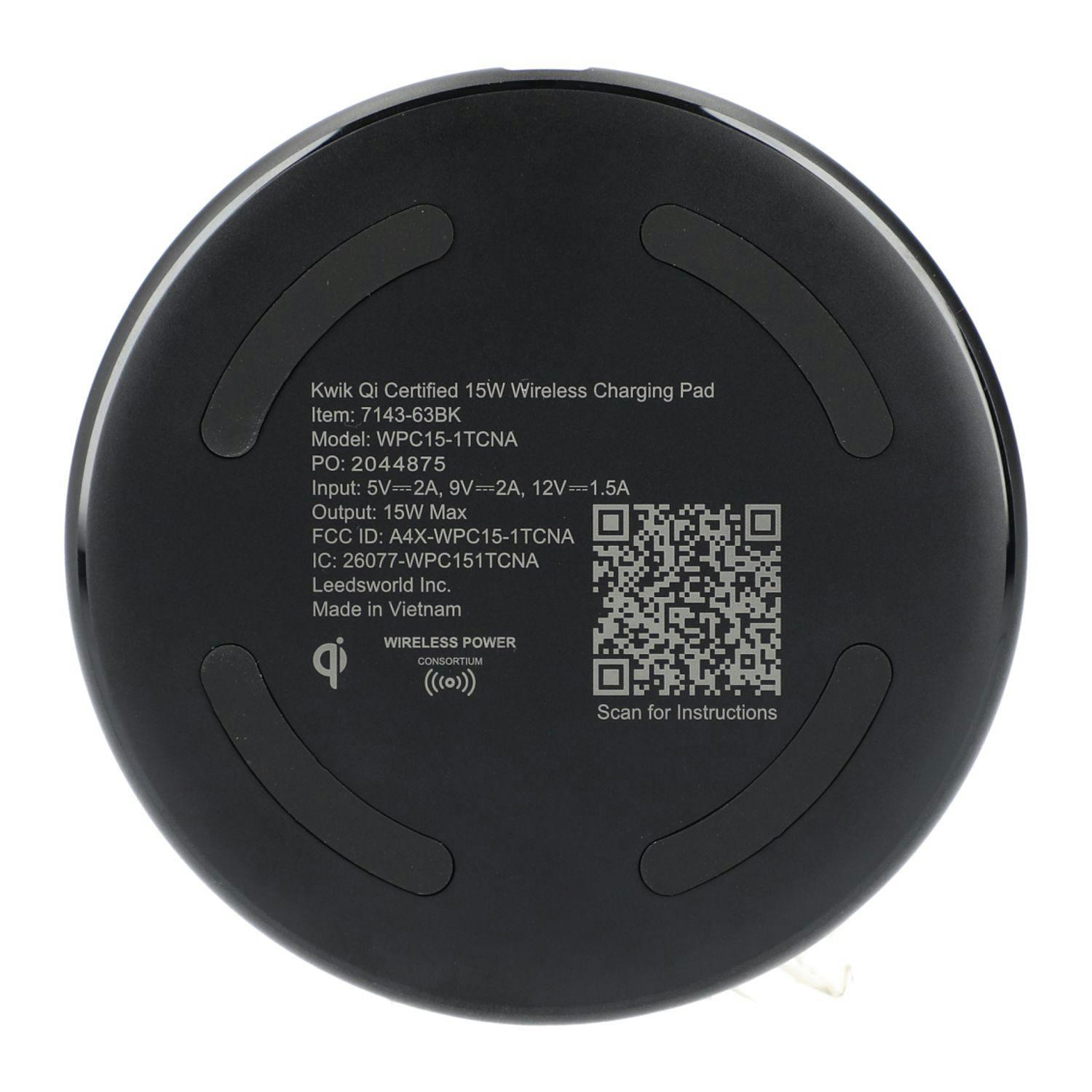 The Kwik Qi Certified 15W Wireless Charging Pad delivers up to 15W of wireless power to Android devices and up to 7.5W for All iPhone 8/X/11/12/13/14/15 Series. It works with most plastic phone cases on and includes 39-inch Type-C to Type-C cable. It is recommended to use UL or ETL Listed 20W USB-C power adapter. Qi certified. Packaged in a FSC® certified gift box.