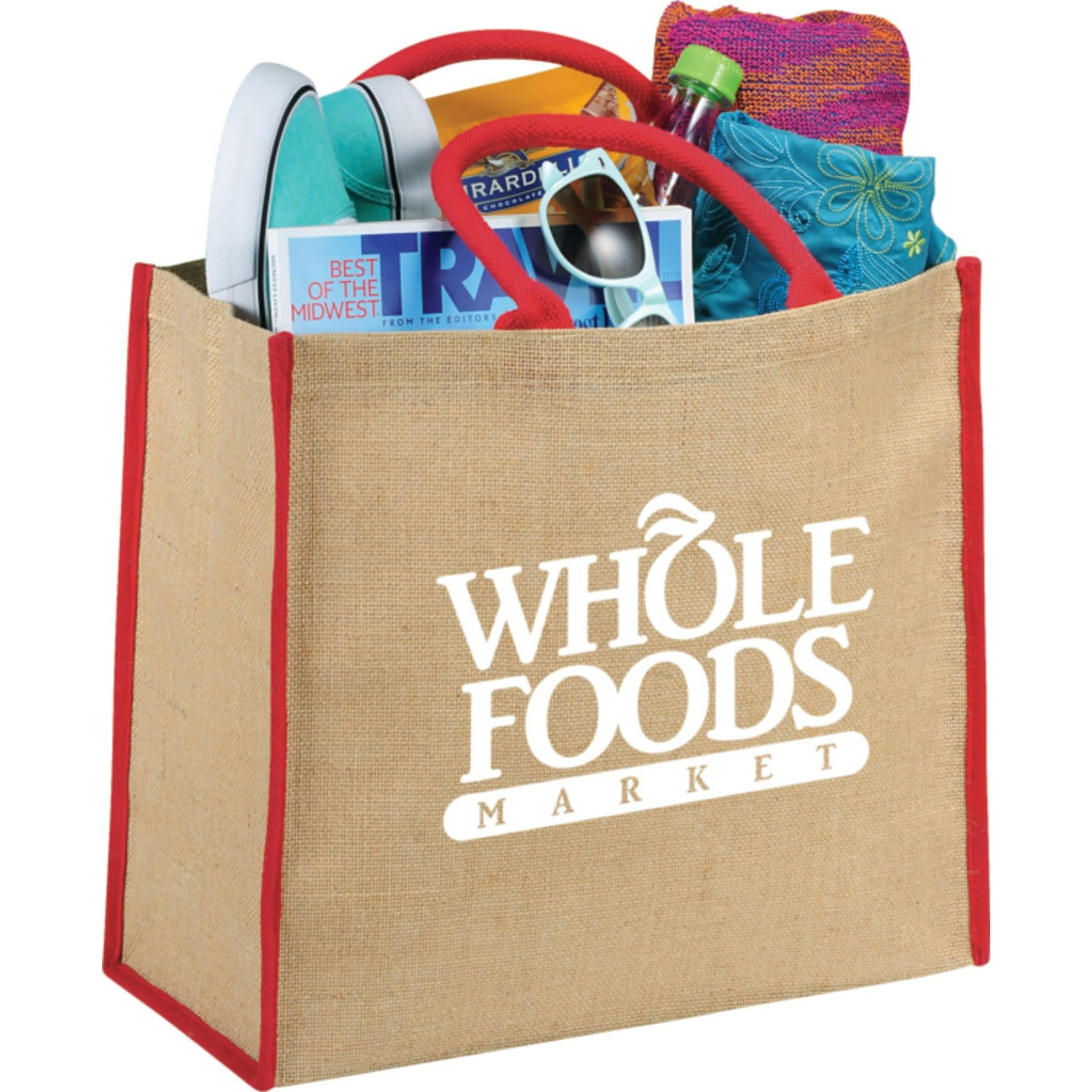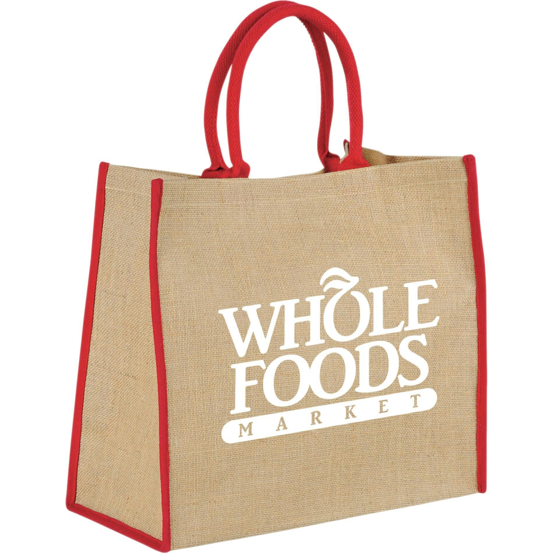 The Large Jute Tote has an open main compartment and double 17 inch handles. Disclaimer: Minimum of 32pt. font size. Bold artwork only. No fine graphics or text.