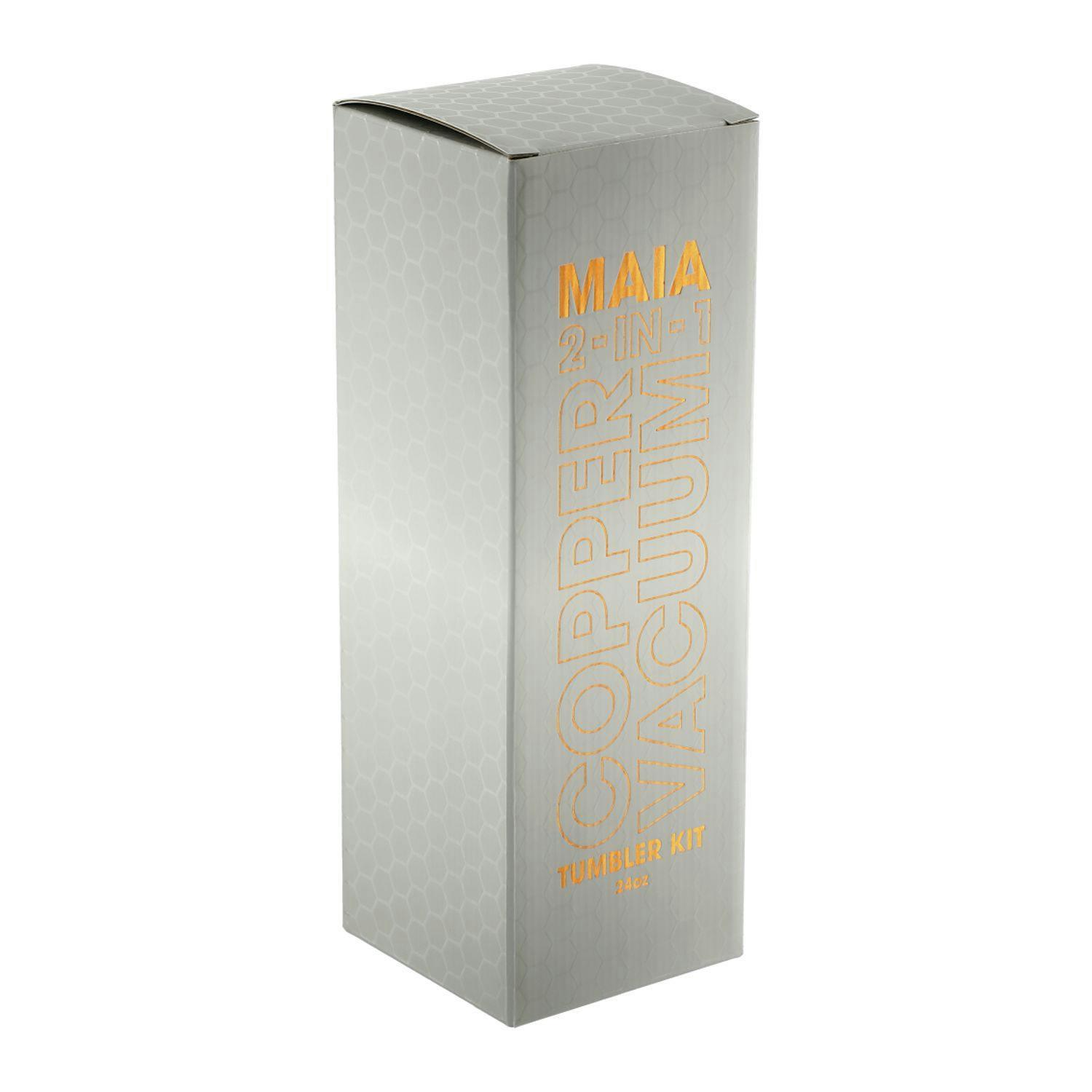 The Maia 2-in-1 Copper Vacuum Insulated Tumbler Kit 24oz is the perfect item for a flexible lifestyle. Kit includes two types of lids, a screw-on straw lid and a screw-on flip closure lid. Durable, double-wall stainless steel vacuum construction with copper insulation, allows your beverage to stay cold for up to 24 hours and hot for at least 8 hours. The construction also prevents condensation on the outside of the tumbler. On-trend, durable powder coating. FSC certified premium gift box is included. 24oz. Note: Drinking hot beverages with a straw is not recommended. Remove the lid to allow the beverage to cool.