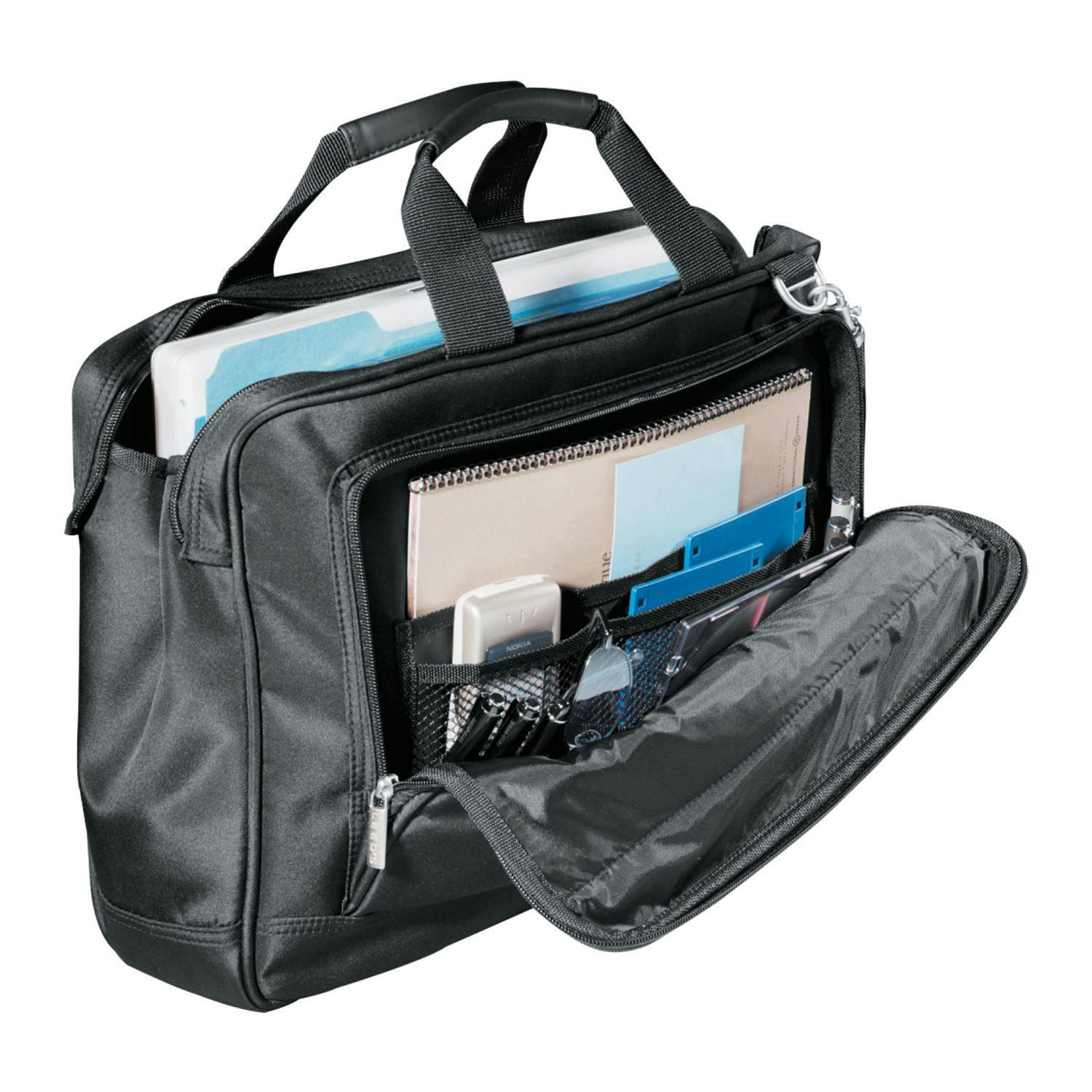 Deluxe front organizer for multiple business accessories. Padded laptop compartment holds most computers up to 15". Detachable, adjustable shoulder strap.