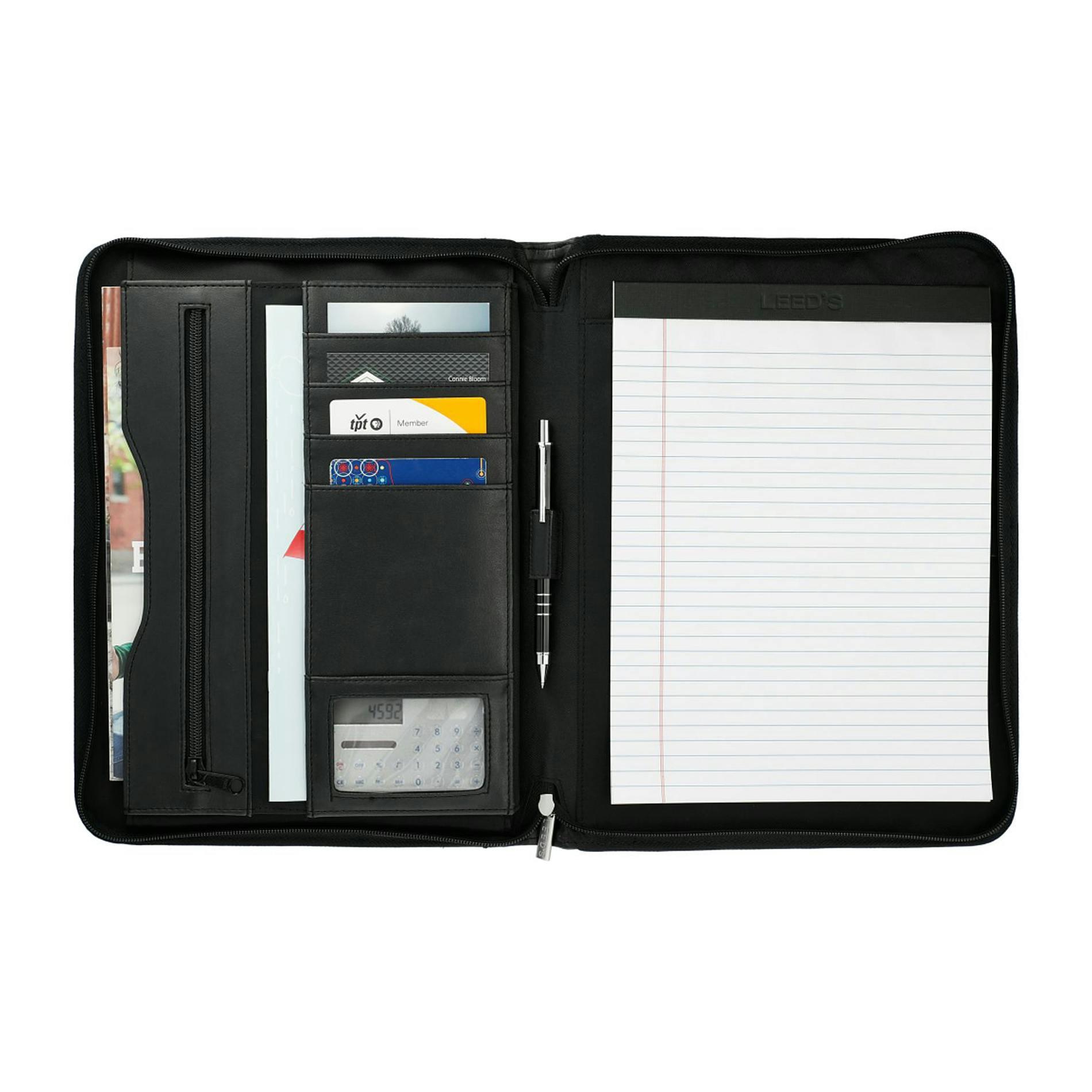 Zippered closure. Interior organizer with gusseted file pocket and zippered pocket. Pen loop. Includes 8.5" x 11" writing pad. Refill item number:9091-01. Pen is not included.