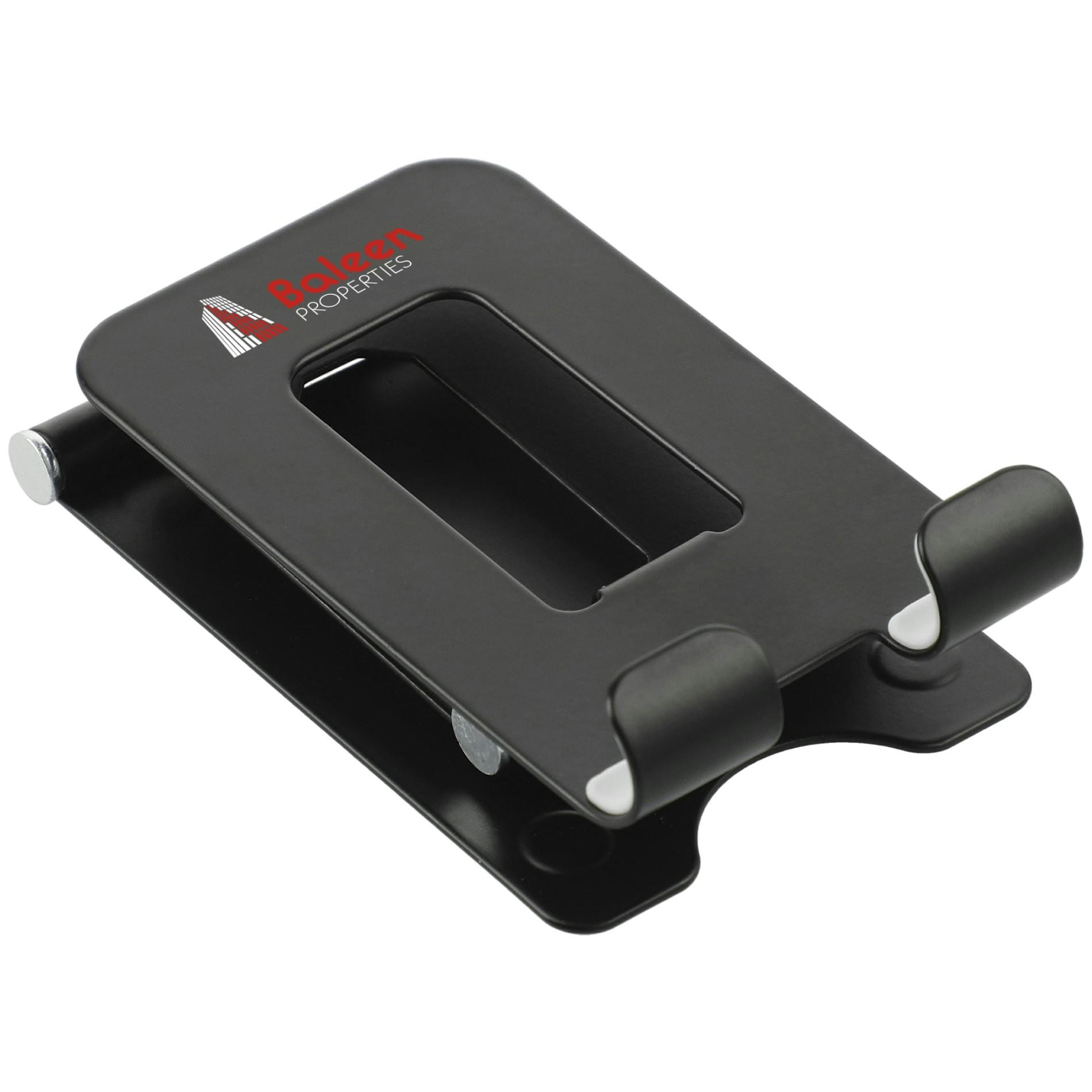 Keep your tablet or phone in sight with the Mobile Metal Phone Stand, which can adjust to give you the perfect viewing angle. When you're done using it, the stand it can fold flat for easy transportation to and from the office. Can support phones and tablets up to 3/8" and 0.6lbs.