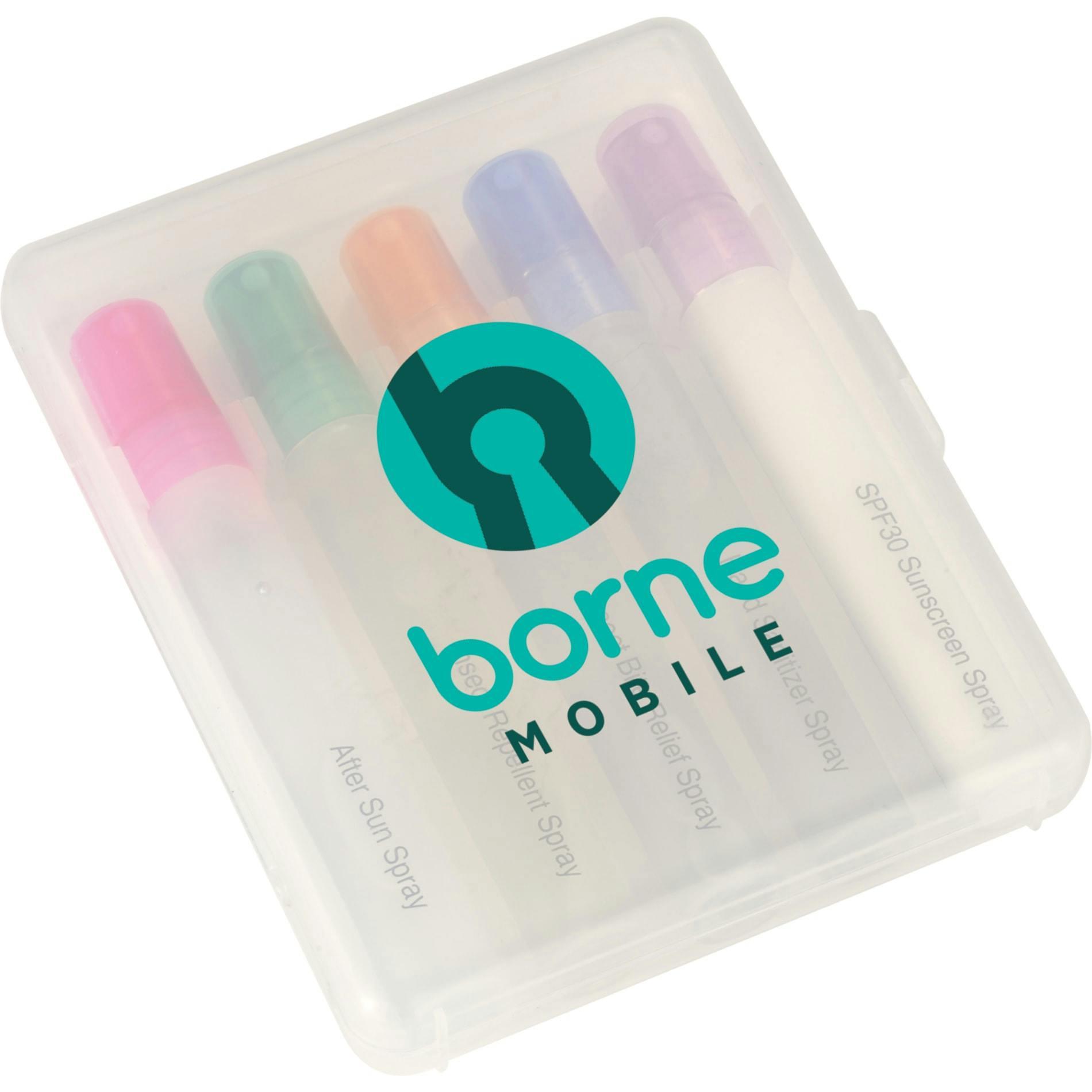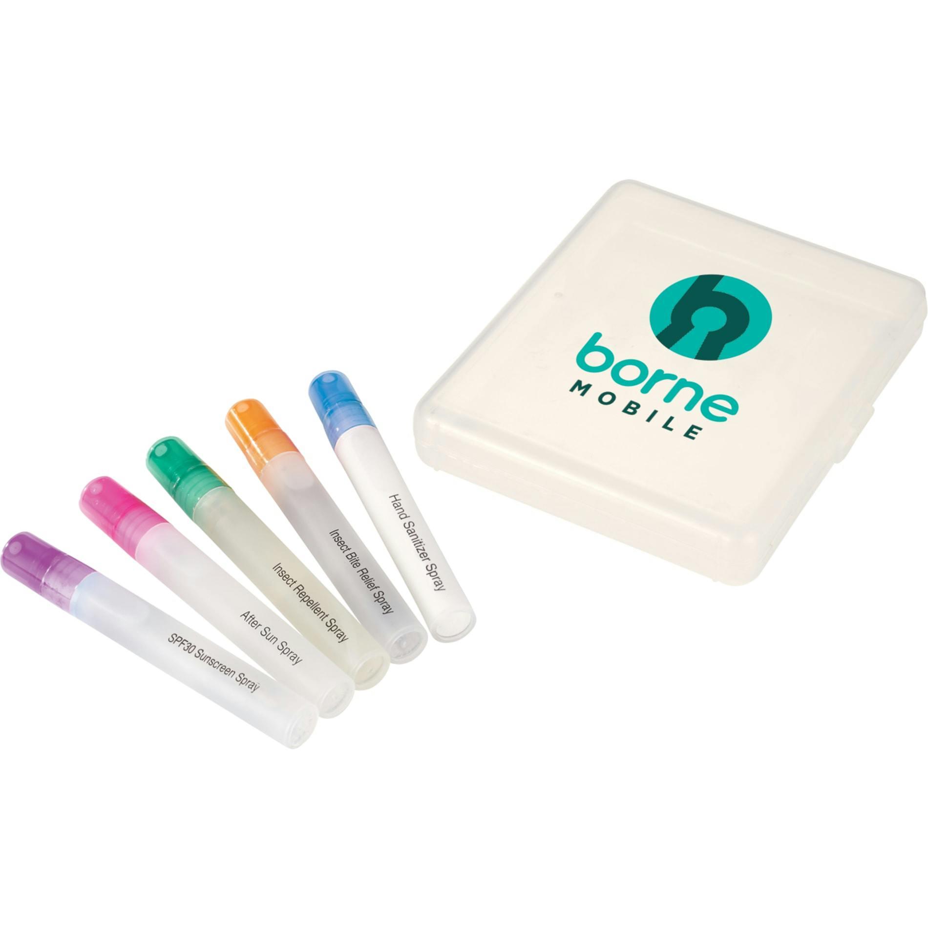 Outdoor 5-Piece Wellness Set — pocket-sized protection for sun, bugs and germs. This compact promotional kit includes five 0.33 oz pen-spray essentials: hand sanitizer, SPF30 travel-size sunscreen, after-burn spray, insect repellent and after-bite spray — all snug inside a sturdy travel case. Ideal for hiking, beach days, festivals, corporate giveaways or toss-in-your-bag convenience, it keeps recipients protected and brand impressions visible. Imprint available on the outer case only. SPF30 sunscreen does not contain Octinoxate or Oxybenzone and the set meets FDA requirements. Available to ship within the United States (including Alaska, Hawaii & Puerto Rico); not for export. See General Information for additional air shipment charges.