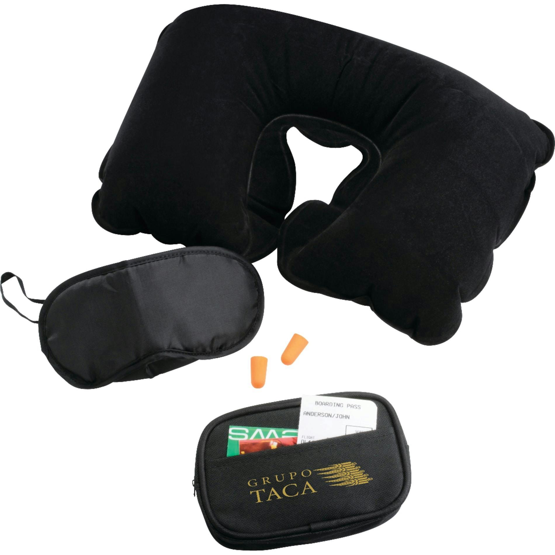 The Personal Comfort Travel Kit features a zippered pouch with an open-top front pocket that includes 2 soft foam earplugs, a black eye mask and an inflatable soft-touch neck pillow.