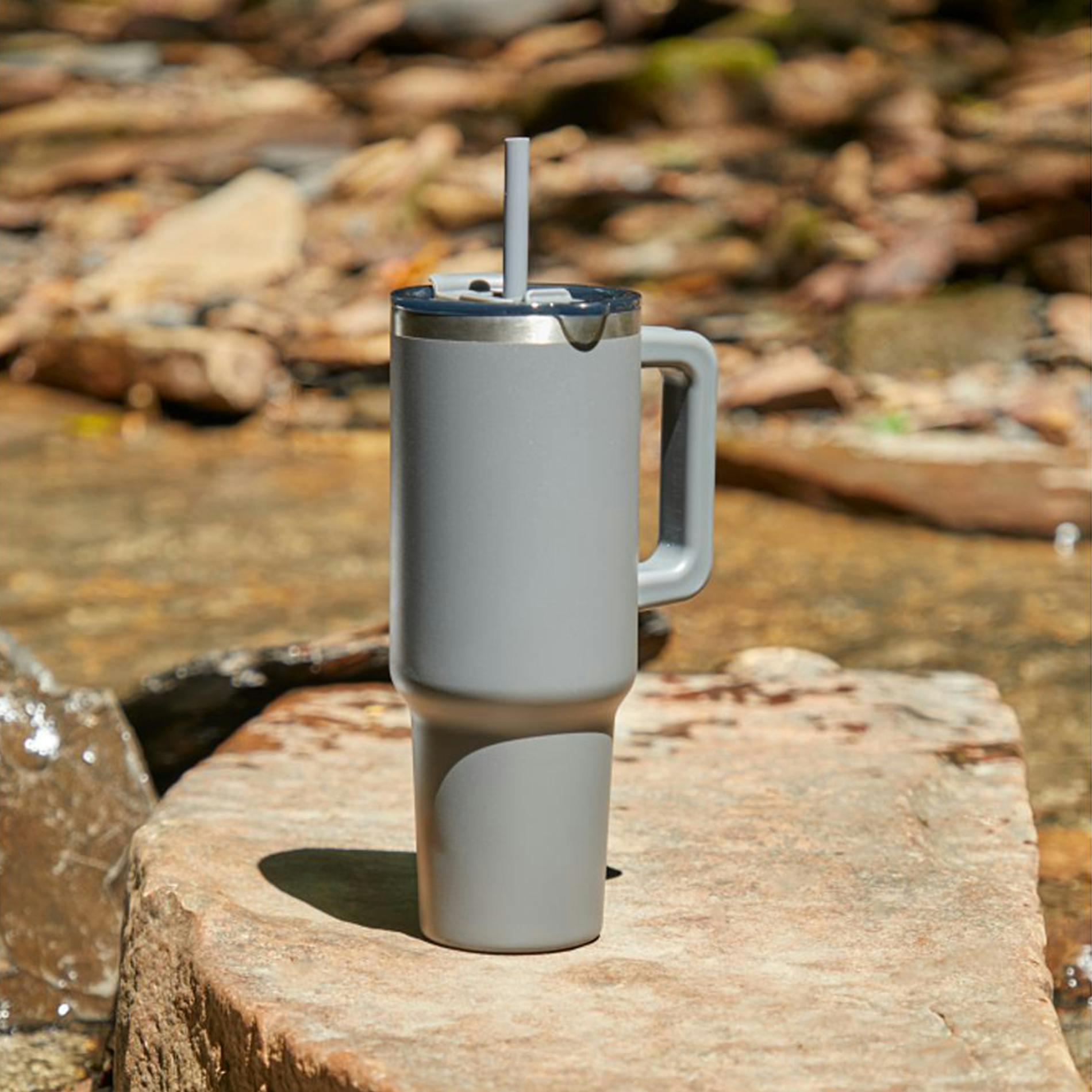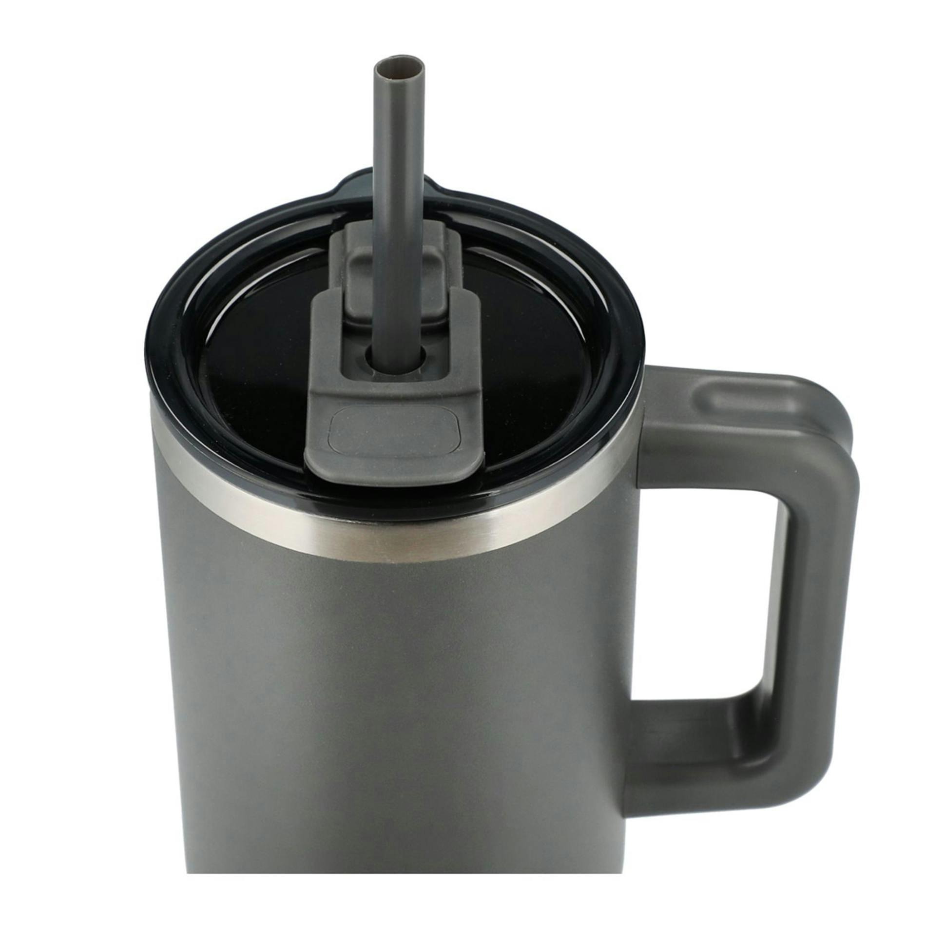 Meet the Pinnacle, a budget-friendly 40 oz travel tumbler that doesn’t compromise on style or performance – all while being made from recycled materials. Constructed using 91% post-consumer recycled 18/8 stainless steel – the 40 oz Pinnacle Travel Tumbler features high-performance copper vacuum insulation that will keep drinks cold 24+ hours for all-day hydration, and a durable powder coating with a sleek matte finish that matches the handle, straw and lid slider for a premium, retail look and feel. The 100% recycled plastic, press-on swivel lid securely holds the Tritan straw in place, is easily rotated to expose the drink opening, and features a proprietary lid slider to prevent spills. A sturdy ergonomic handle makes carrying this tumbler effortless, and the slim base fits in most car cup holders.