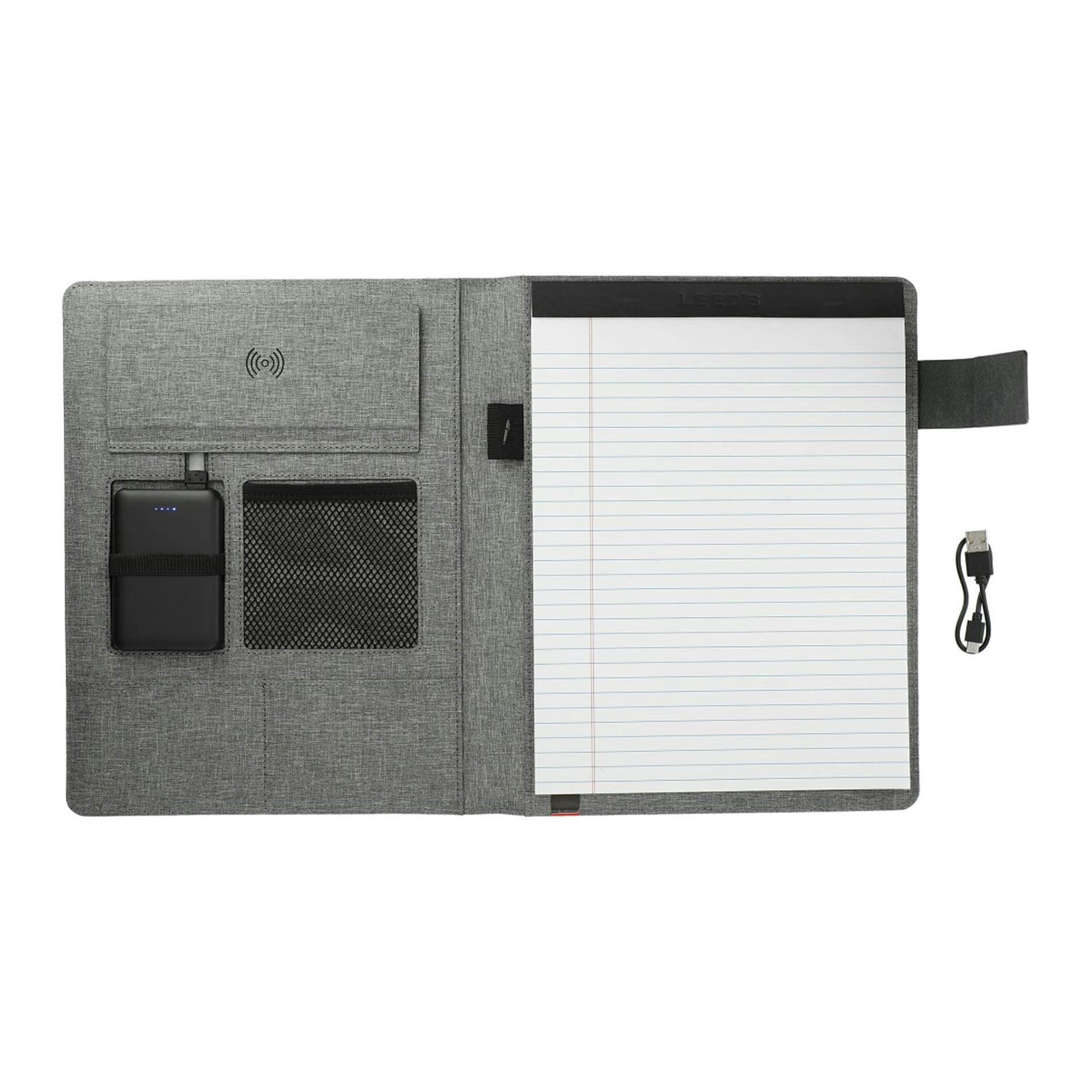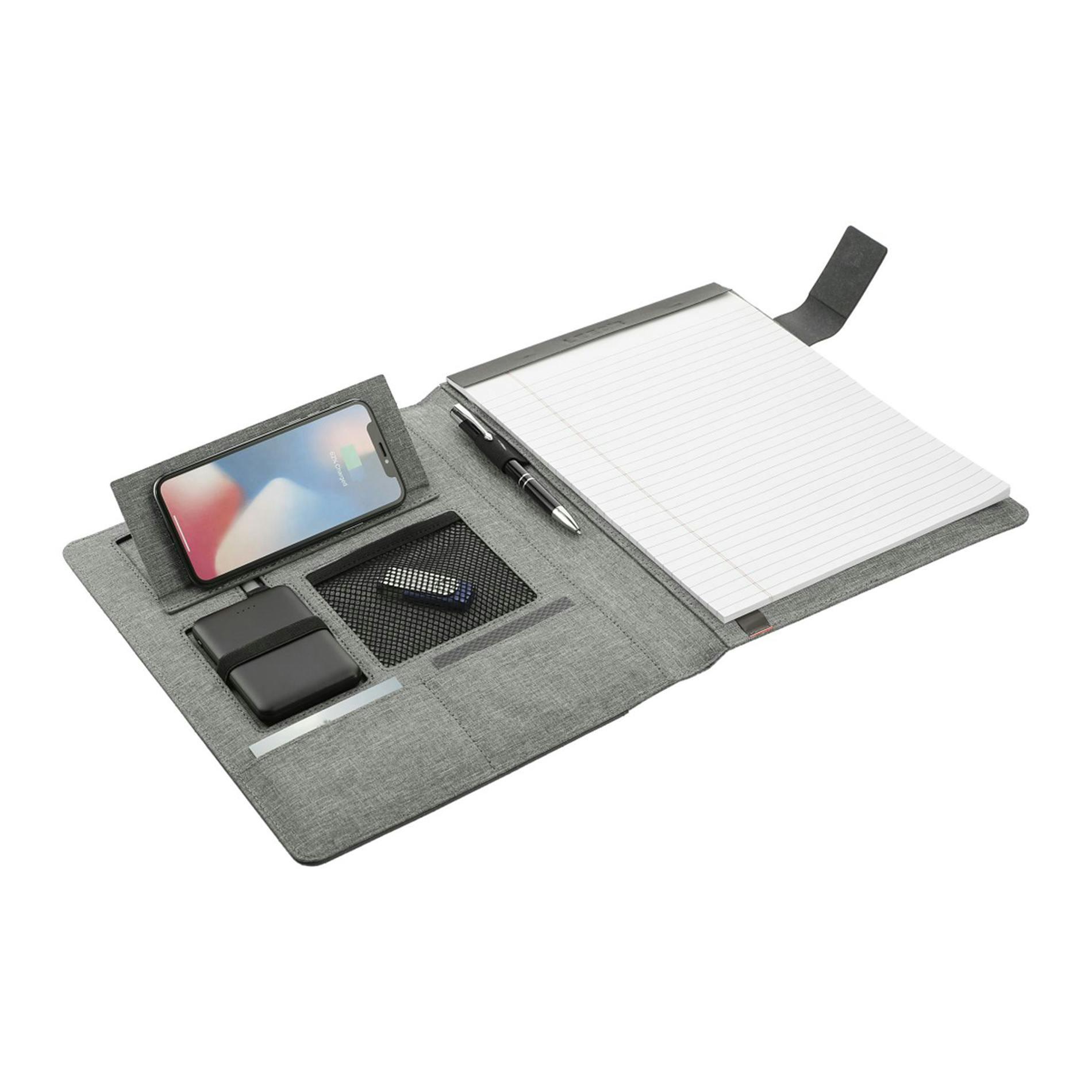 Packed with power allowing you to charge your smartphone without the cables. The removable UL listed, 5000 mAh rechargeable power bank supports wireless charging alongside the pop charging stand at up to 1A for devices including but not limited to iPhone series, Samsung Galaxy Note. If want to charge an iPhone series before iPhone 8 with wireless technology, you will need to connect micro USB charging cable to Powerbank. Front pocket, interior mesh pocket, elastic pen loop and business card pockets. Magnetic closure. Includes 8.5" x 11" writing pad with 30 sheets of recycled lined paper. Includes FSC cardboard gift box, micro to USB cable and instruction manual.