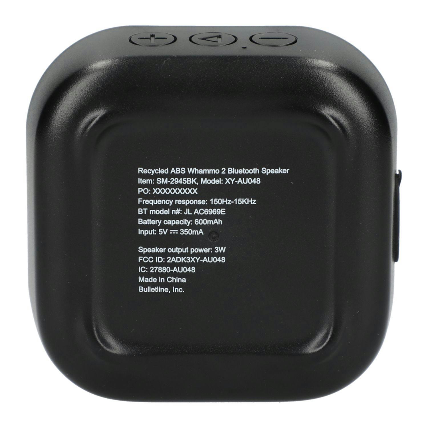 Your favorite speaker is now partially made from recycled ABS plastic. The Whammo 2.0 Bluetooth® Speaker packs quality sound into a compact size. The battery lasts up to four hours at max volume and can be fully charged in three hours. The built-in microphone and music controls let you make or receive calls while controlling the audio. The Bluetooth® working range is 10 meters (33 feet). The speaker output is 3 Watts. The gift box is made from FSC®-certified material.