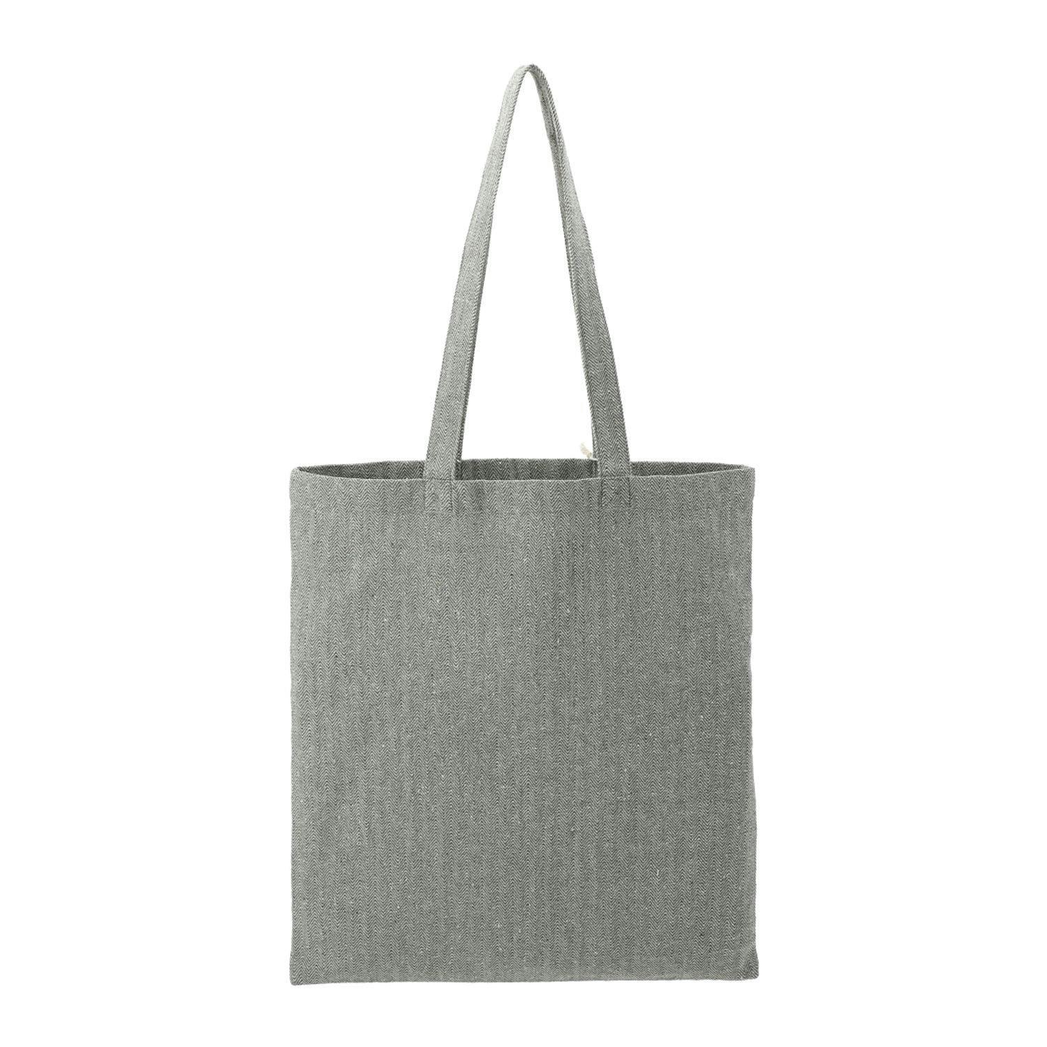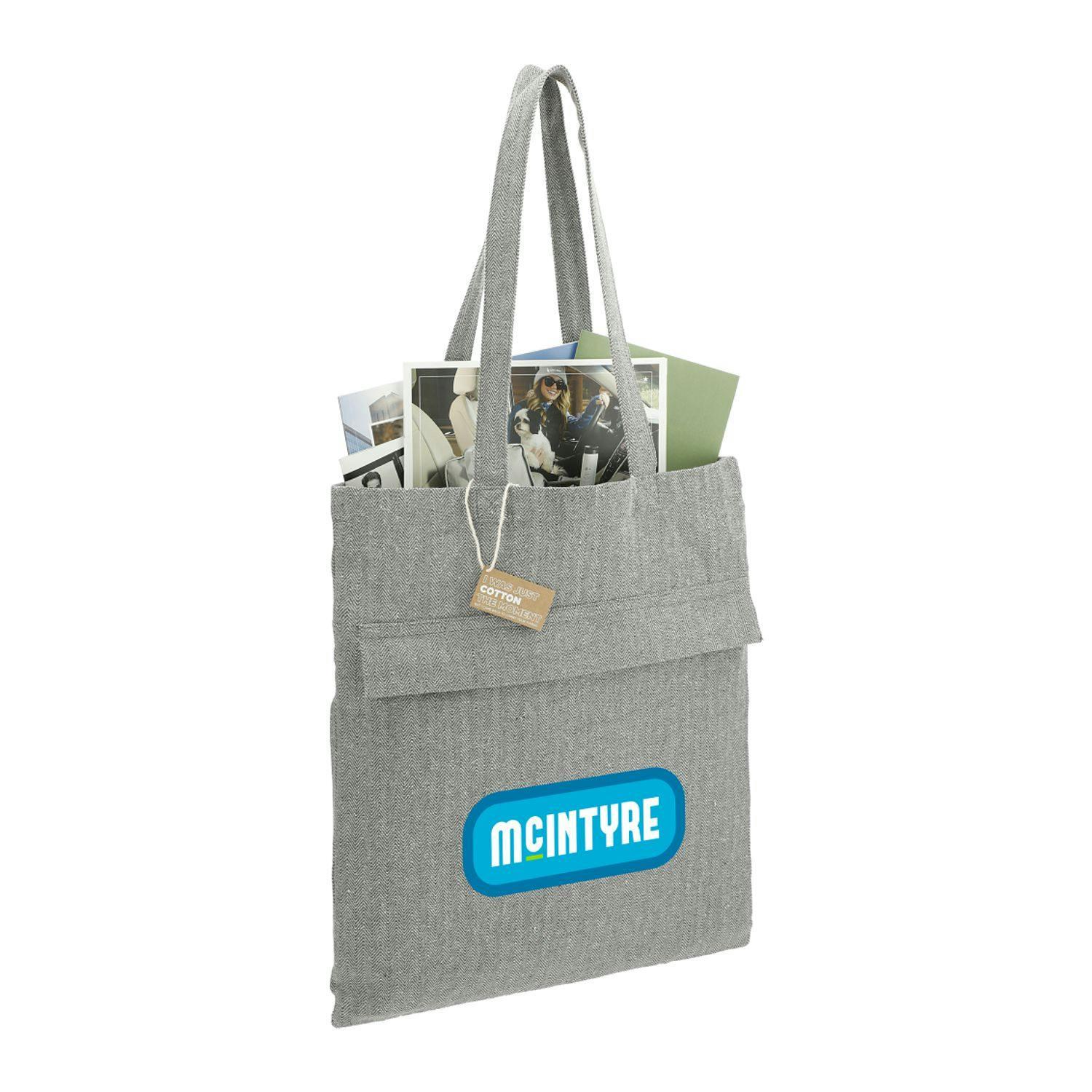 The Recycled Cotton Herringbone Tote w/Zip Pocket is made from pre-consumer recycled cotton. This tote features an open main compartment, a zippered front pocket, and double carry handles. 11" drop handles.