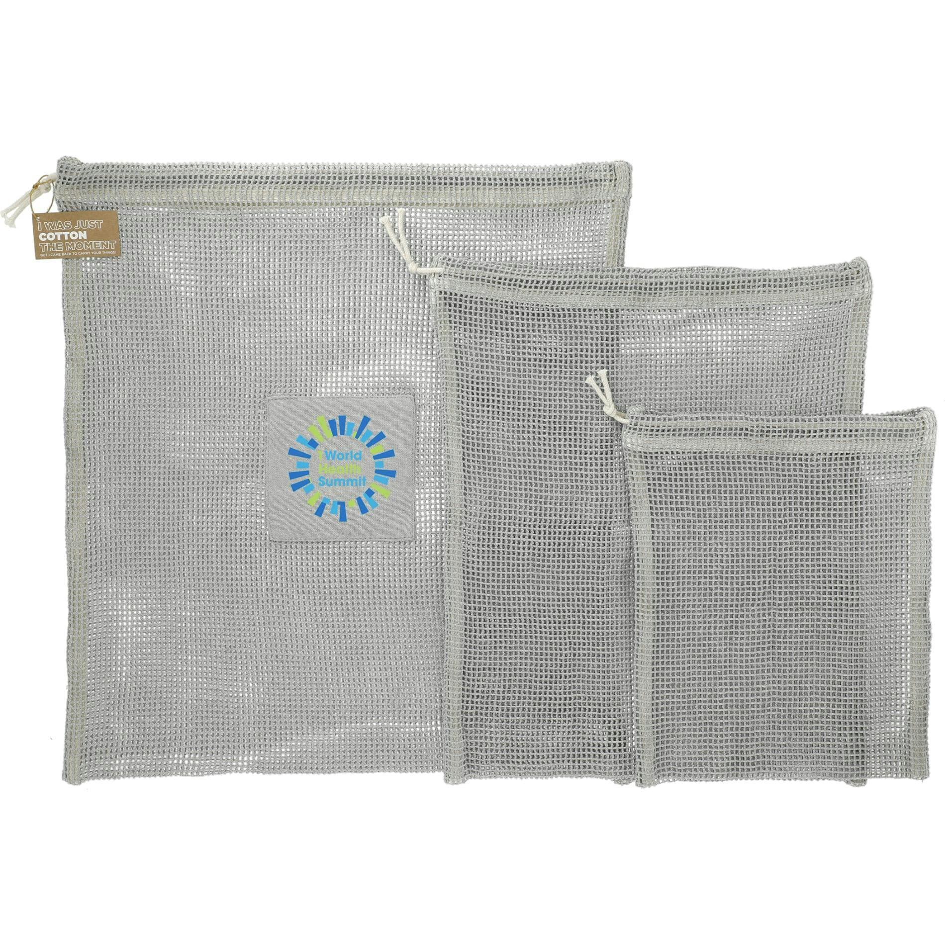 Stay organized sustainably with the Recycled Cotton Mesh Cinch Pouch Set. Perfect for travel, gym, office or giveaways—store toiletries, packaged snacks, charging cables, or dirty laundry with breathable mesh that lets contents stay visible. The oversized pouch (17" H x 15" W) includes two smaller pouches for easy sorting: medium 14" H x 12" W and small 8" H x 10" W. Lightweight, eco-friendly recycled cotton construction makes this cinch pouch set a practical, branded accessory for promotional use.