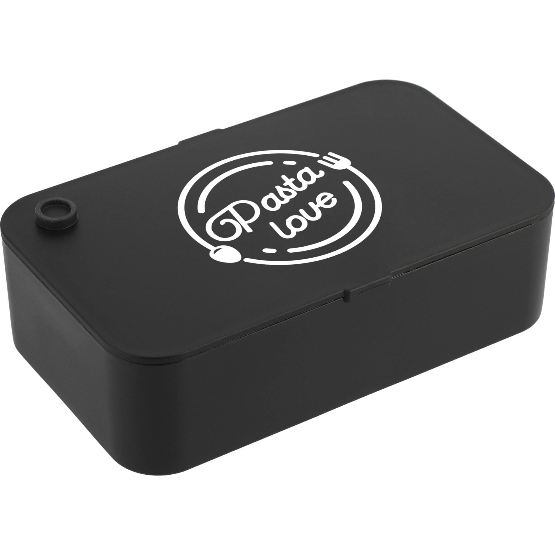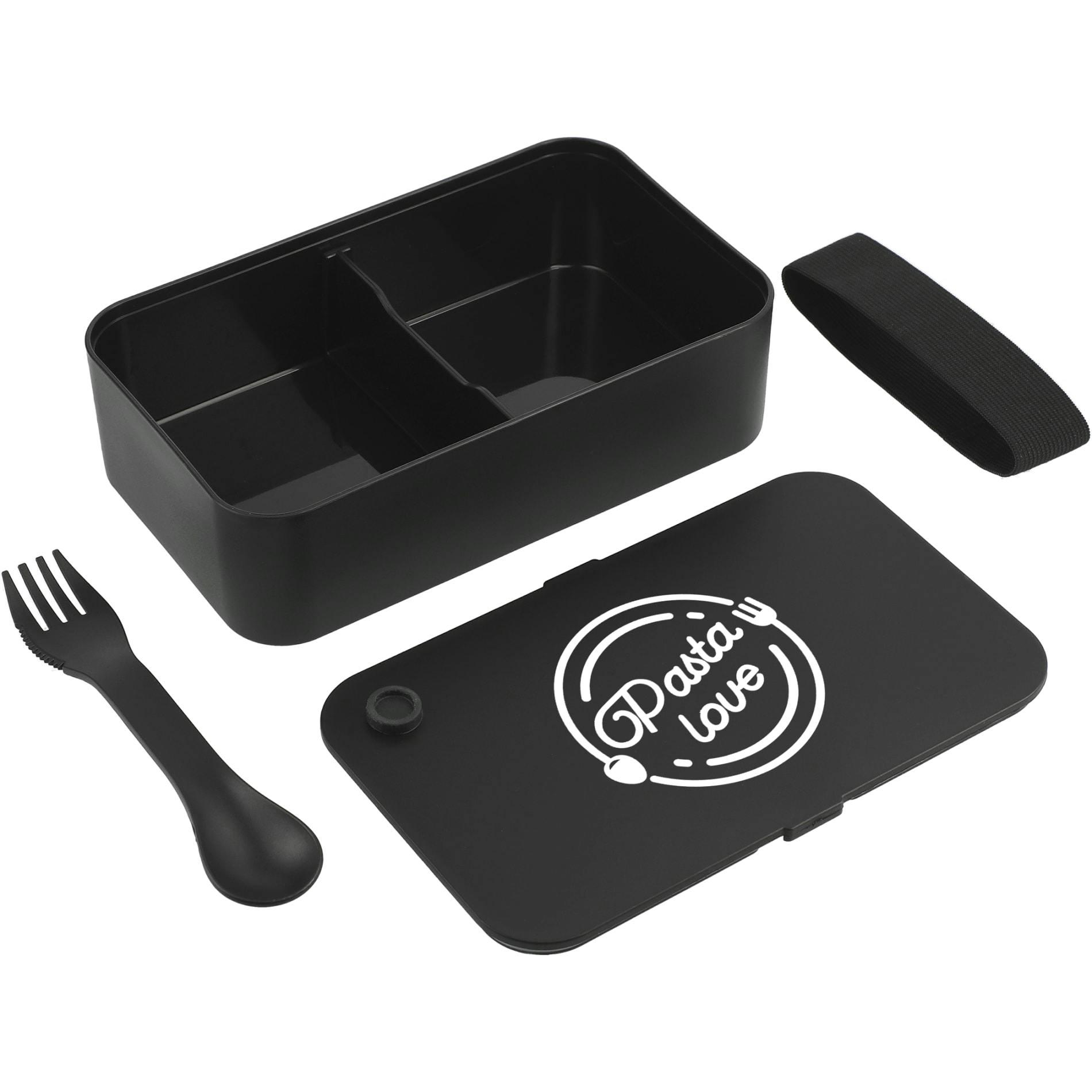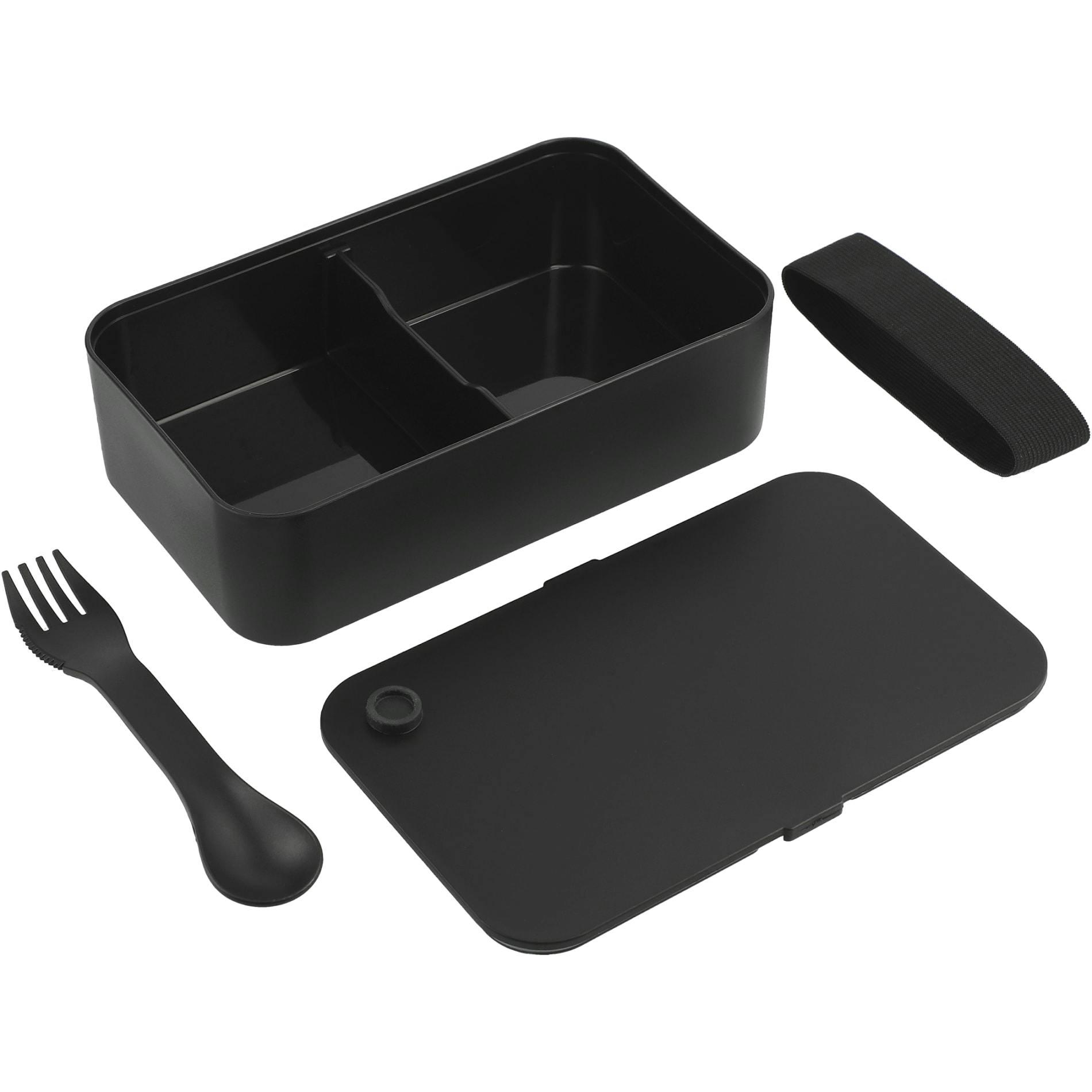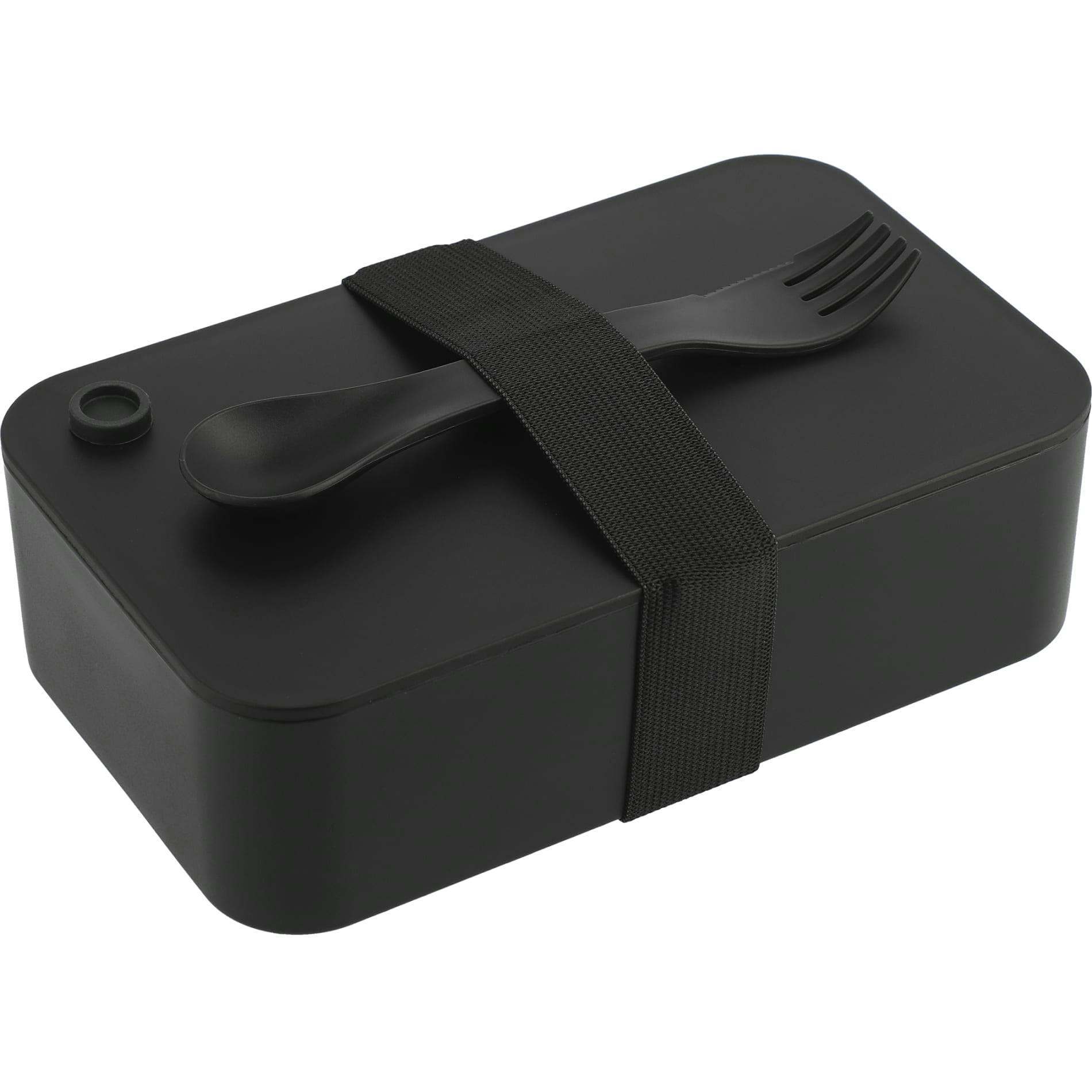 The Recycled Plastic Bento Box includes a fork, spoon, removable divider, and black elastic band to help secure the container tightly together. Capacity is 800ml.