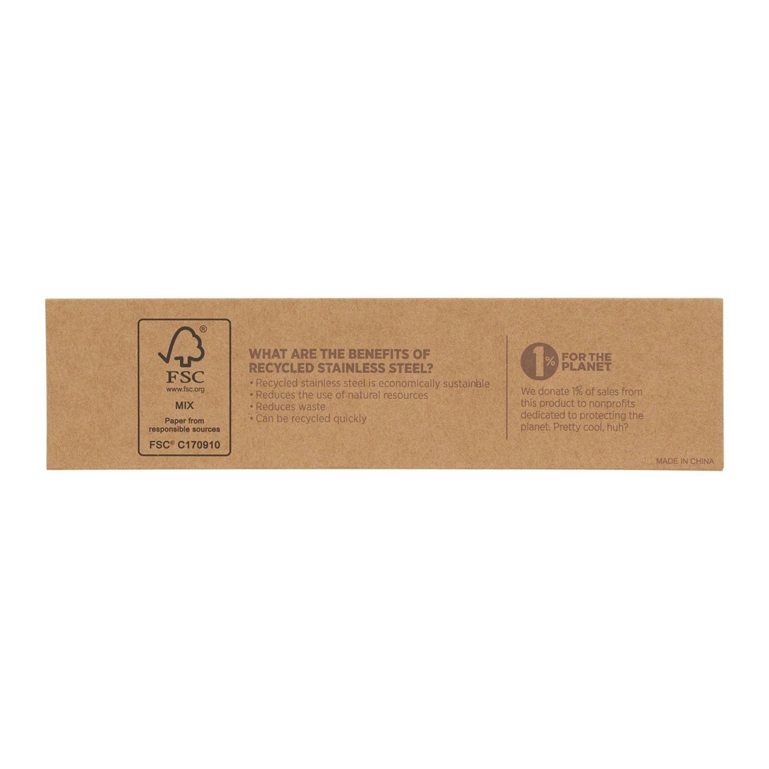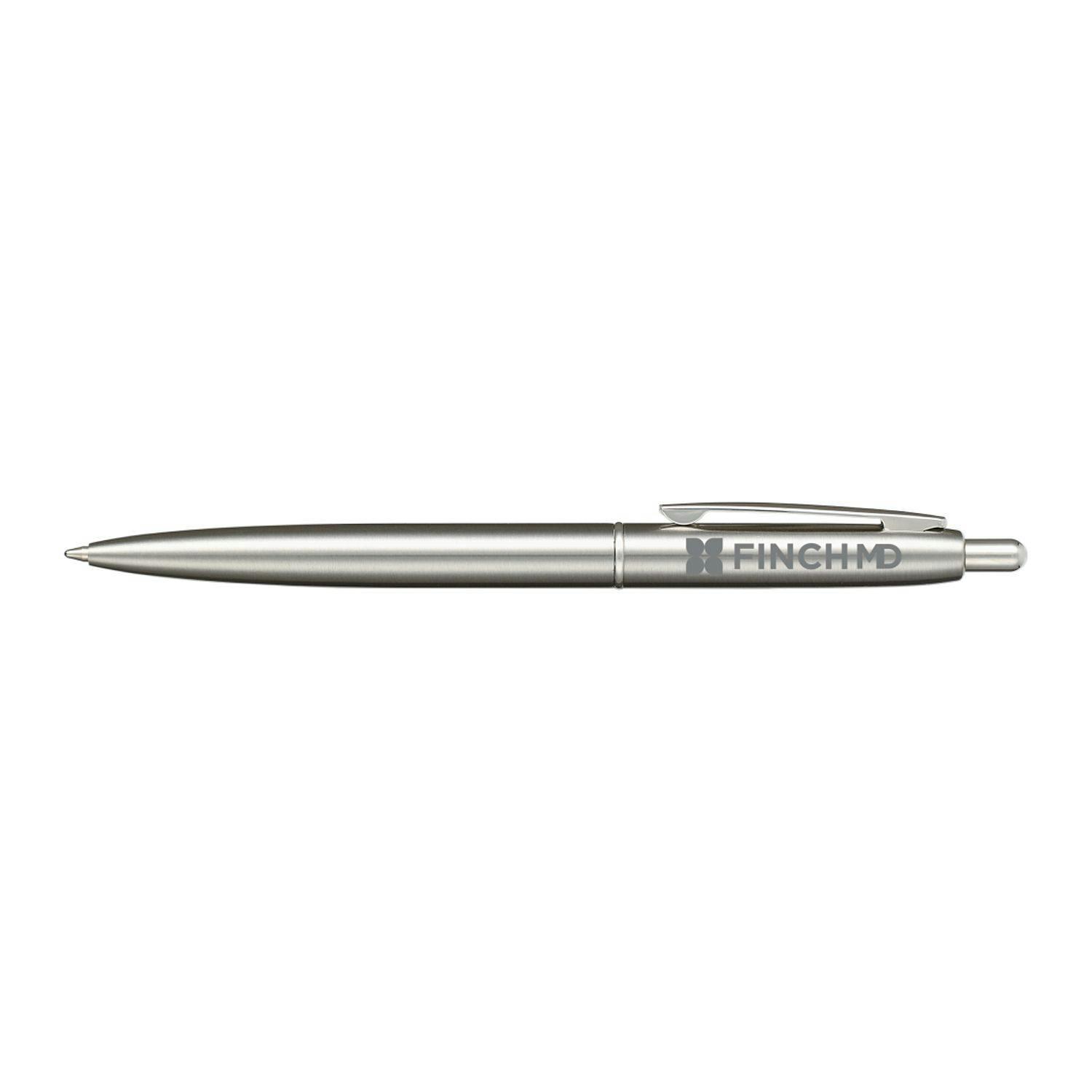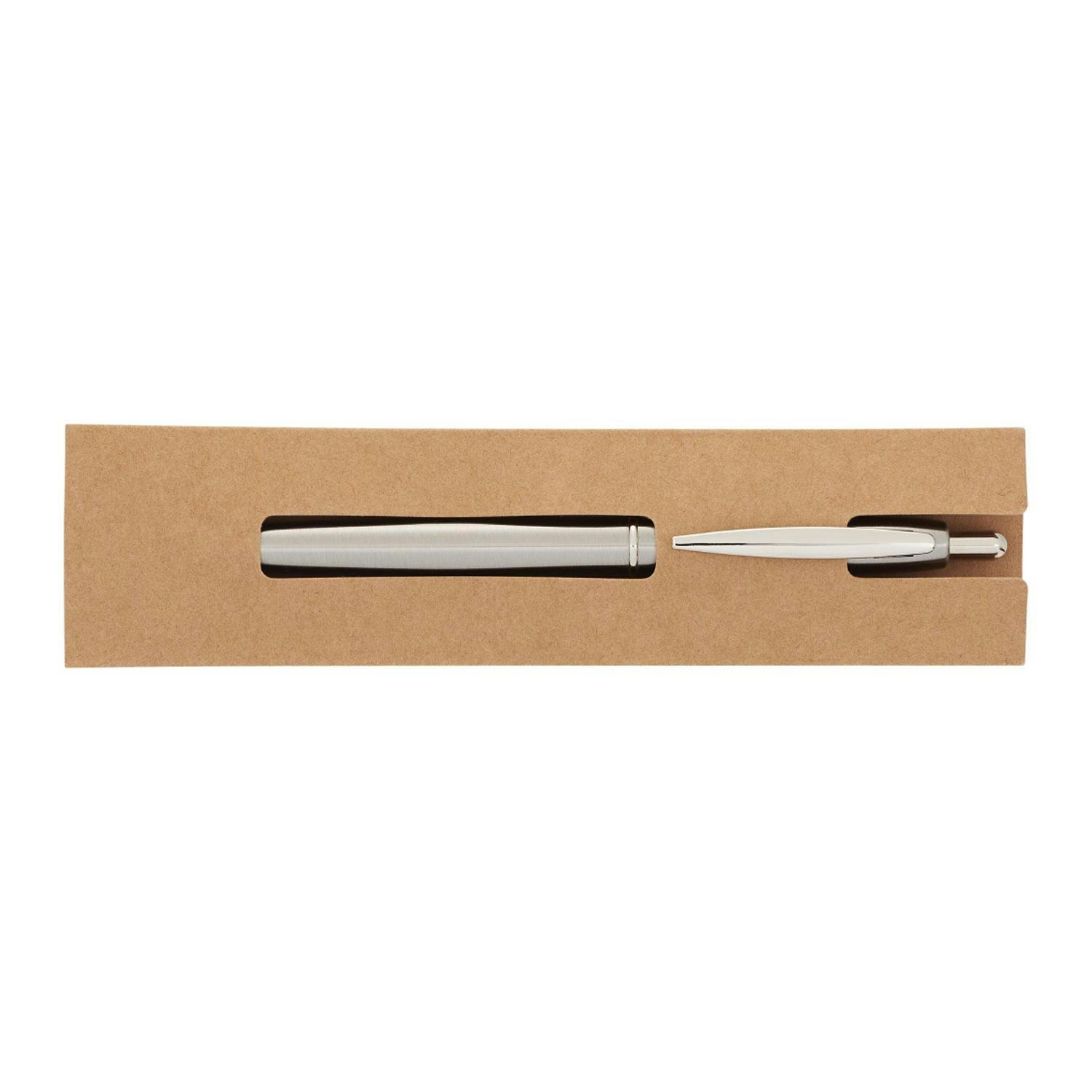 The Recycled Stainless Steel Ballpoint Pen features a recycled stainless steel barrel with shiny chrome accents. 1.0mm tip and smooth black ink with 800m of writing length. Click mechanism.