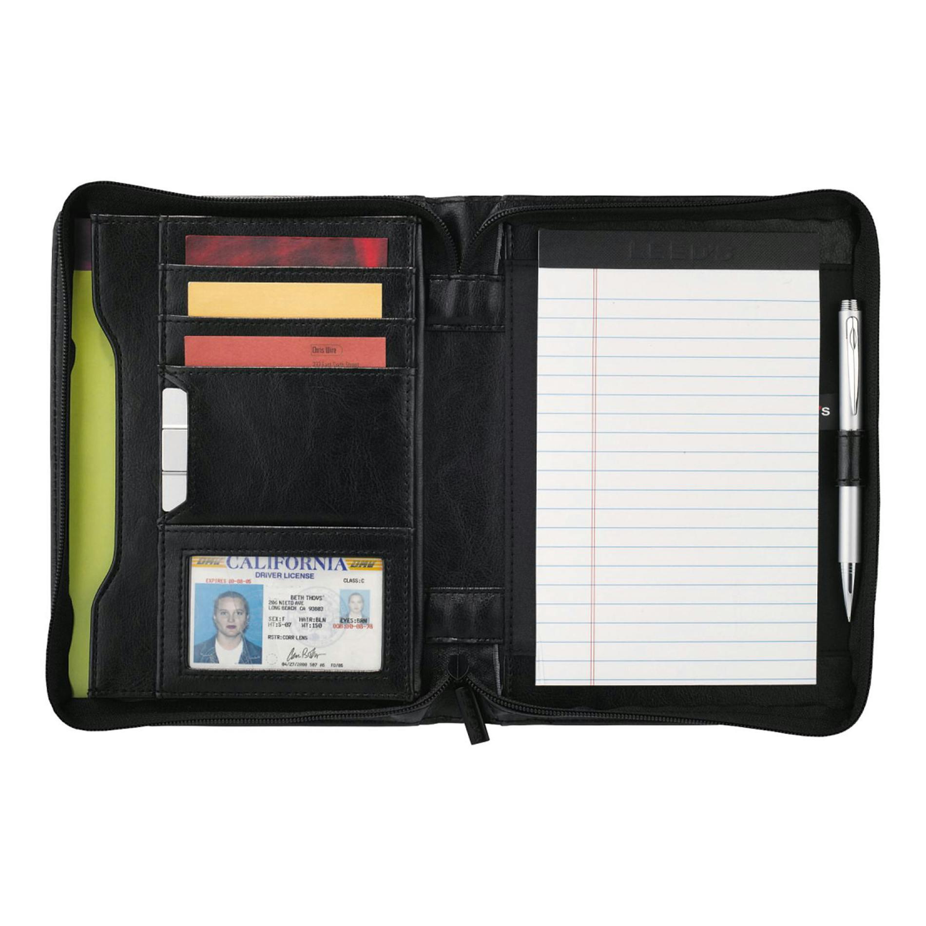 Zippered closure. Interior organizer with gusseted file pocket. Front pocket. 3 business card holders. Pen loop. Clear ID or calculator window. Holds Kindle and Nook products. Includes 5" x 8" writing pad. Refill item # 9091-06RF. Pen not included.