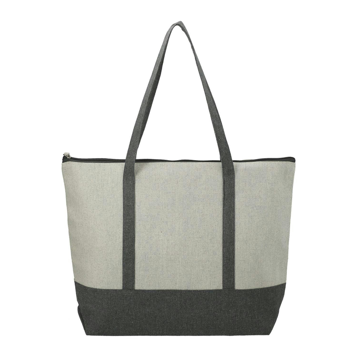 The Small Zippered Recycled Cotton Tote Bag is made from pre-consumer recycled cotton and features on-trend color blocking. It also features double handles, a front slash pocket, and a zippered main compartment.