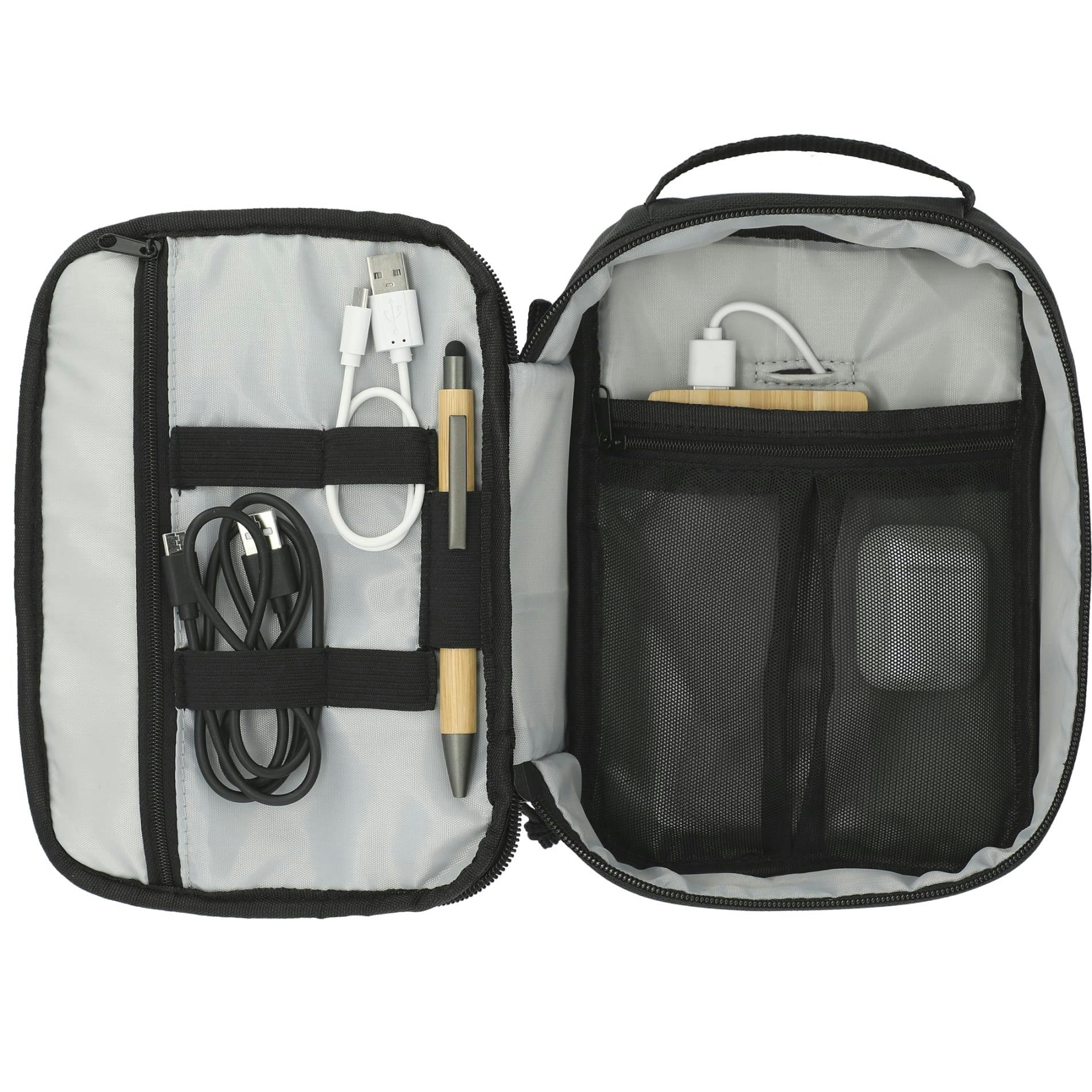 The RPET Tech Organizer is perfect for organizing and transporting power banks, earbuds, and any other electronic accessories. The case includes five elastic loops for storing charging cables and styluses, plus two zippered pockets. It also features a large zippered pocket and a half mesh pocket that’s perfect for earbuds. The slip pocket and cord passthrough let you store a power bank inside the case while your device is charging.