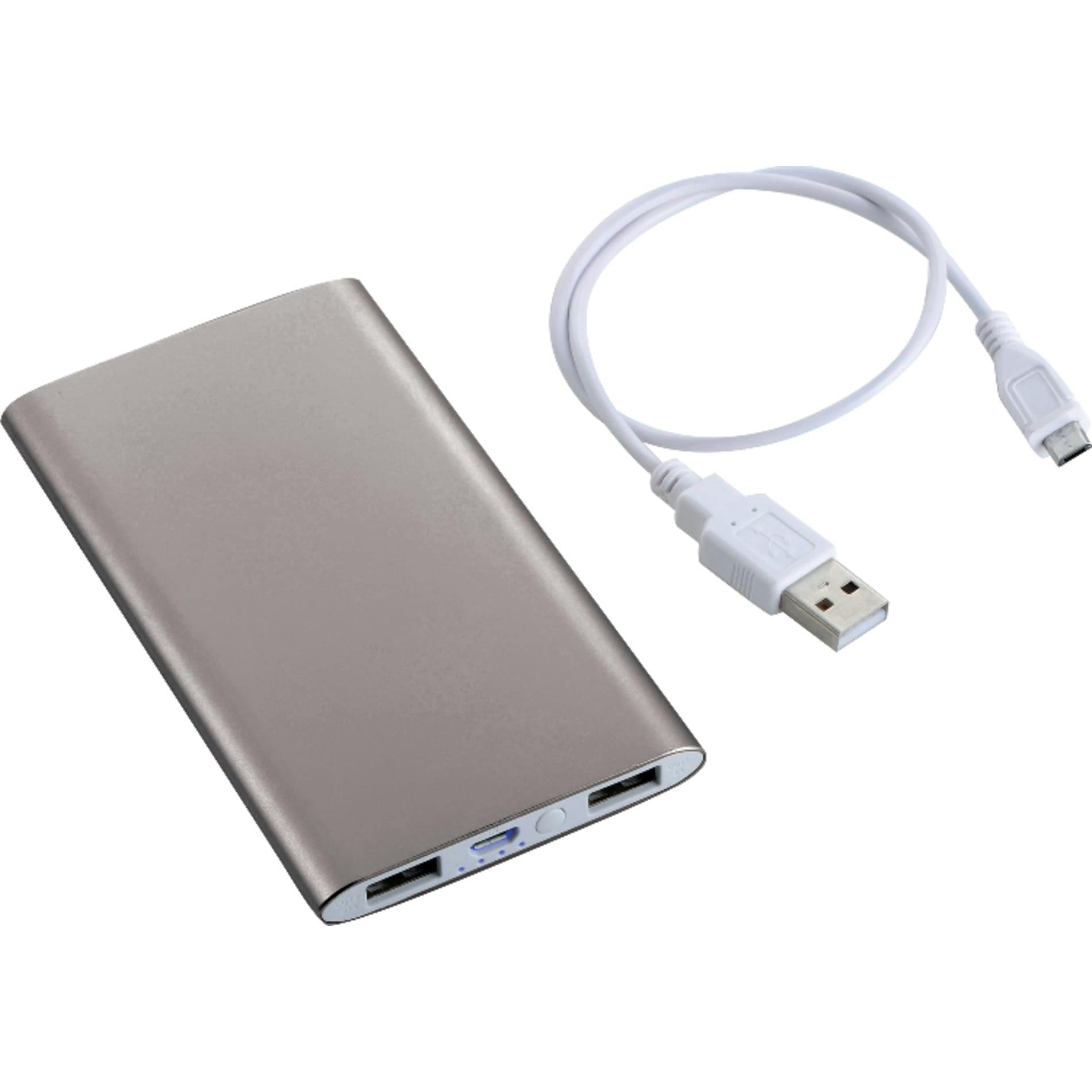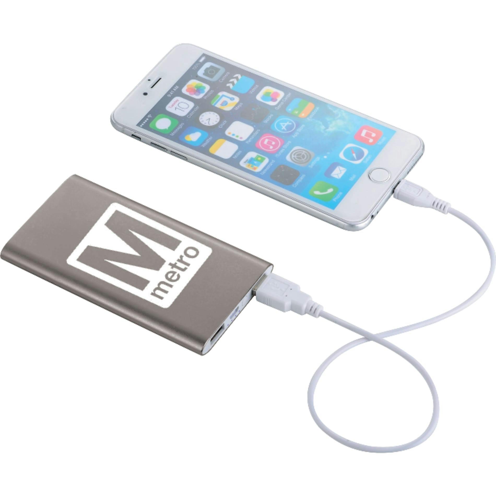The Sleek Aluminum 4,000 mAh Power Bank has a rechargeable lithium polymer Grade A battery (14.8Wh) with enough power to charge smartphones, MP3 players and tablets with a total output of 5V/2A. The dual output lets you charge two devices simultaneously. It also includes a battery check button to ensure that you know how much battery life is left. The reusable power bank charges via USB-A to Micro cable (included), which can recharge the battery backup or other devices with a micro-USB input, like Android™ smartphones from Samsung®, Motorola®, HTC®, Nokia® and others. Input: 5V/1000mA. Output 1:5V/2000mA; Output 2:5V/1000mA. Power banks are permitted in carry-on luggage only, and at the discretion of TSA agents. Please charge power bank before initial use.