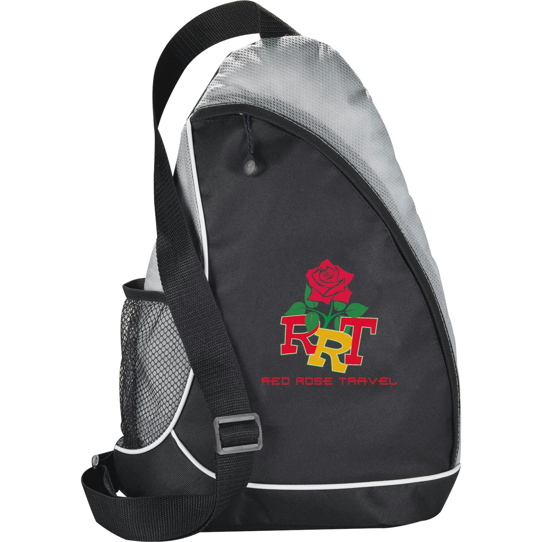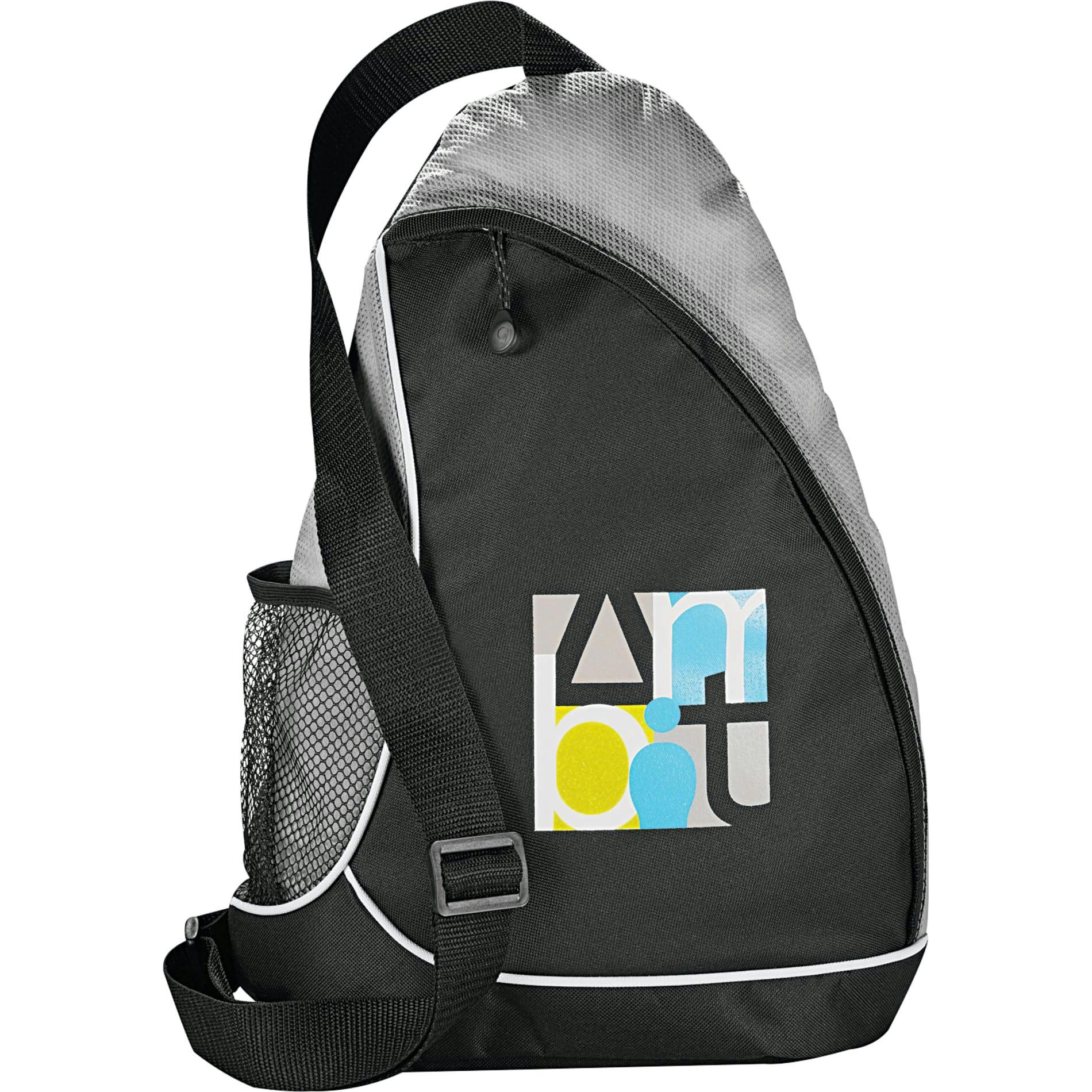 The Sling Shot Sling Backpack features a main zippered compartment, a side mesh water bottle pocket and an adjustable cross-over shoulder strap.