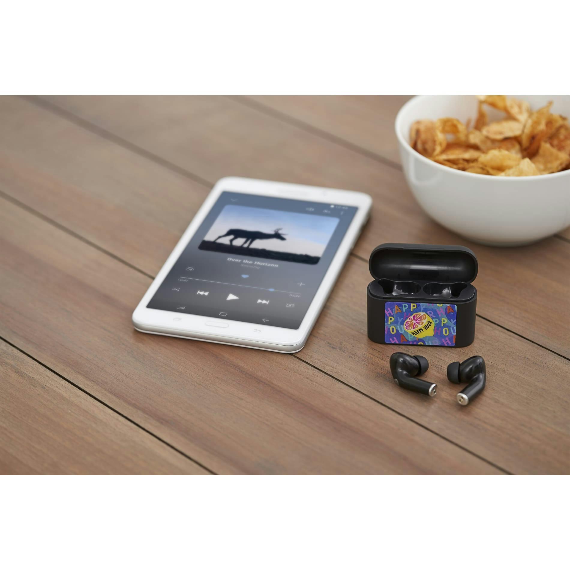 The tempered glass on the surface offers a vivid customized look for these True Wireless Earbuds. Once the True Wireless Earbuds are removed from the charging case they automatically power on and pair to each other! Once connected the earbuds will provide 4hrs of premium sounding audio at max volume! With built in touch controls all you need to do is tap the earbud to accept a call or change the audio. The built in microphones allows for a crystal clear call. The charging case will charge the True Wireless Earbuds 5x from 0 to 100%. It takes 1.5hrs to charge the earbuds. It takes 2.5hrs to charge the case. Type Charging Cable, Small, Medium, and Large get ear tips are included.