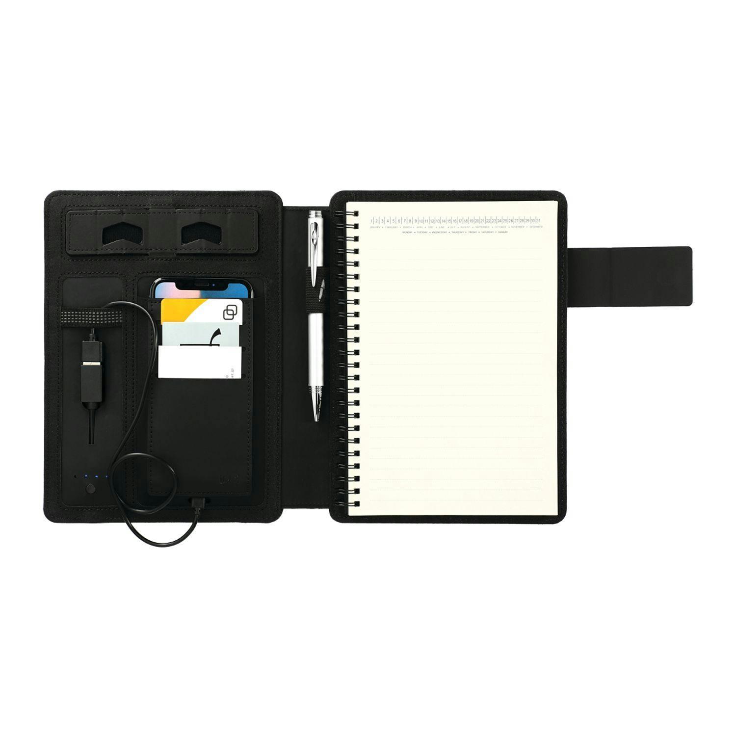 With a built-in 5,000 mAh power bank, this refillable journal offers wireless-charging capability, too. Supports wireless charging up to 1A for: iPhone 8/8Plus/X/XS/XS Max/XR/11/11 Pro/11 Pro Max *Samsung Galaxy Note5/S6/S6 Edge/S6 Edge+/S7/S7 Edge/S8/S8+/S9/S9+/Note 9 * Google Nexus 5/6/7 * HTC Droid DNA, 8X * LG G3/G4, Lucid 2/3 * Nokia Lumia 920/930 *.Power bank includes USB port for wired charging. Magnetic closure journal features phone pocket, built-in phone stand and elastic pen loop, while 5.5" X 8.5" bound notebook includes 64 sheets of cream-colored lined paper.