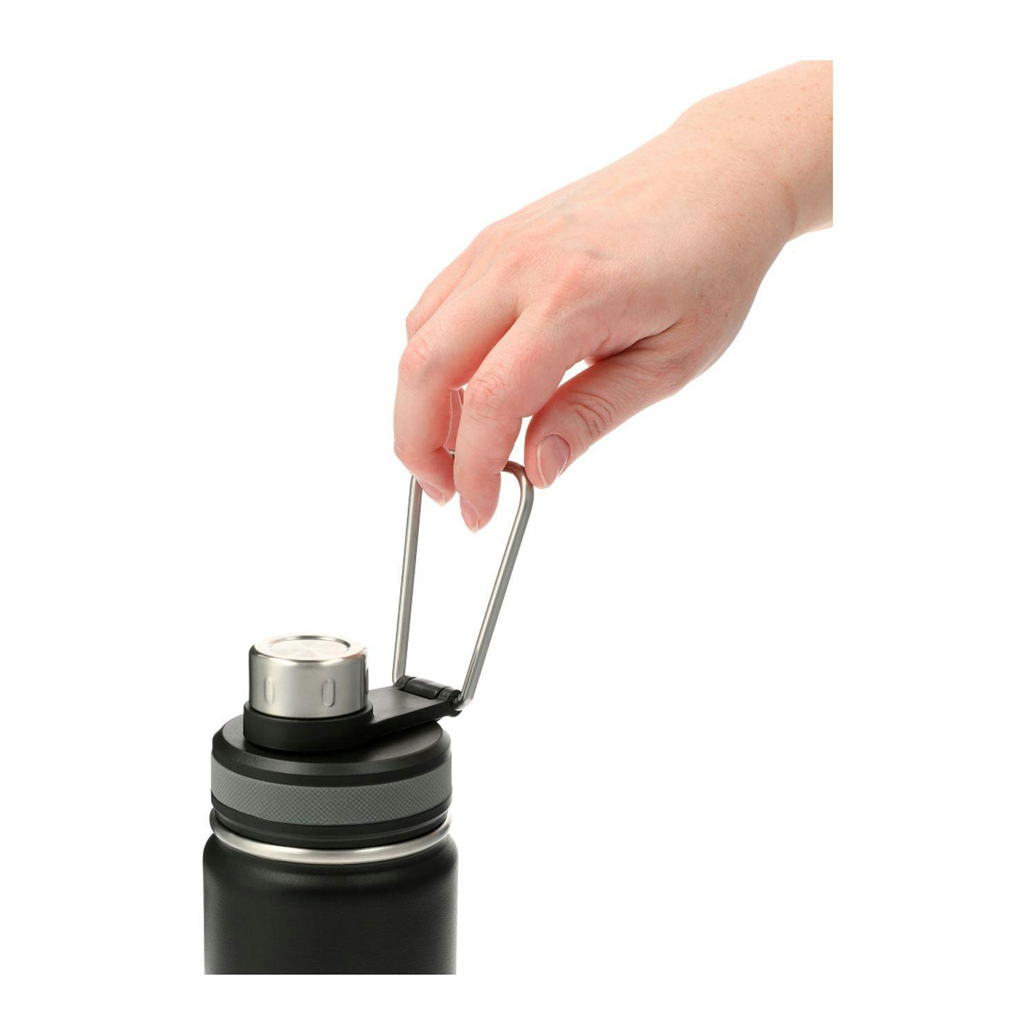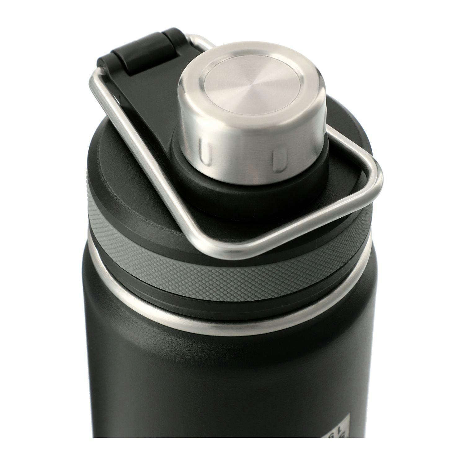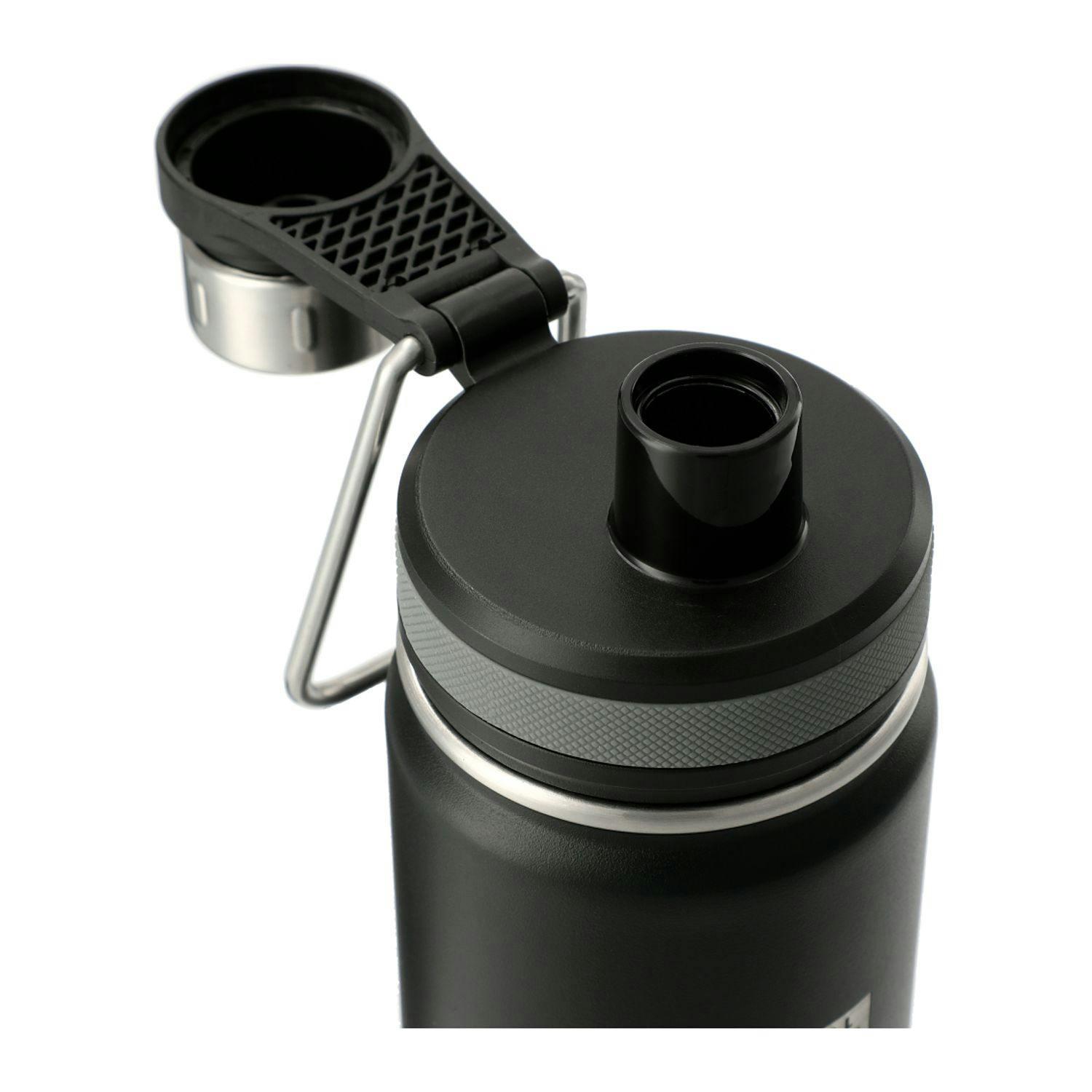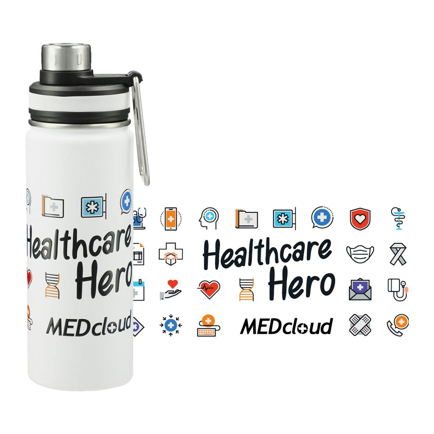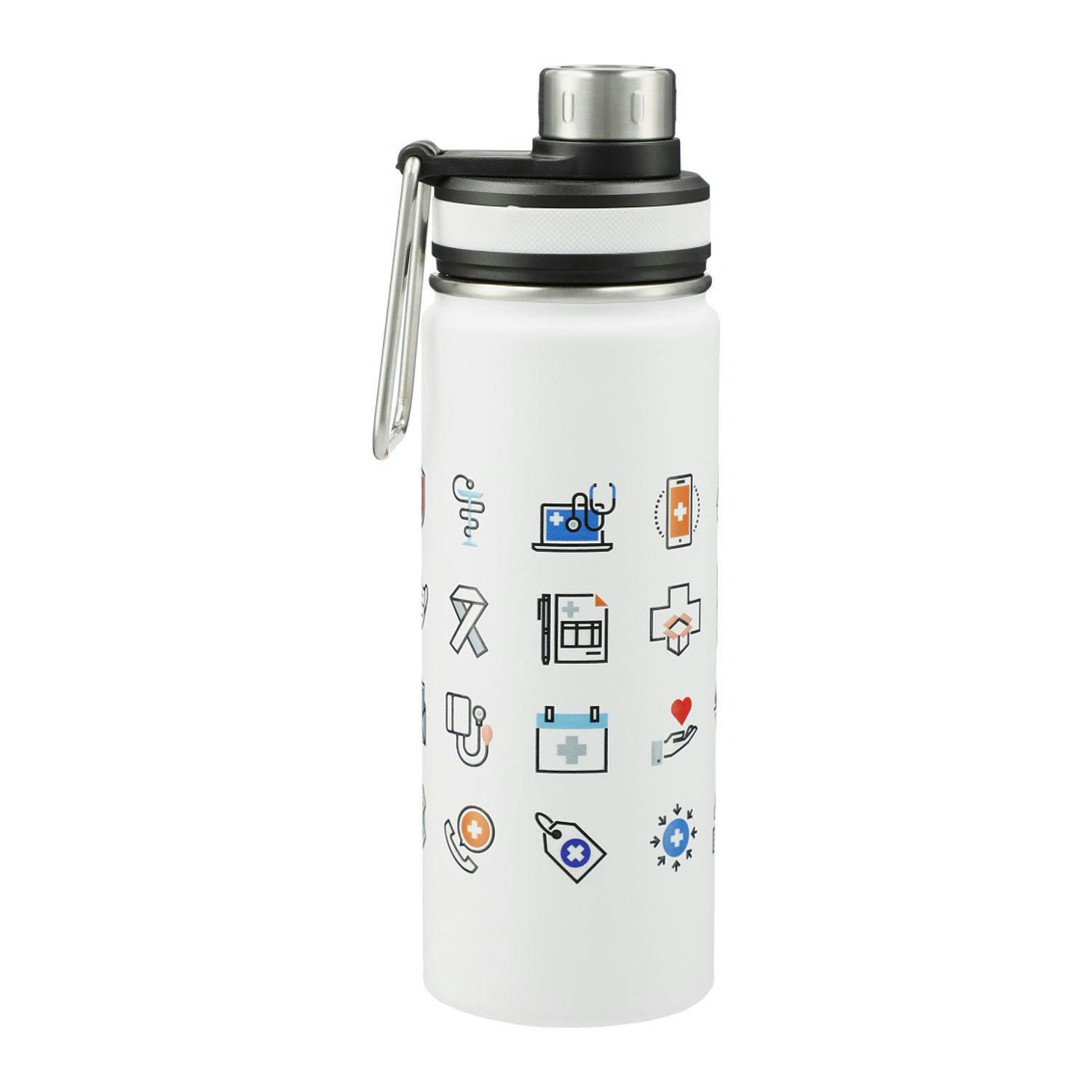 Durable, double-wall, stainless steel vacuum construction with copper insulation, which allows your beverage to stay cold for 48 hours and hot for at least 12 hours. The construction of these water bottles also prevents condensation on the outside. On-trend, durable powder coating. Dual opening, screw-on, stainless steel cap on the main lid with silicone band. Also features a built-in, durable, metal handling loop. Wide opening for comfortable filling and pouring. Perfect for ice cubes. Fits most standard car cup holders. 20oz.