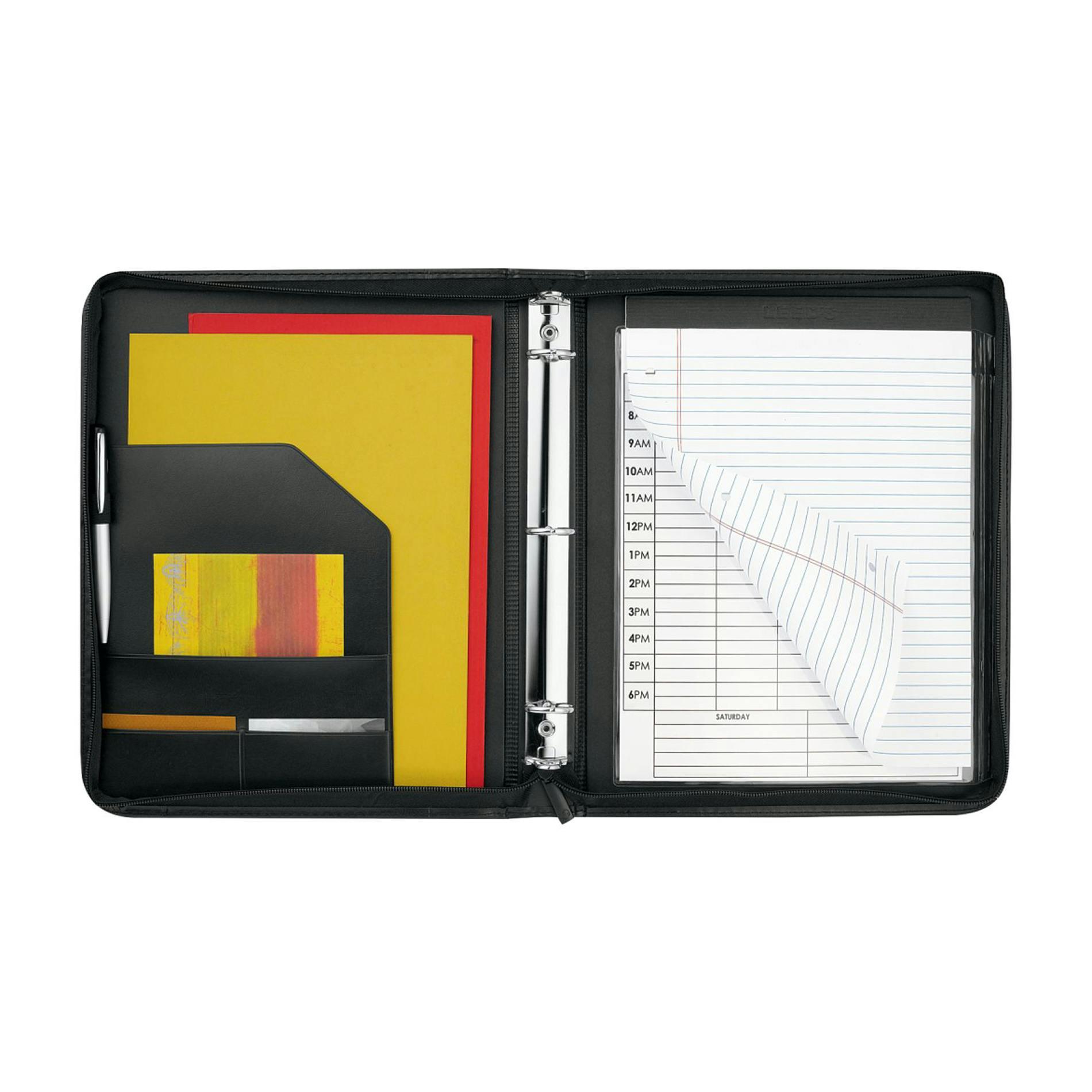 Zippered closure. Elastic pen loop. 2 document pockets. 2 business card holders. Interior organizer with 1" three-ring binder. Clear calendar management pocket that doubles as a page marker. Comes with undated calendar insert. Includes 8.5" x 11" writing pad. Refill item # 9091-01RF.