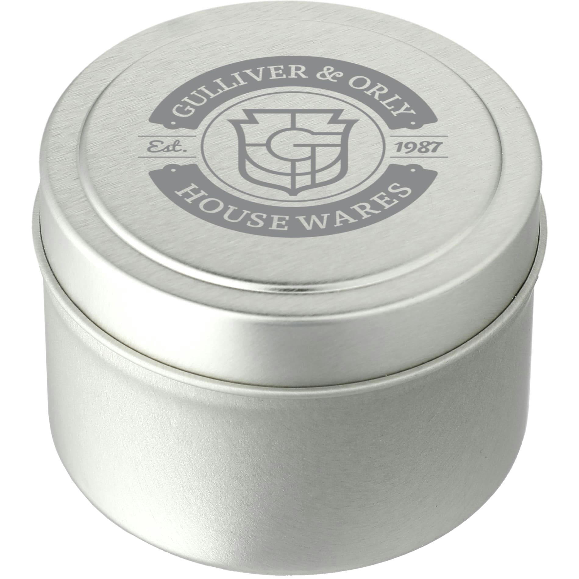 Zen Tea 2.7oz Mini Tin Candle — a travel-size, food-grade soy wax candle with a single cotton wick and about 23 hours of clean, even burn. Phthalate- and lead-free for safer scenting, it blends juicy citrus with green floral and sweet fig notes. Ideal as a promotional gift, spa amenity, wedding favor or travel candle.