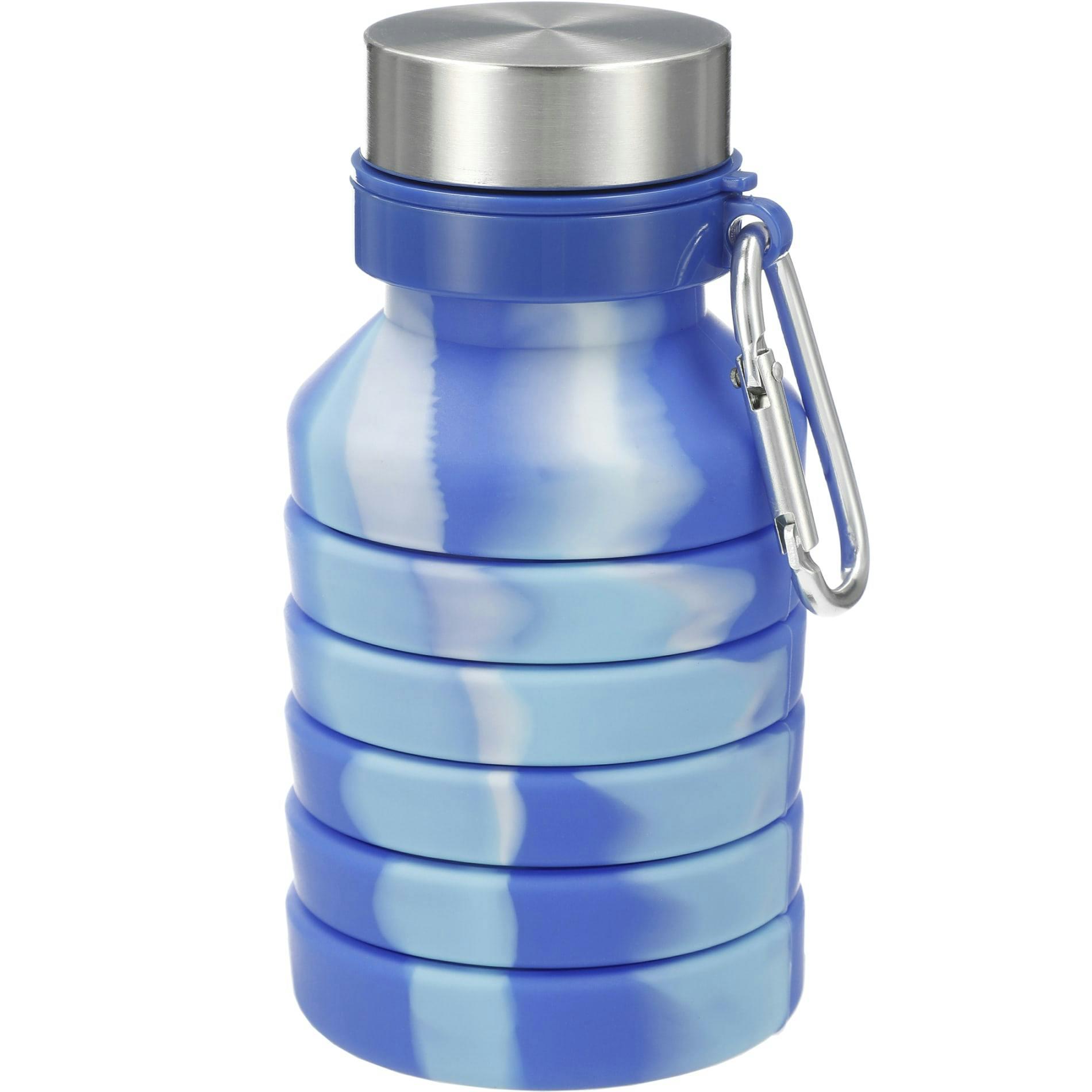 The special Zigoo Bottle features on-trend tie-dye look. The collapsible and lightweight design helps you save 50% of space. It's portable and easy to store. It reserves 18oz liquid with only 198g in weight and it can collapse from 9.2inch to 5.45 inch in height. Bottle is made from food grade silicone including a stainless steel lid with carabiner attached. It is leakproof and is great for all types of activities and sports. Only the water bottle (not the lid) is dishwasher safe for easy cleaning and is designed with a wide mouth opening for filling ice cubes. Includes matching carabiner. BPA Free. 18oz. Due to the nature of the unique tie-dye technique, bottles will be similar, but not identical. Dye variation is a natural part of the process and in no way construed as a defective product. “The placement of the carabiner will vary in relation to the imprint on the lid”.