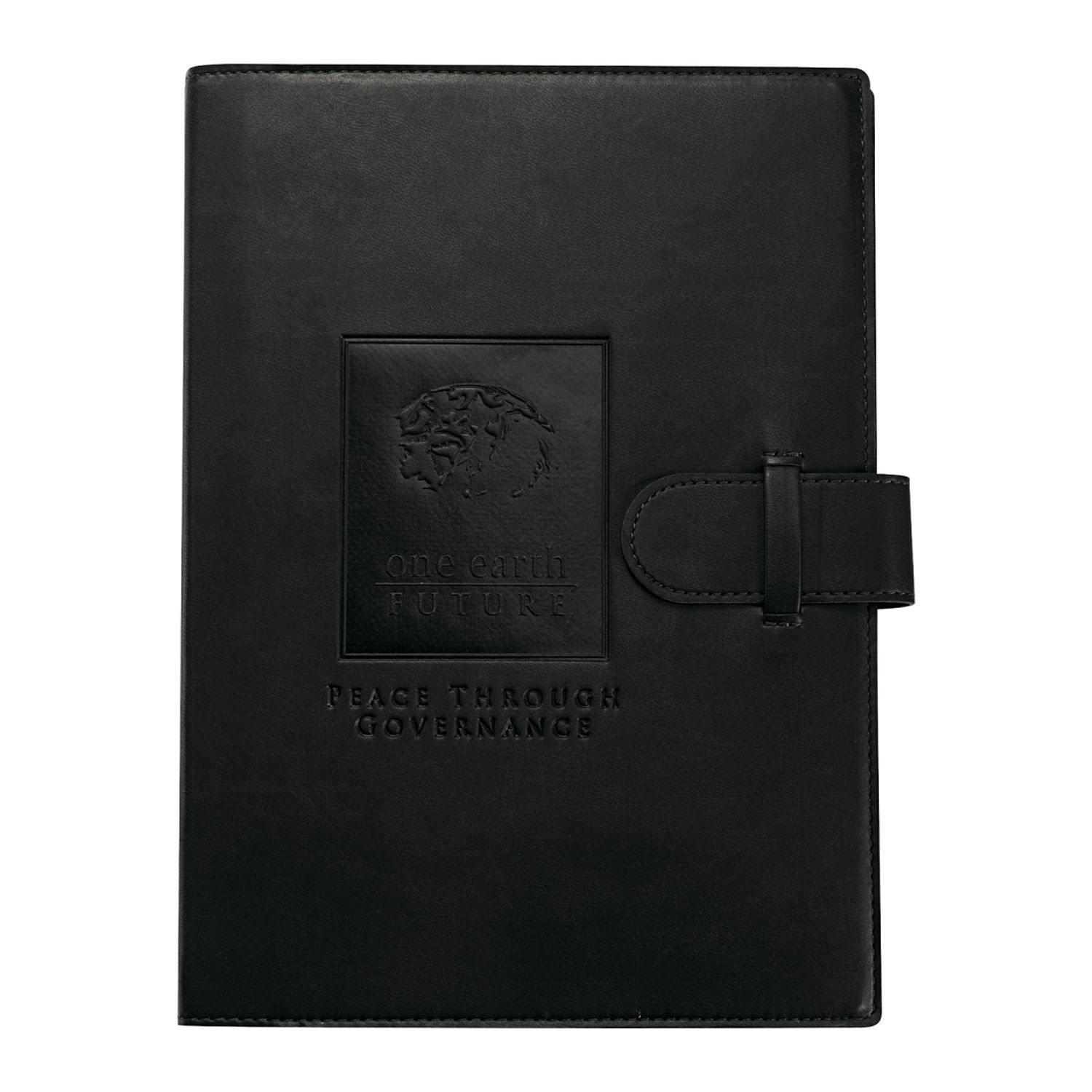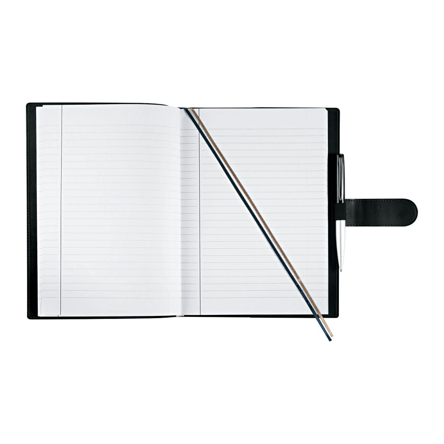 The 7" x 10" Dovana™ Large JournalBook® features an elastic pen loop, tab and loop closure, and blue and silver ribbon page markers. Business card slot. 128 ivory sheet lined JournalBooks® refill. Pen is not included.