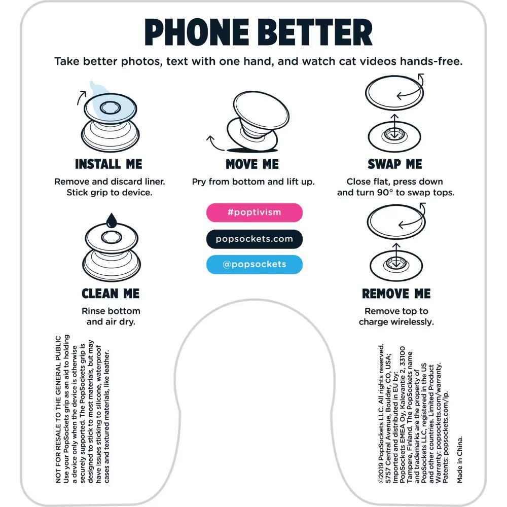 The Pop Swappable makes it easy to remove the Pop Top from the base to charge your phone wirelessly. Like a classic PopGrip, the Pop Swappable sticks' to the back of your phone with a repositionable gel. Once extended, it becomes a media stand and grip, making it easier to text with one hand, snap photos, and watch videos hands-free.