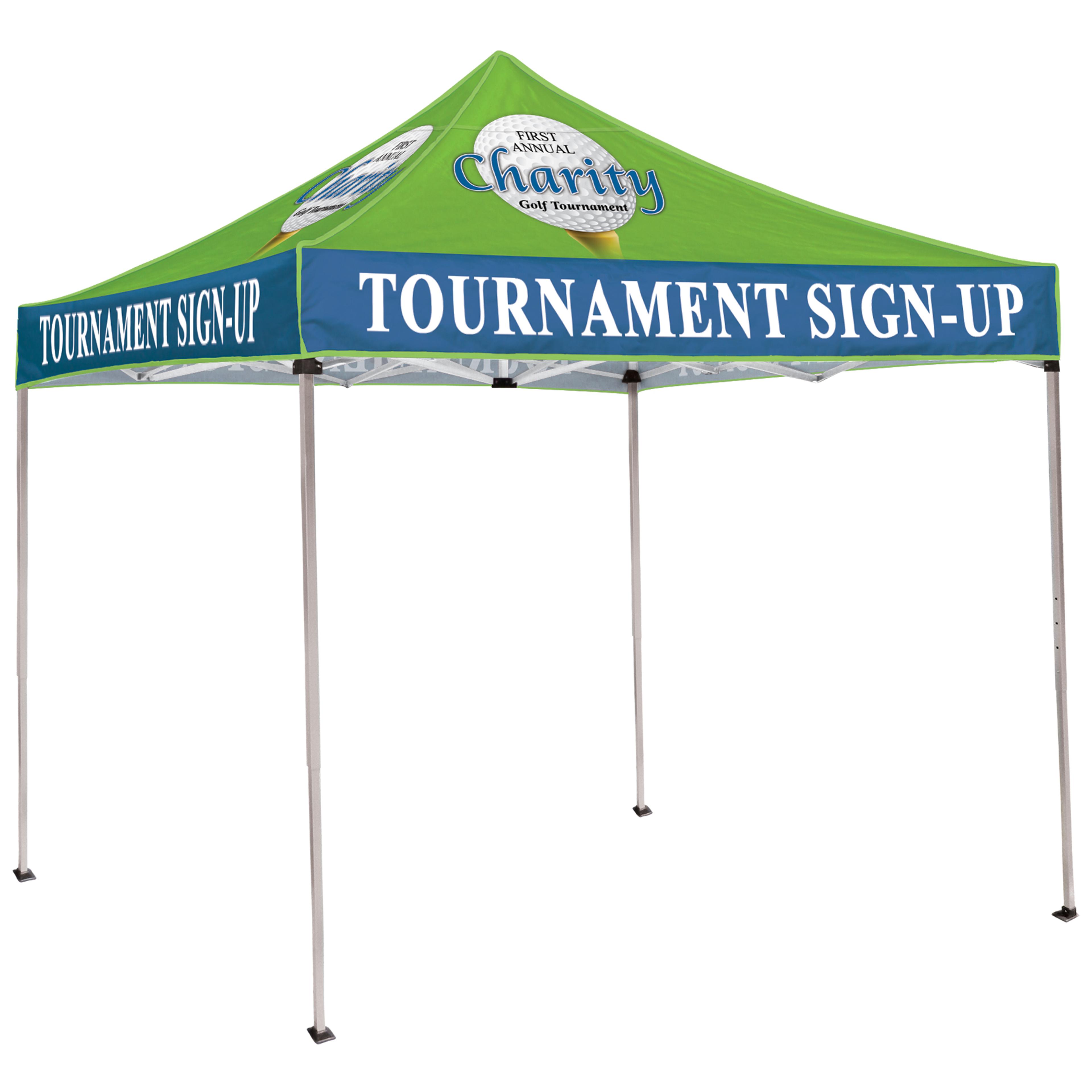 Why buy this 10' Square Canopy Tent from Quinn? Because it offers full color digital printing on all valances and peaks with no additional or set-up charges! Made from 600 denier polyester material, this tent is perfect for trade shows, tailgating, festivals, fairs, fundraising events and more. Includes aluminum pole frame, canopy, stake and rope kit, and carrying case with wheels for easy travel and set-up. Tent kits with wall options available. Weights to secure frame are not included. Shipping quoted upon request.